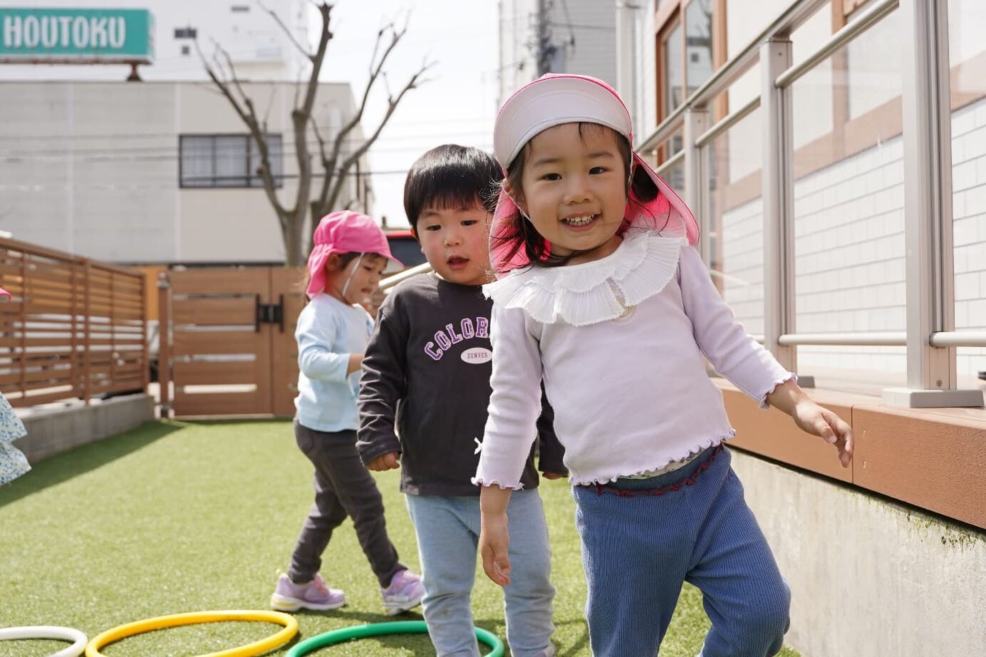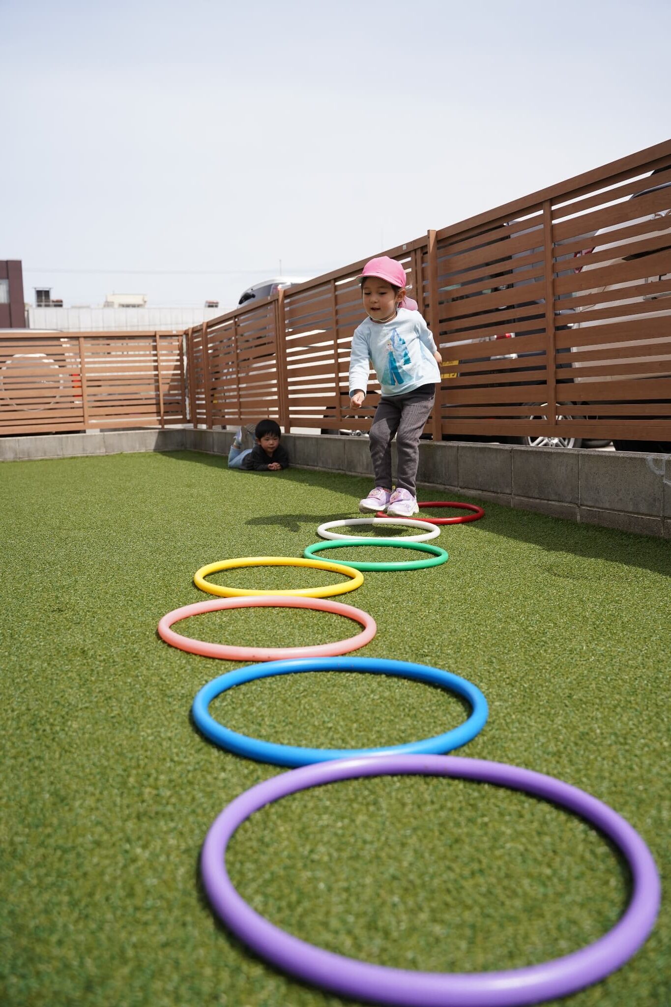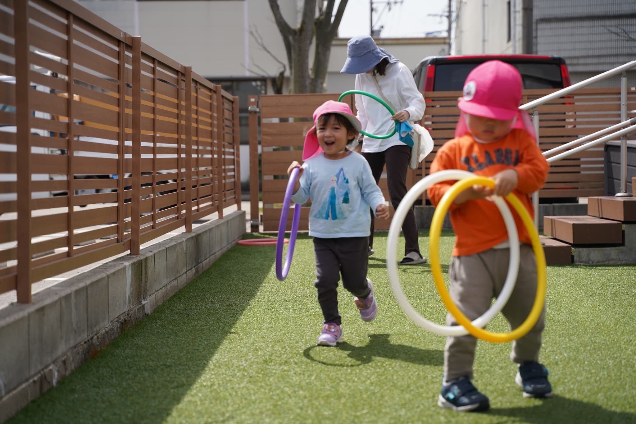 肩にかけたり、両手でもったり、転がしてみたりとフープの動きを楽しむもも組のお友だちでした。