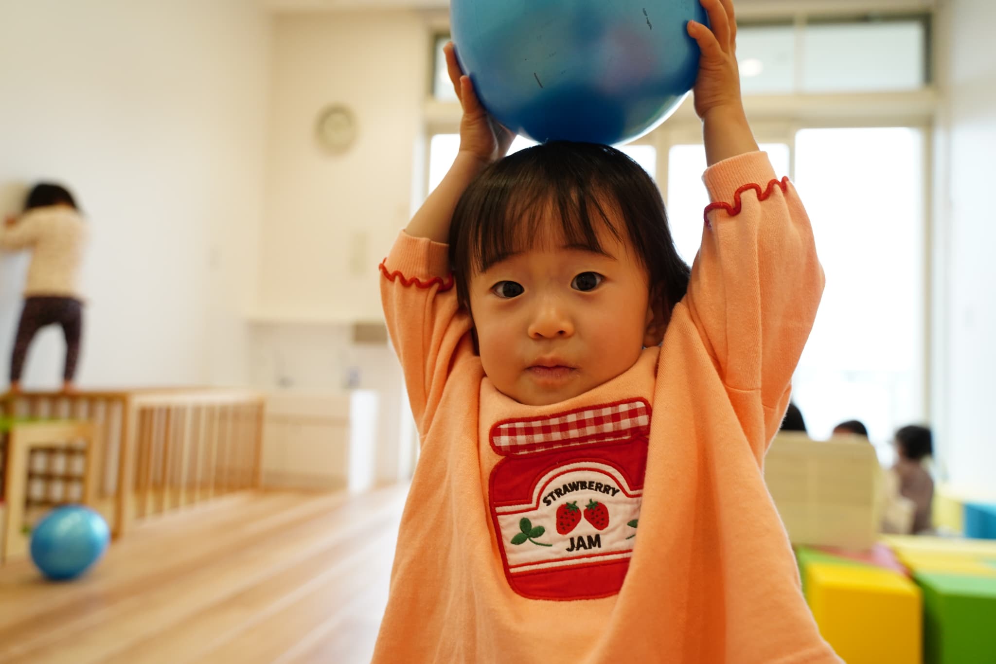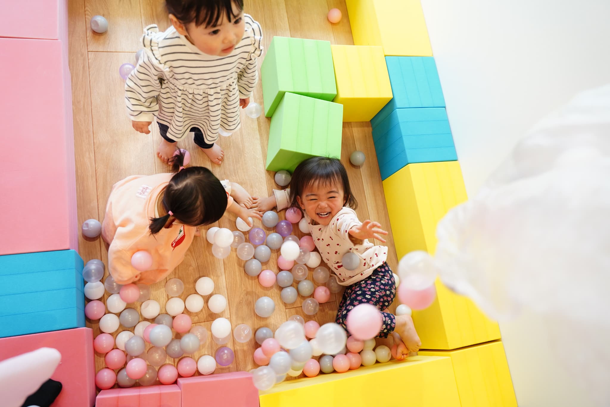 ボールの雨が降ってくると、「キャーッ!😆💕」と大喜びの子どもたち!頭や体にポコポコと当たるのが楽しくて、「もっかい!」とリクエストする子もいましたよ😊