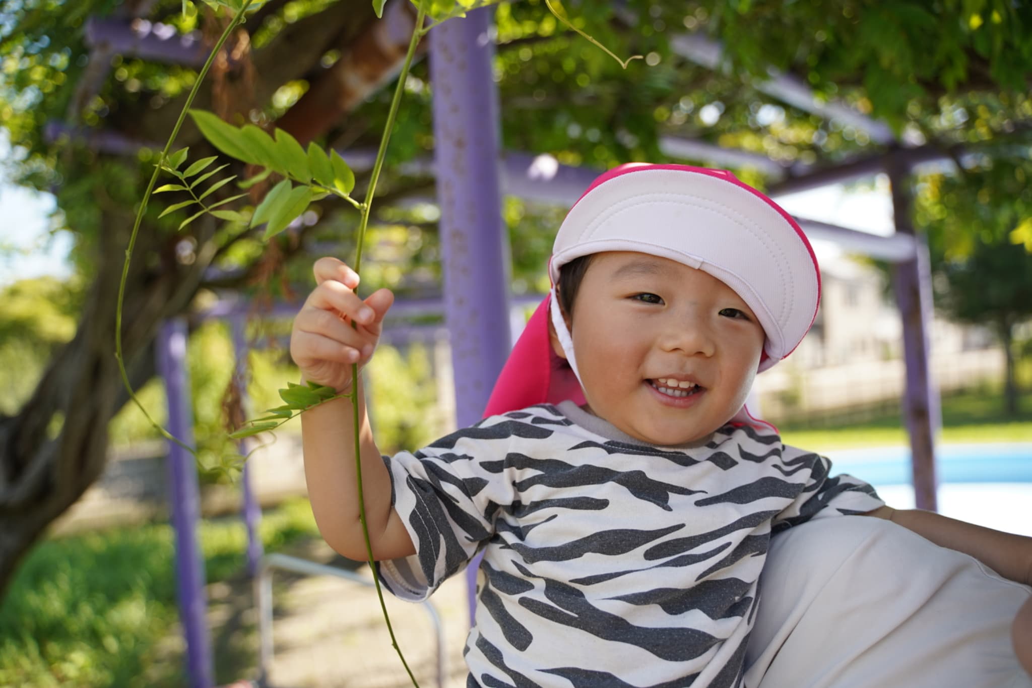 抱っこしてもらって高い所の葉っぱにタッチ🍃