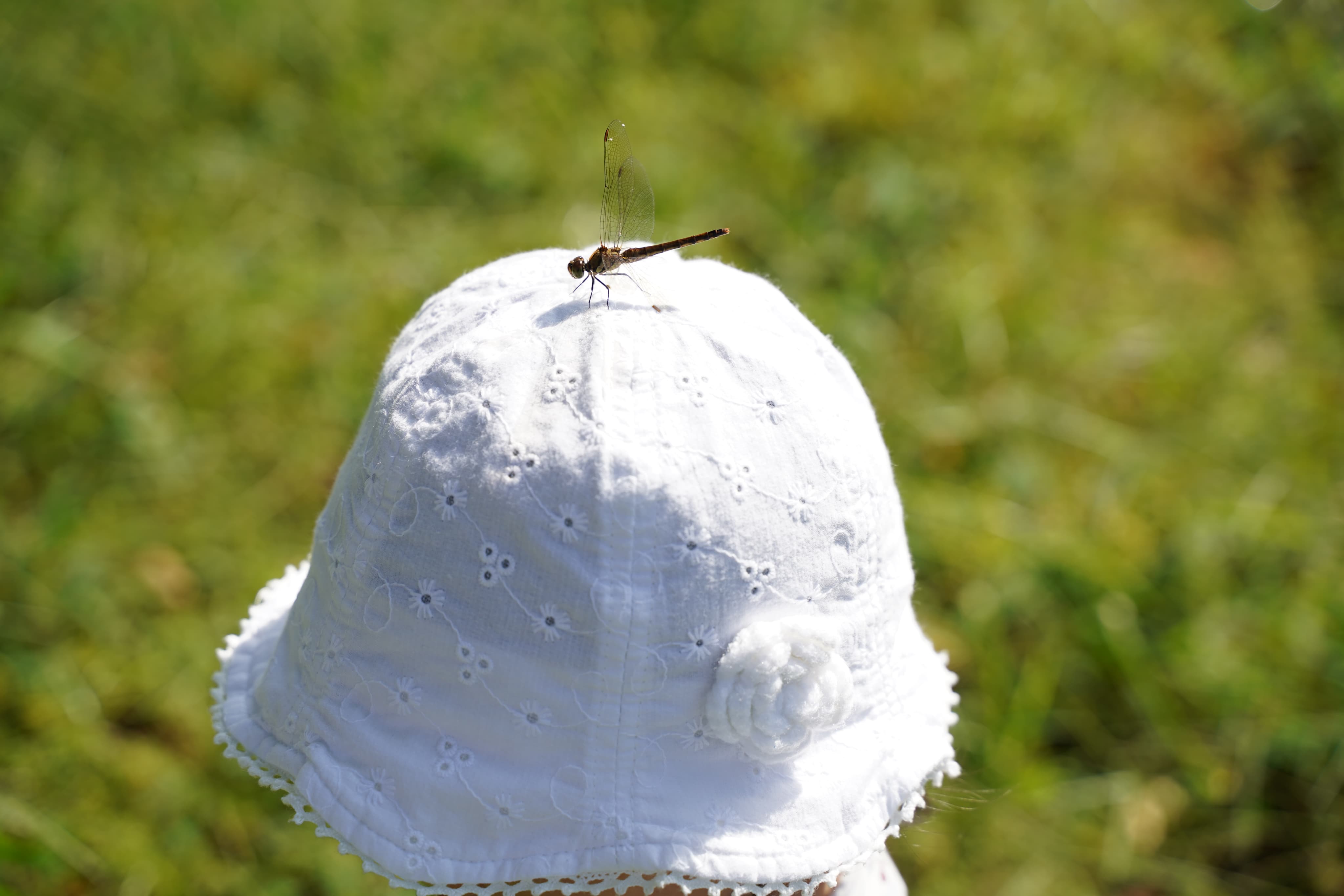 トンボさんおいで〜と呼んでいたら、帽子の上にちょこんと止まってくれたのでした😲
