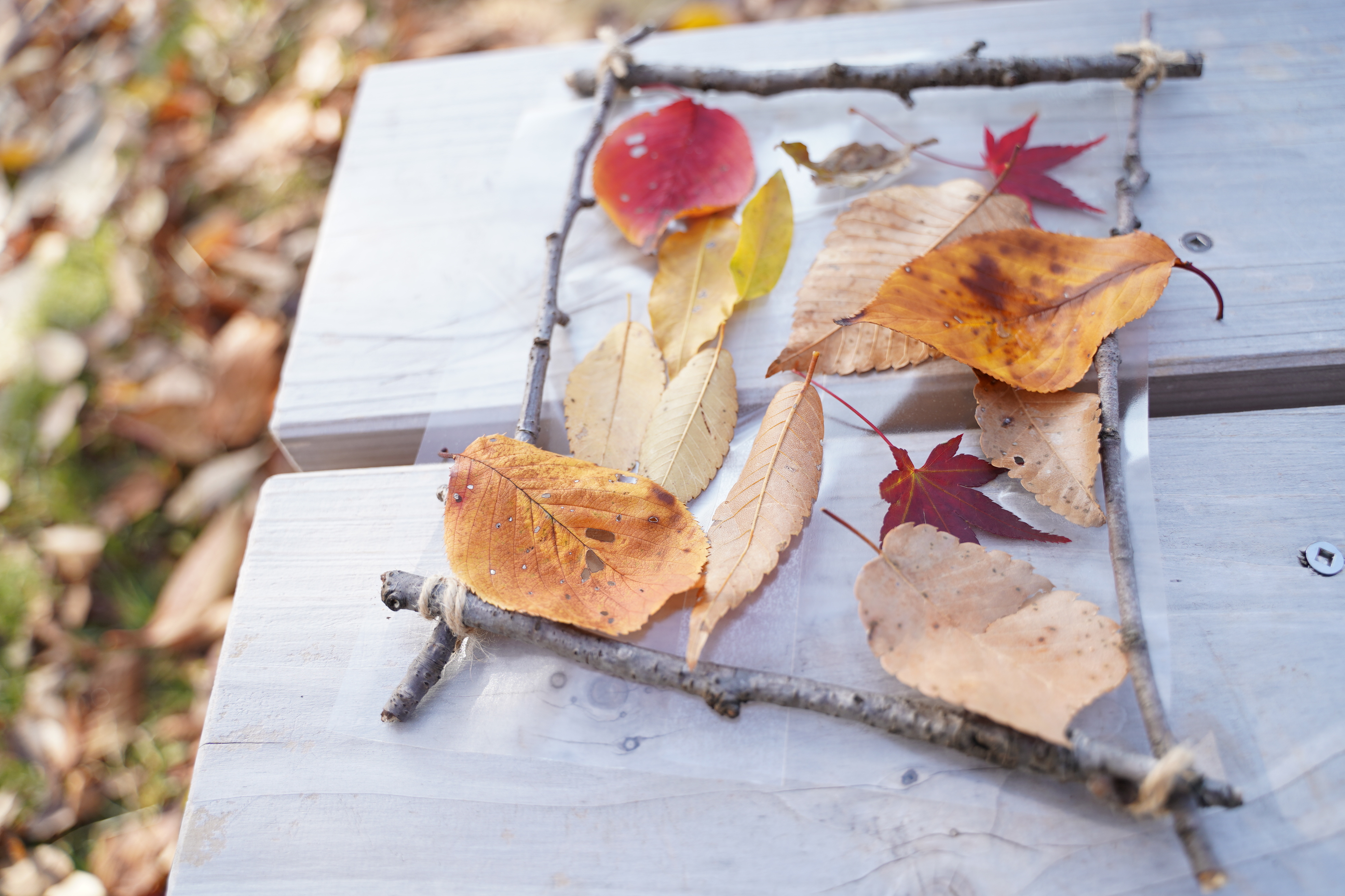 木の額縁を持っていき、落ち葉のアートを作ってみたよ?