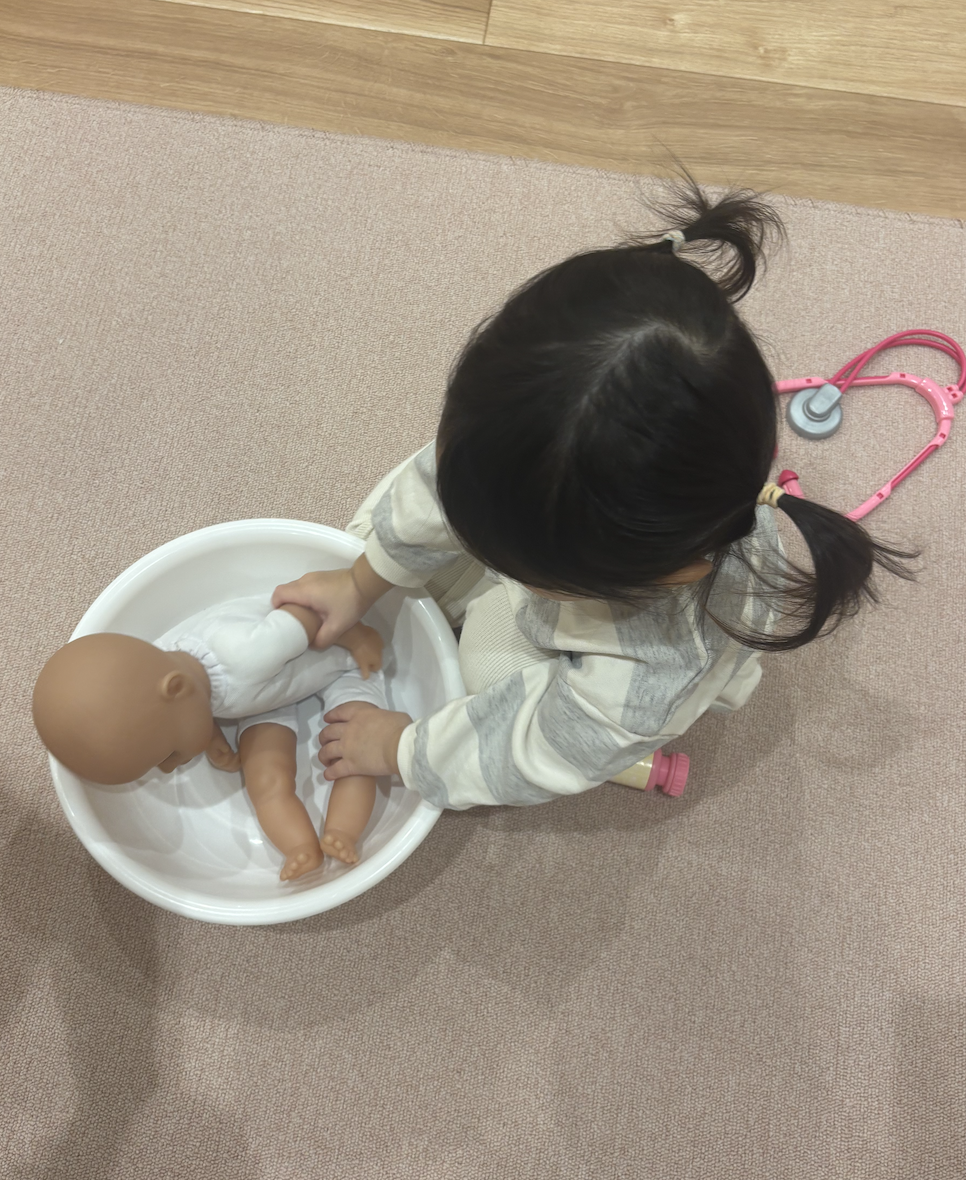2歳ごろになると「どうぞ」「ねんね」など、言葉を添えながら、人形に気持ちを向ける場面が増えていきます。