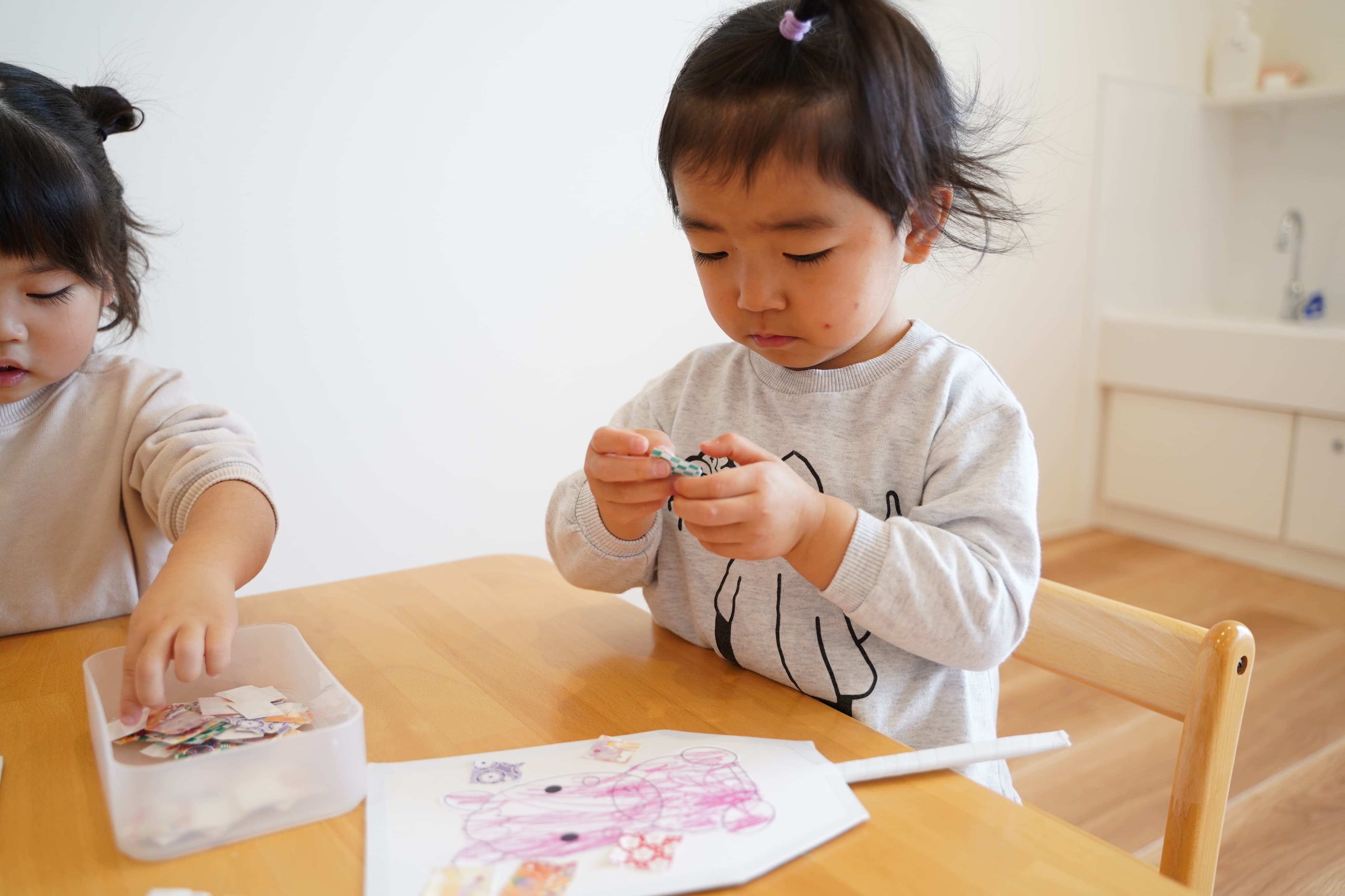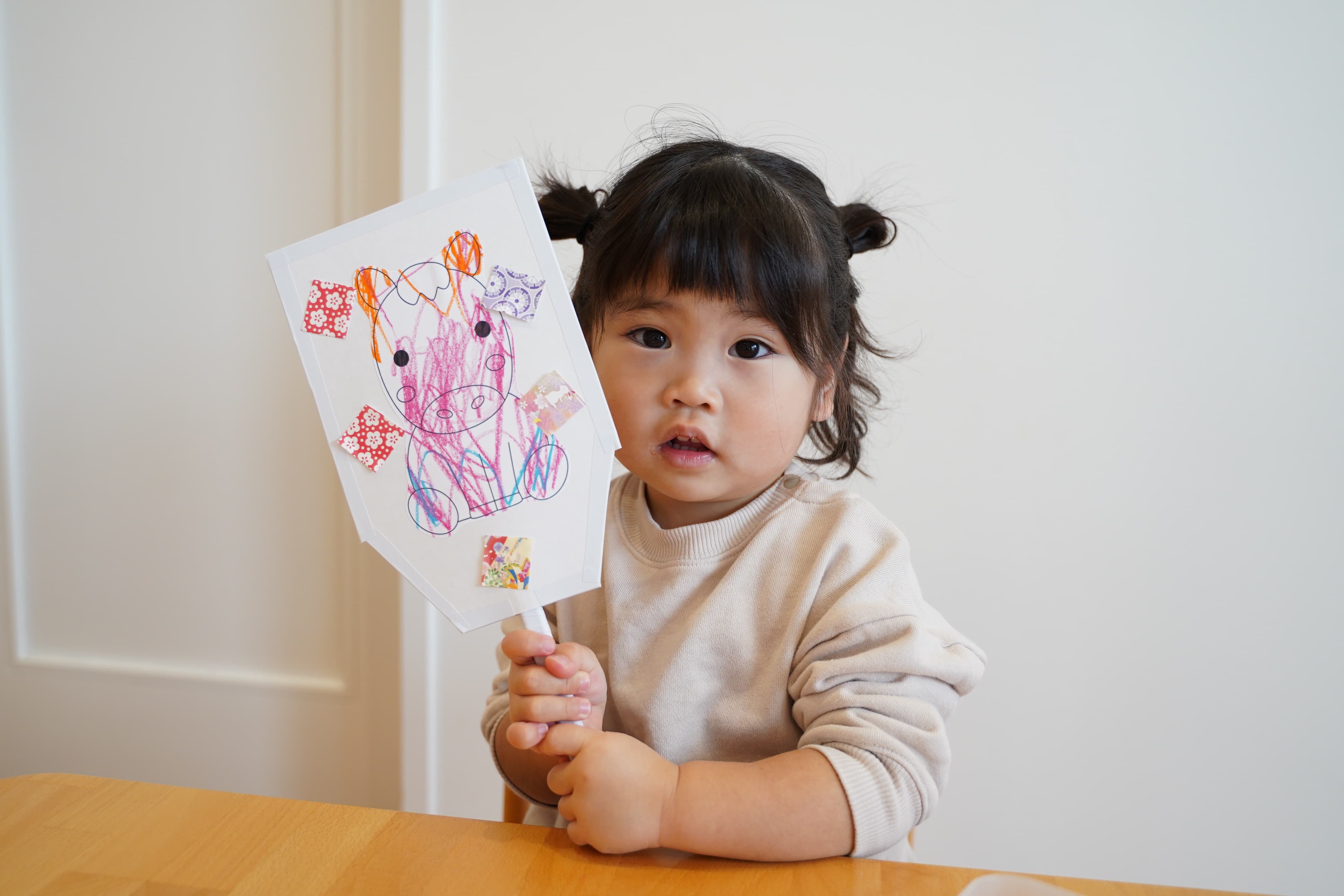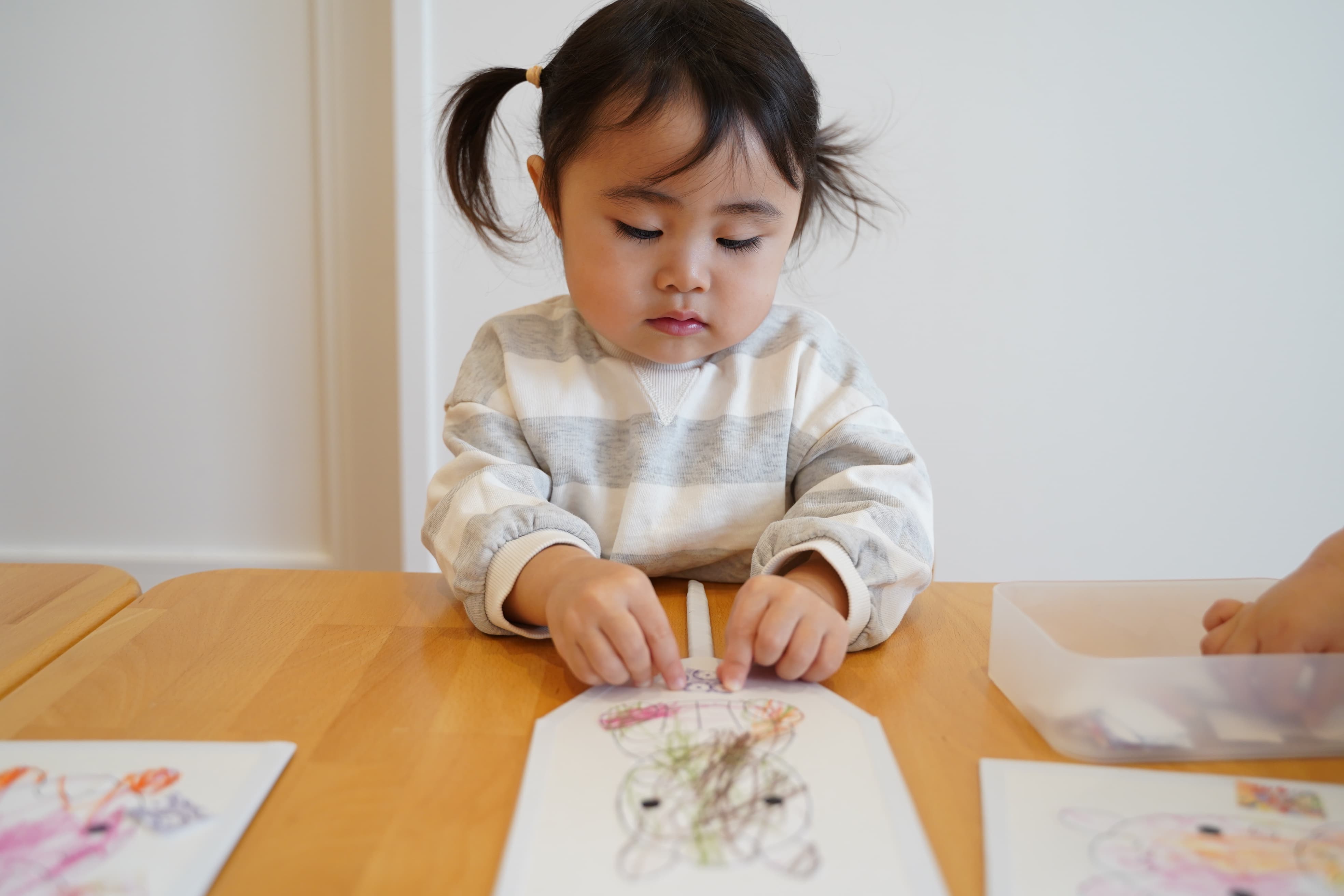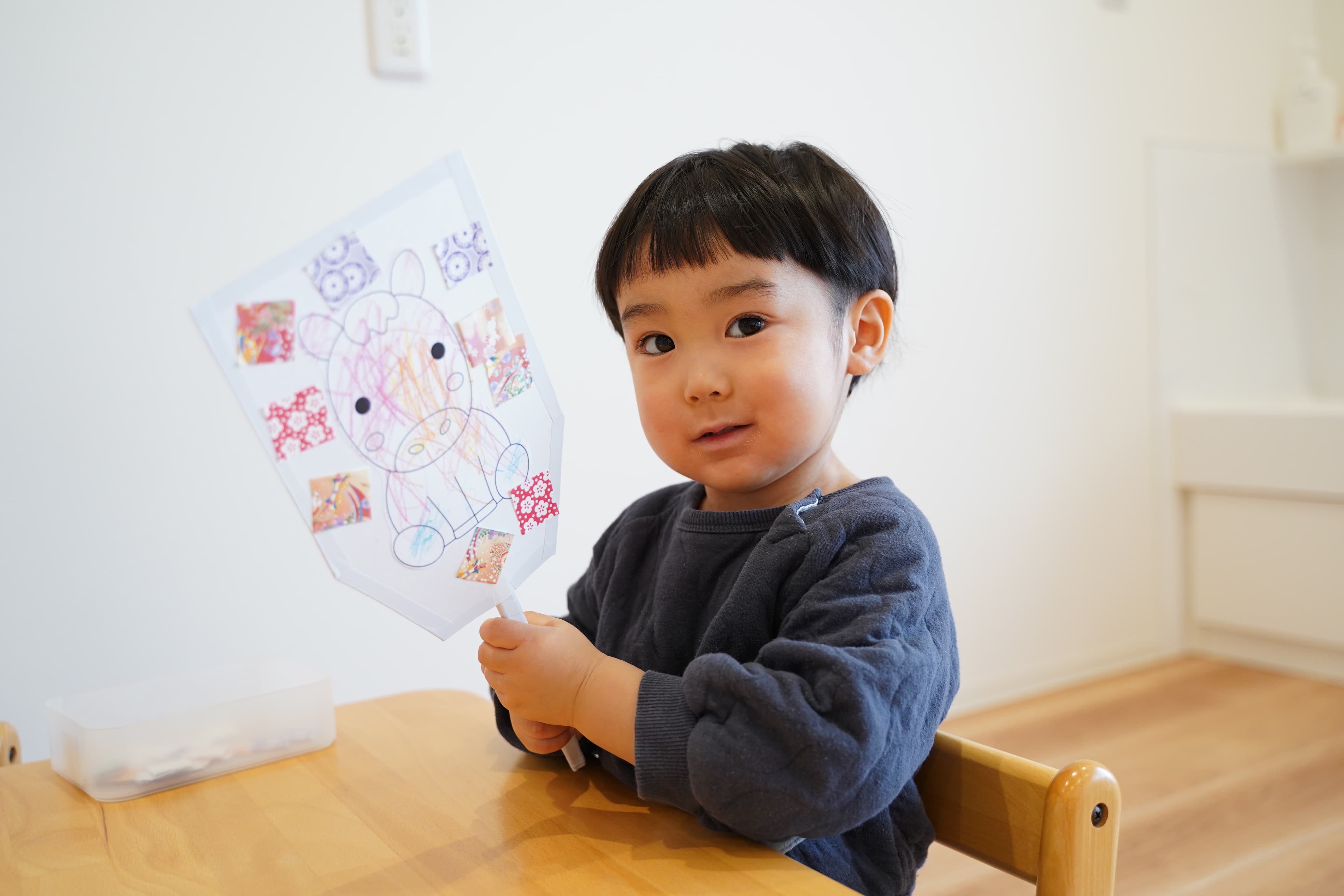 1歳児のお友達は昨日塗ったお馬さんの周りに千代紙で素敵な模様を✨