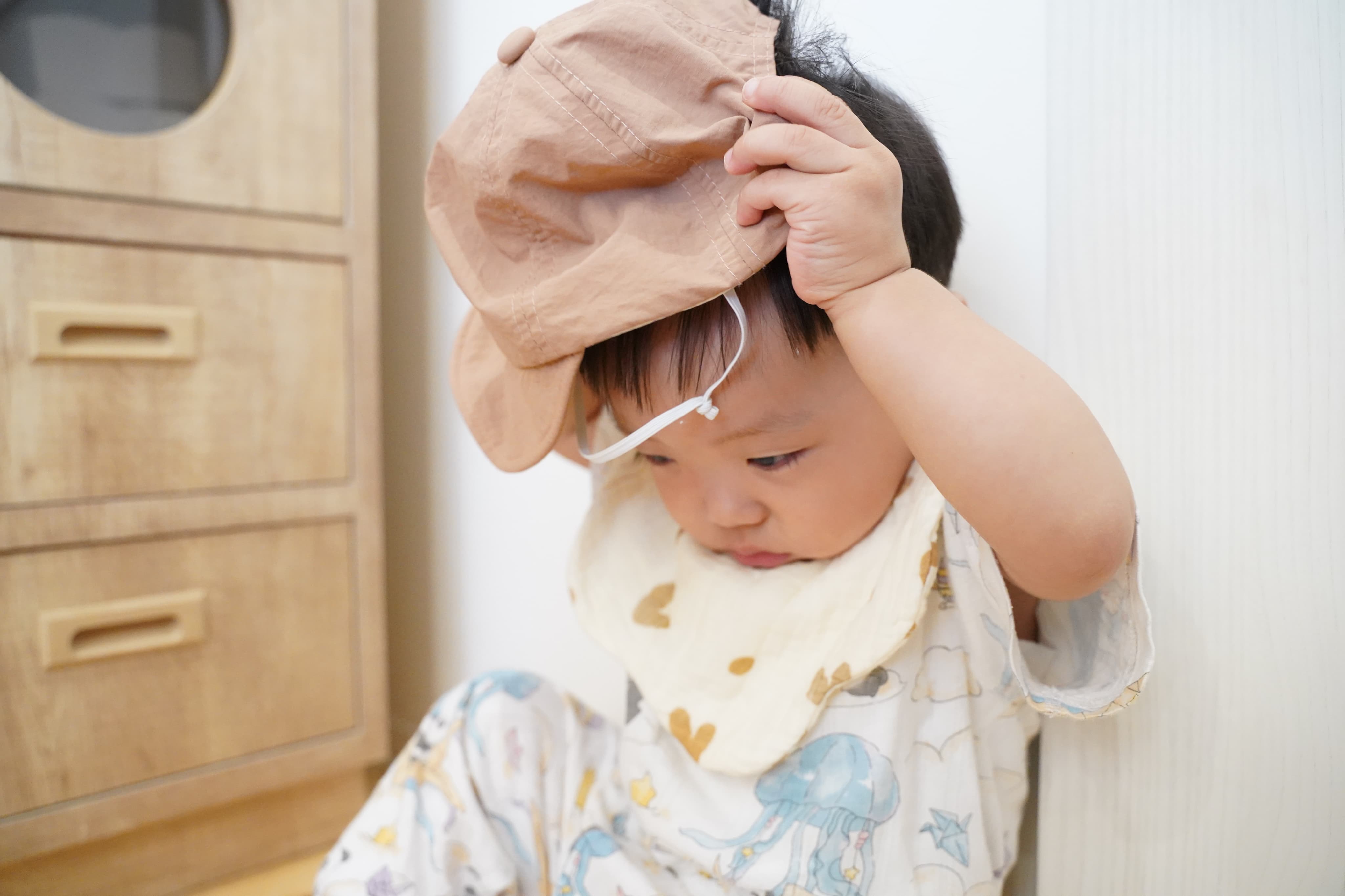 帽子を手渡すと、自分でかぶってみようと頑張るボクです☺︎🧢
