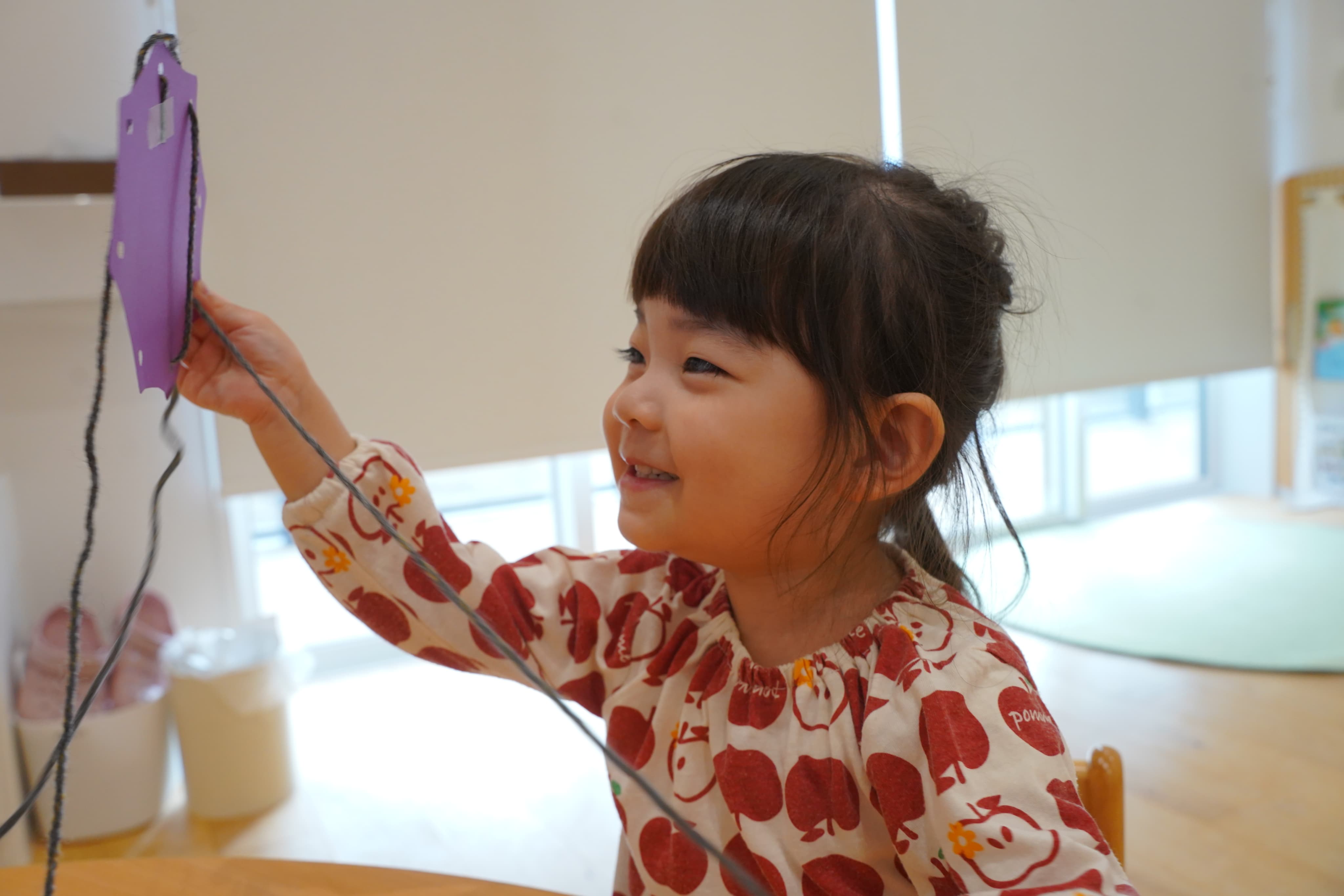 指先の感覚に集中!笑顔の余裕まで🤭上手に穴に紐を通すことができていましたよ、すごい👏✨