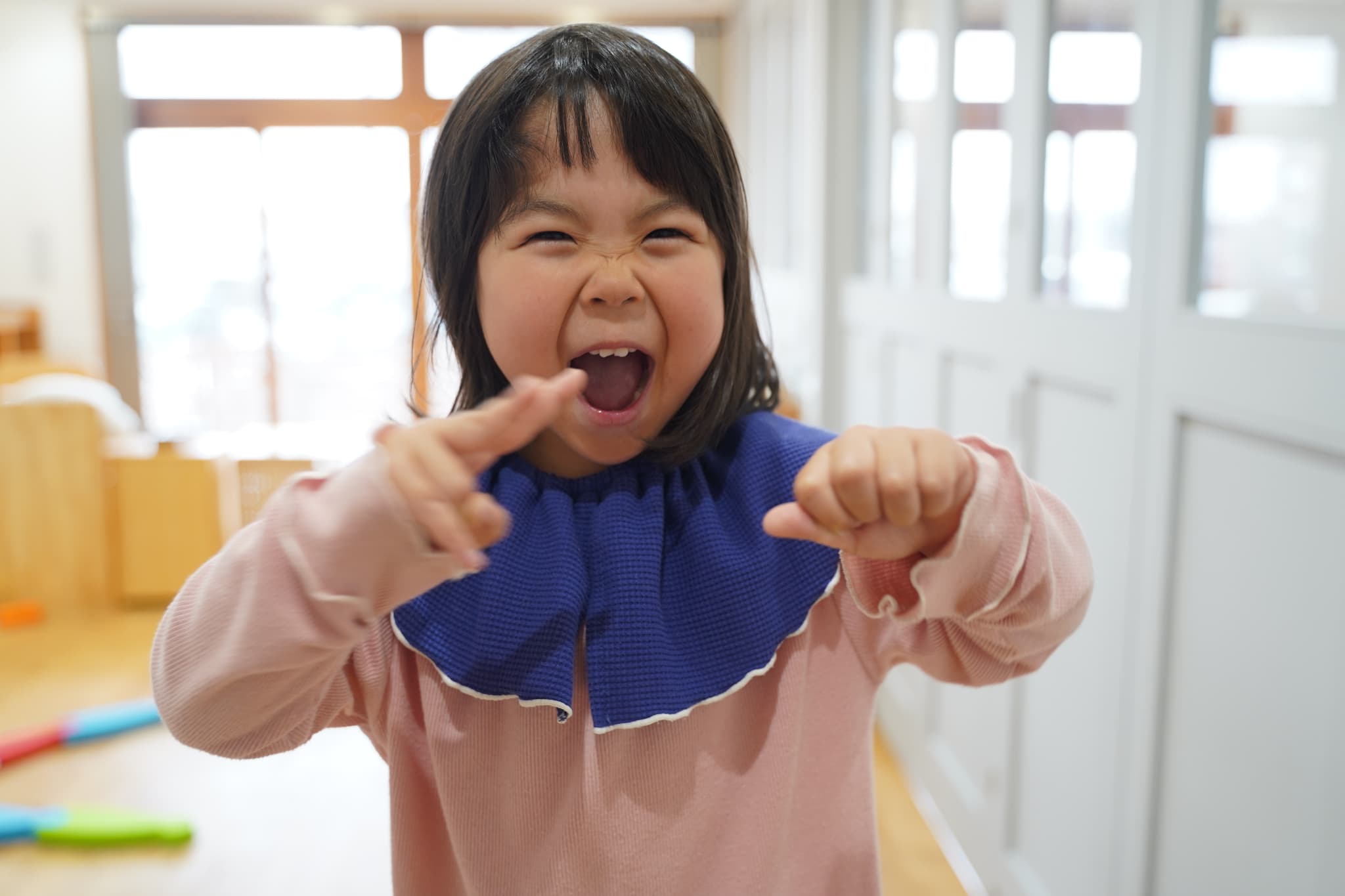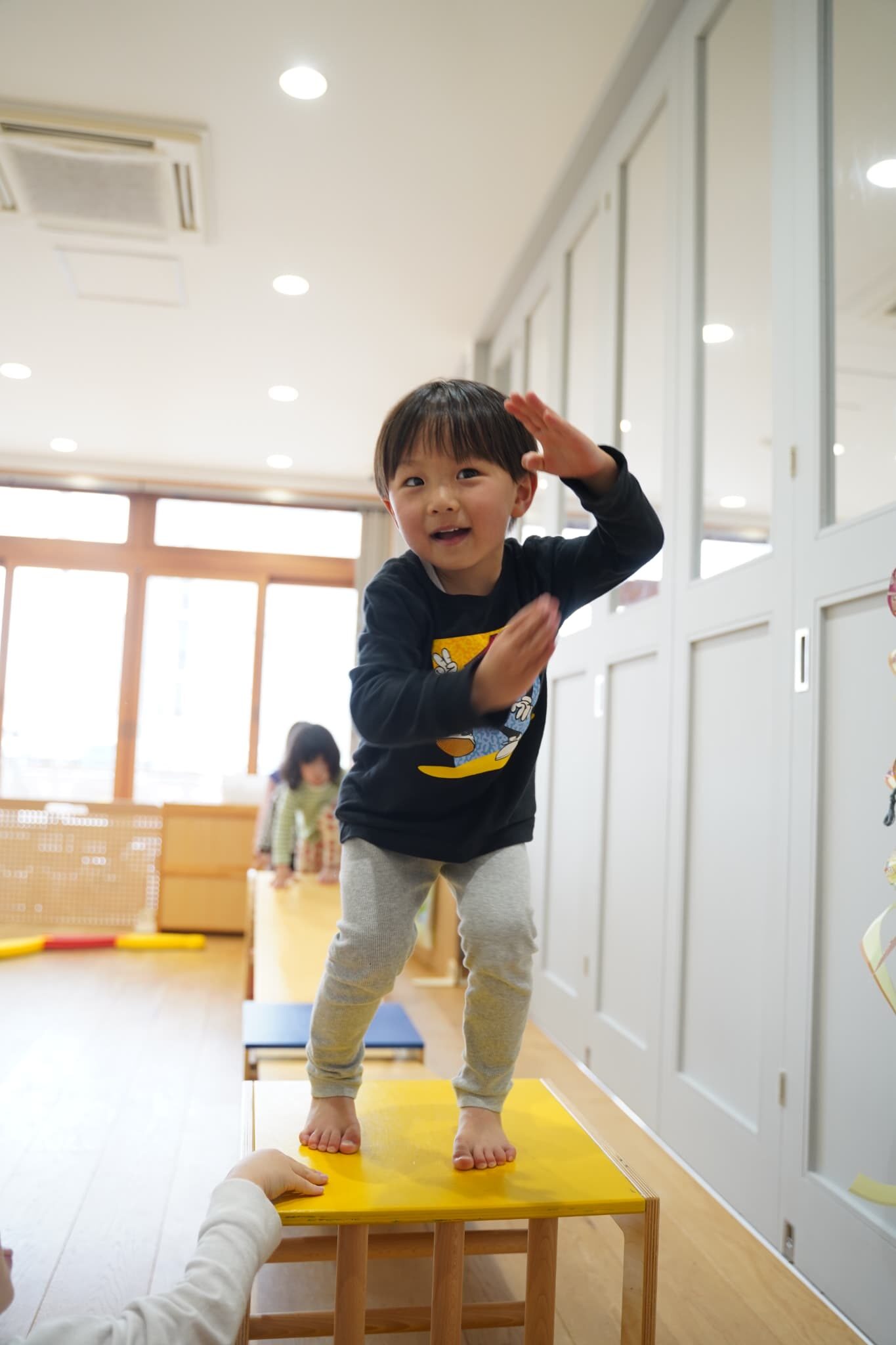 今日はお部屋を広くして体を動かして遊びました。