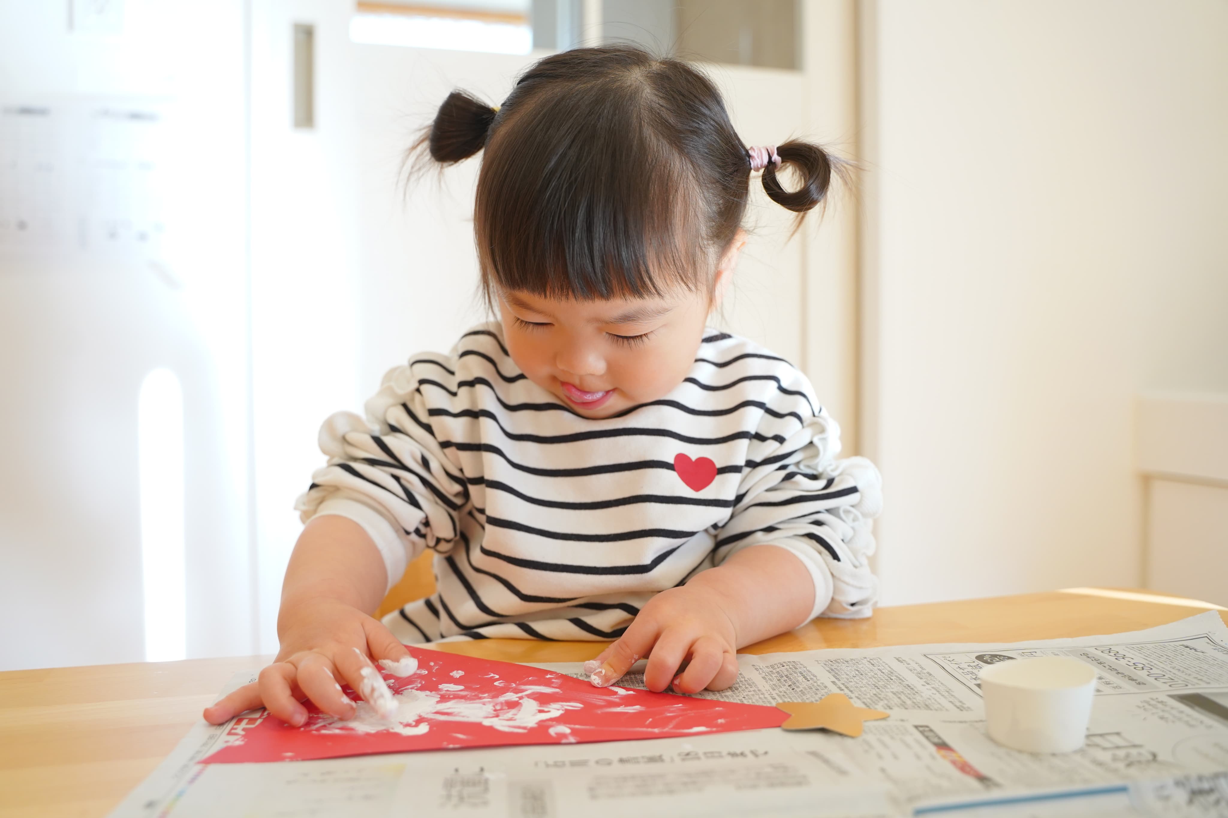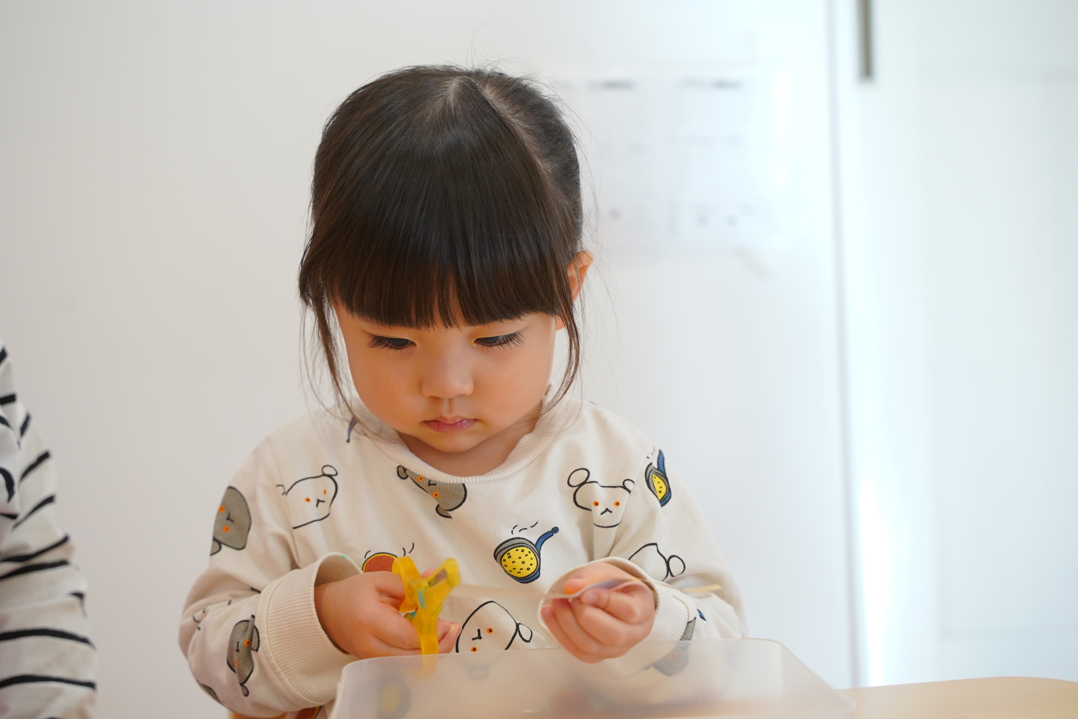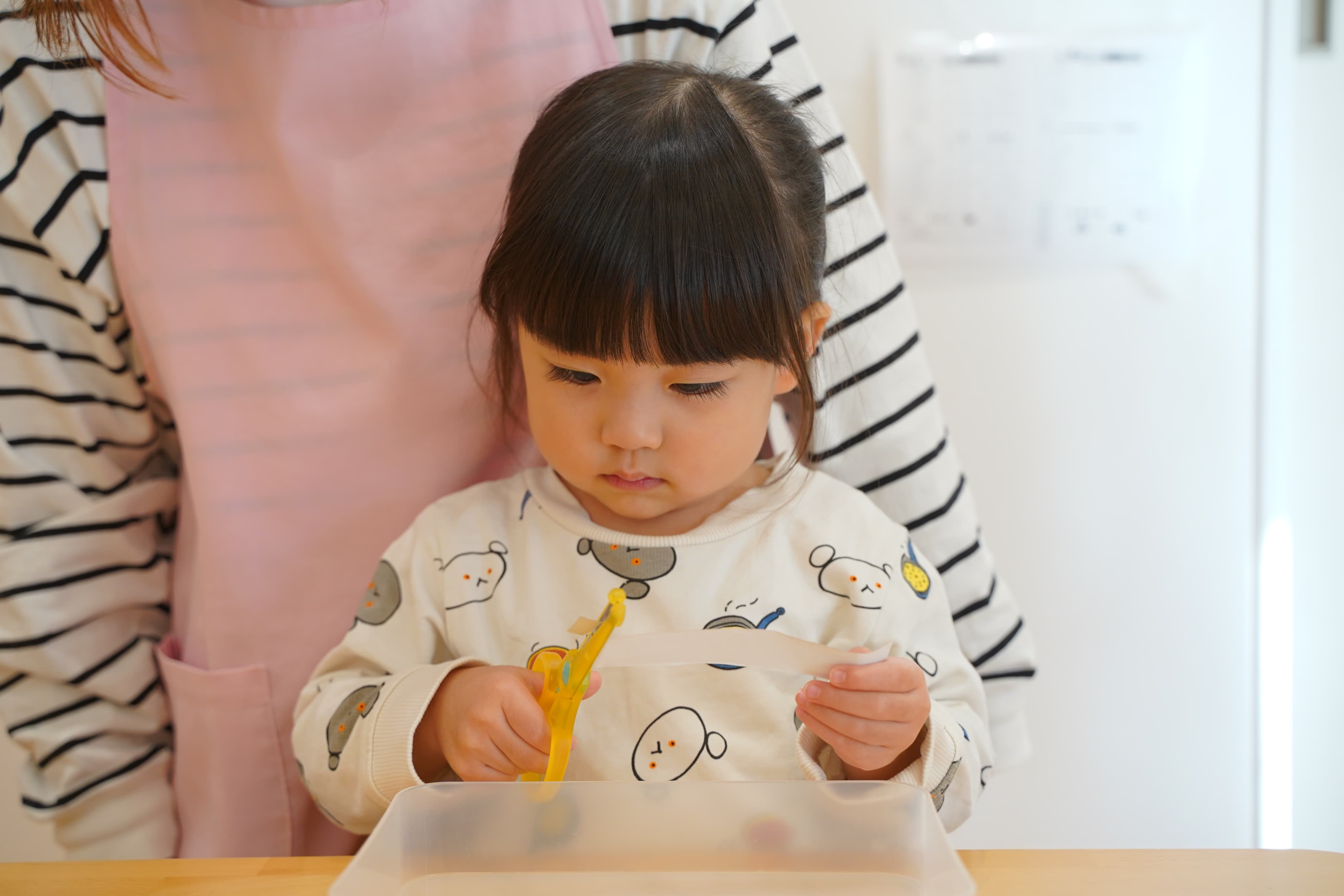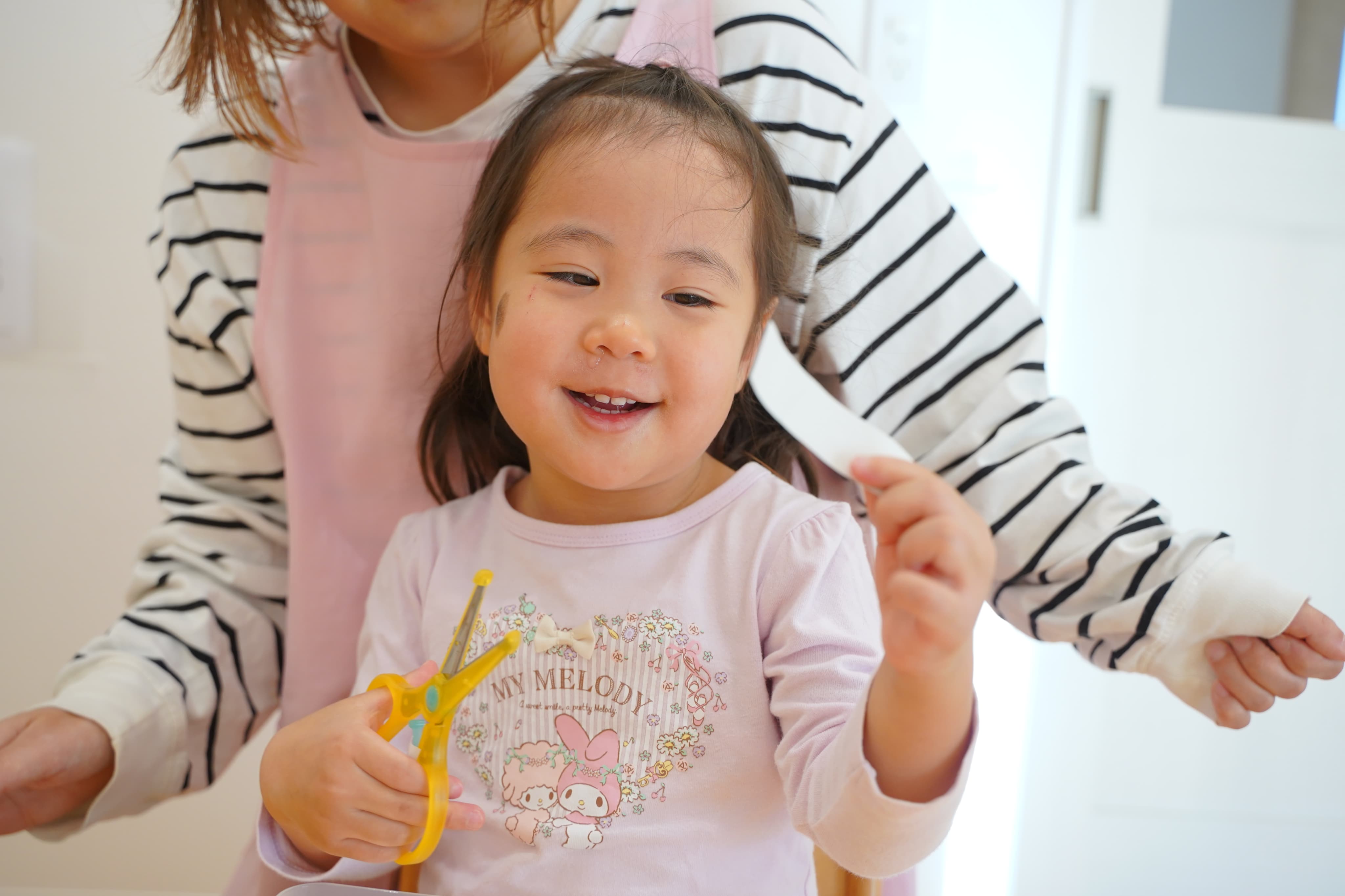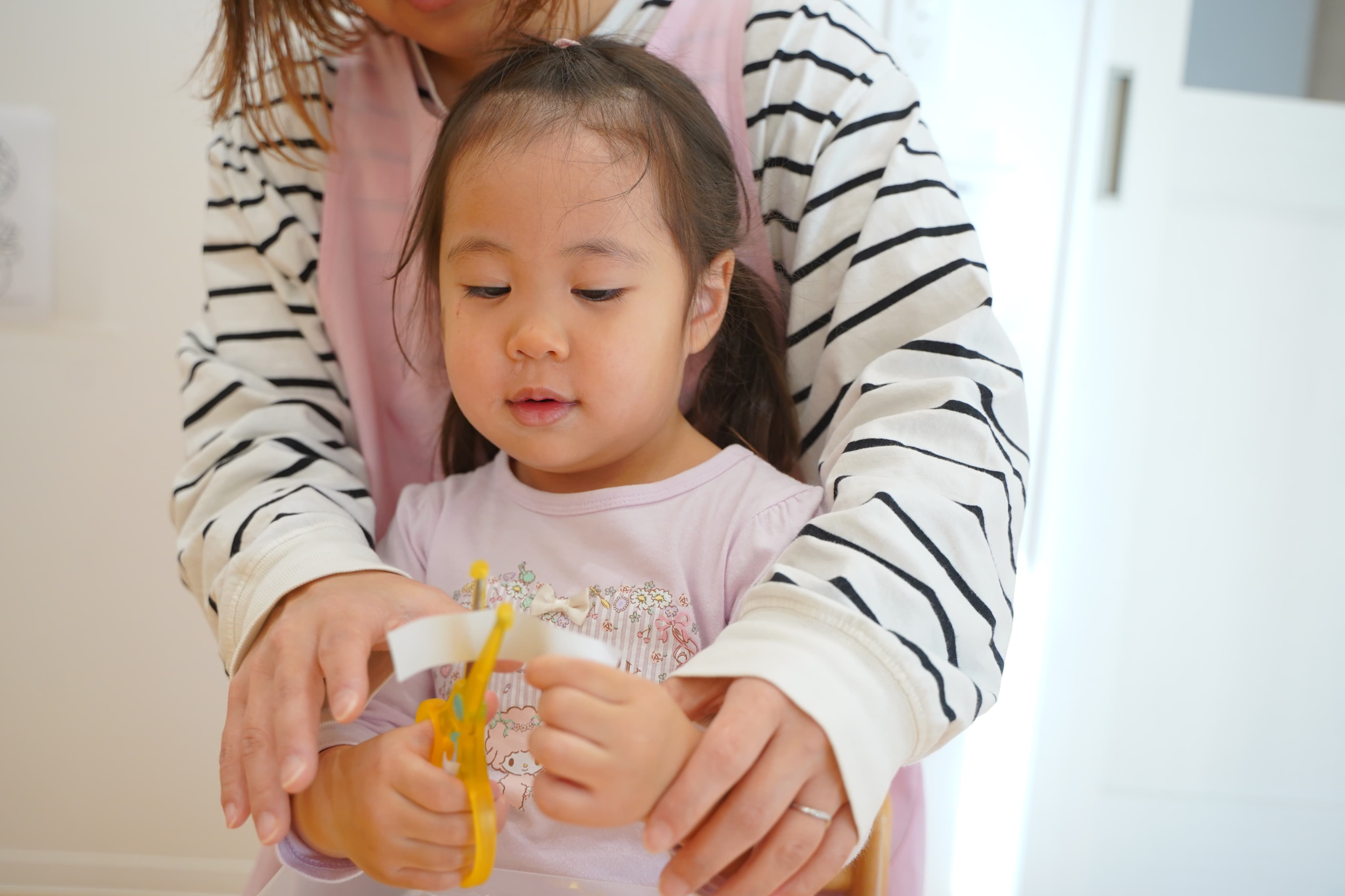 2歳児さんの私たちは、クリスマス製作で3度目のはさみの一回切りに挑戦〜✂️