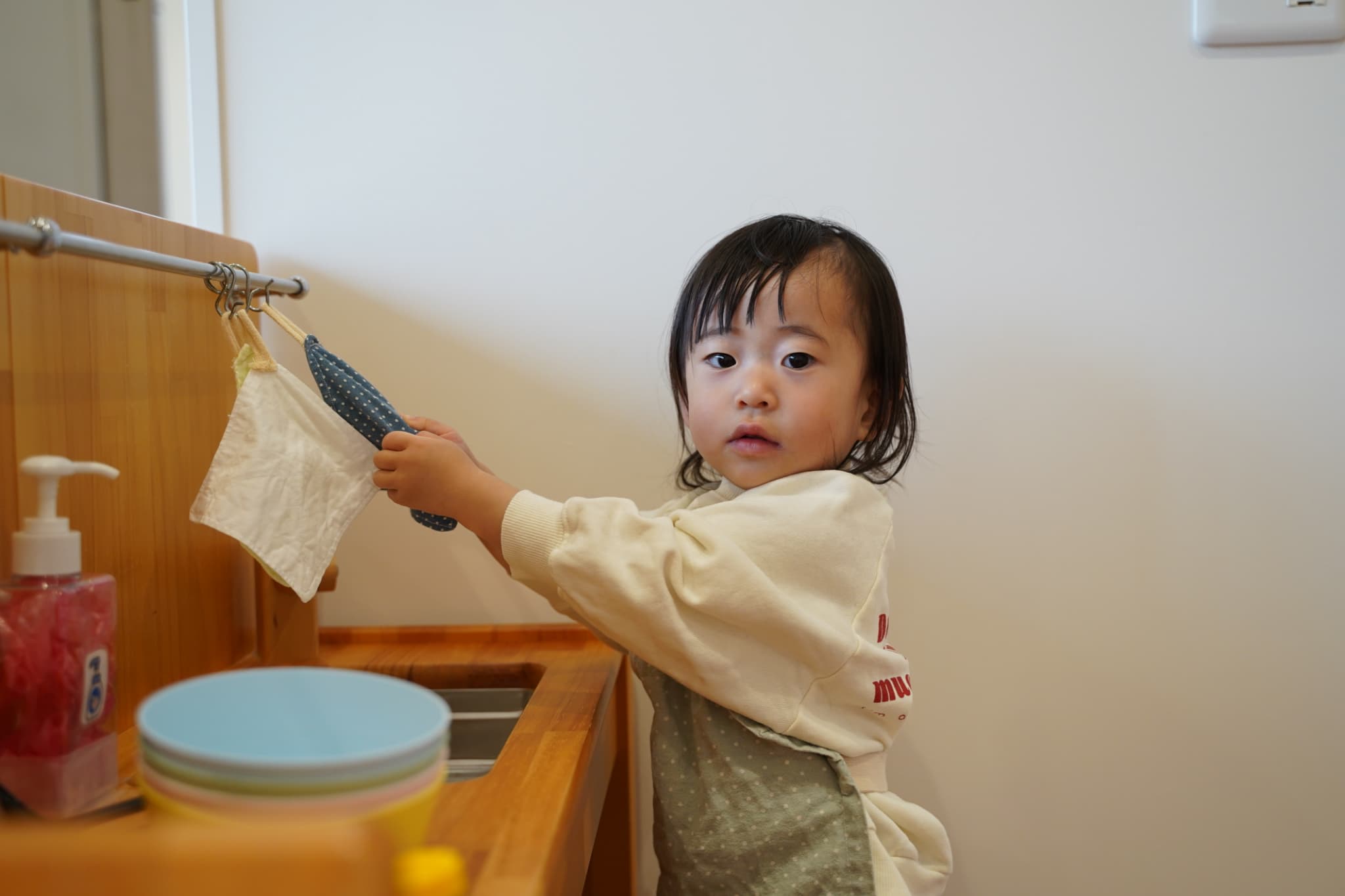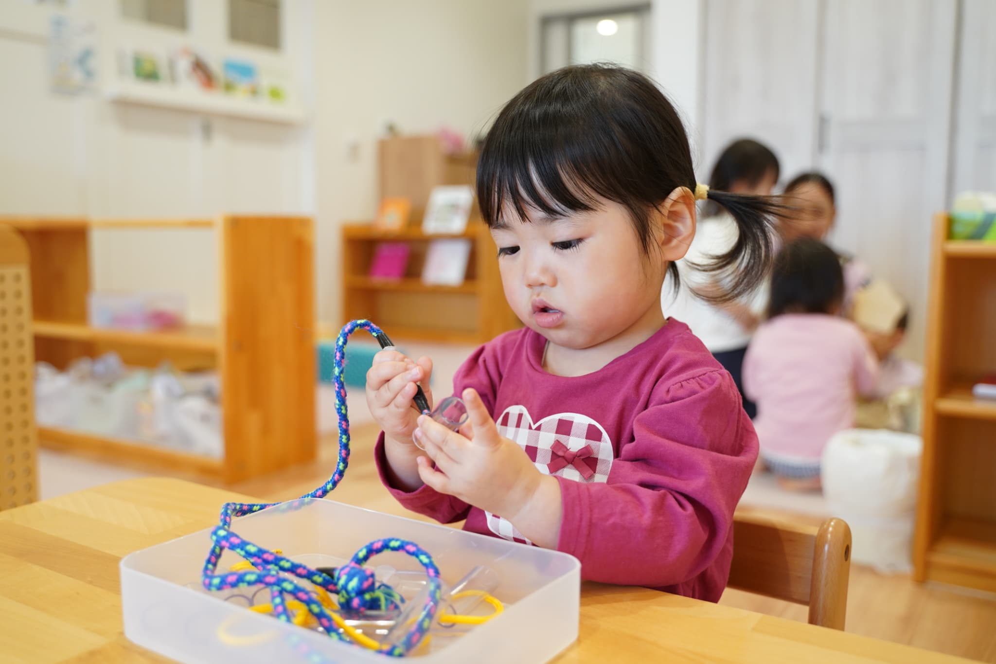 紐通し、どうやったら通るかな?真剣な表情で考えてます💭🧐