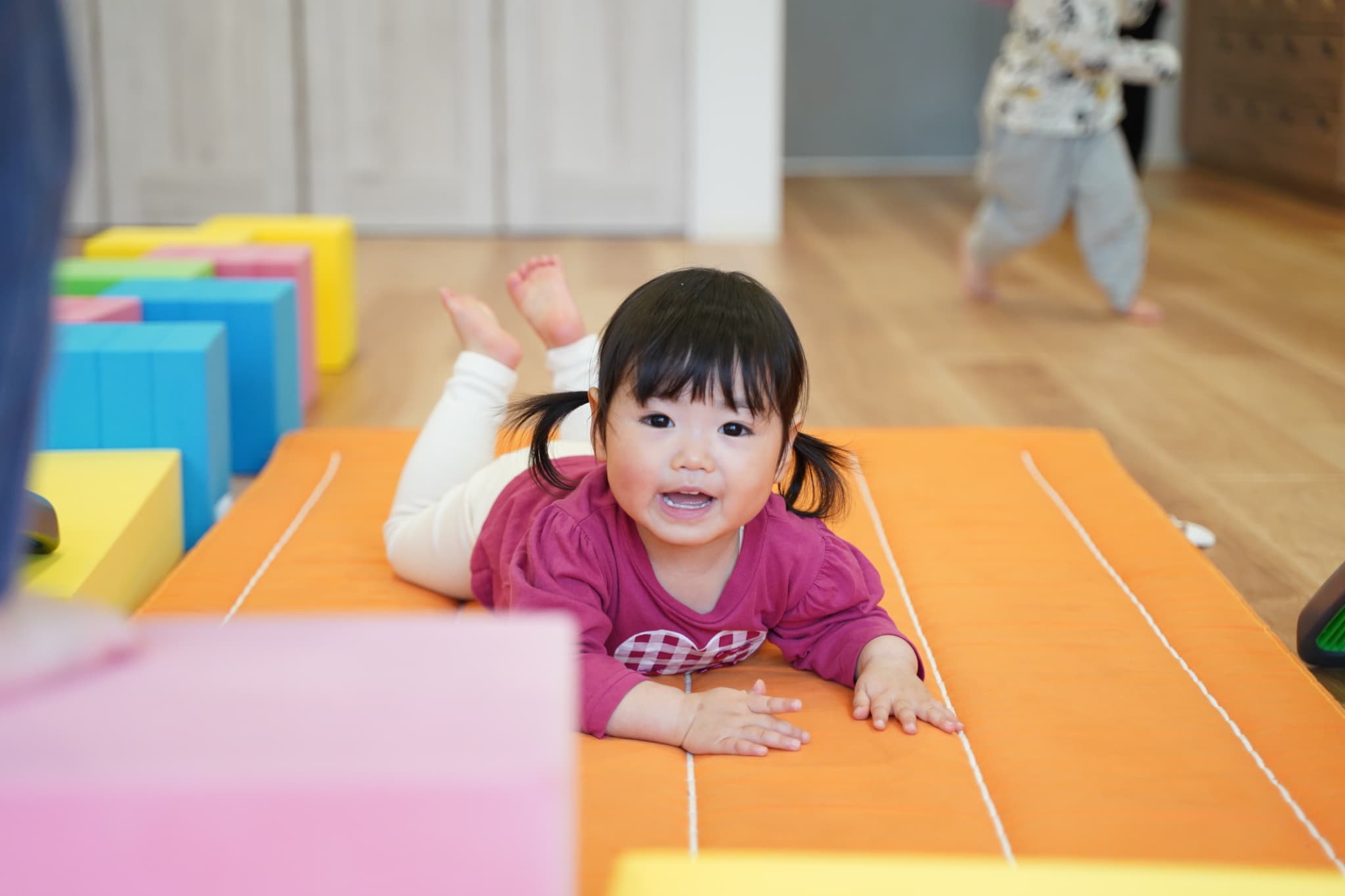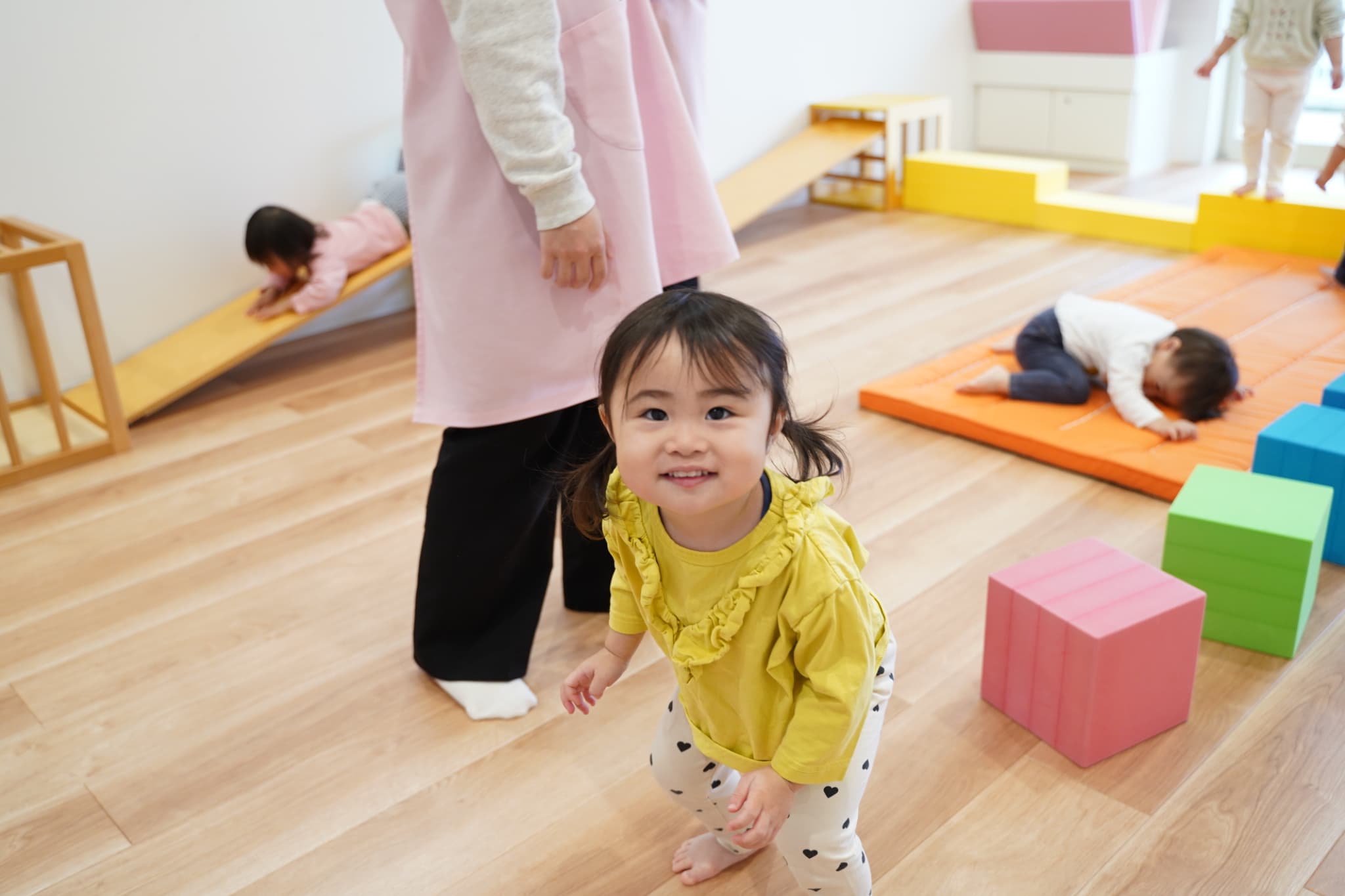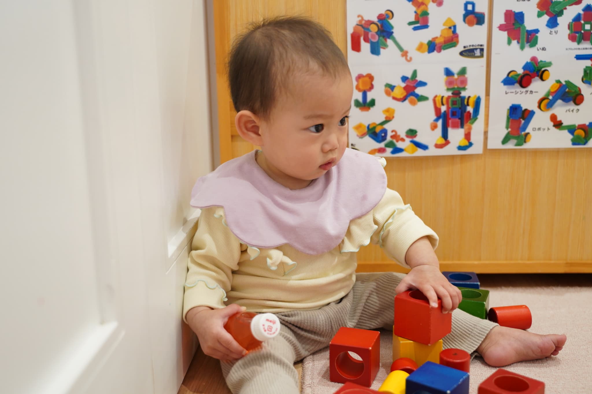 新しい環境にドキドキワクワクしていた子もいるかとは思いますが、みんな落ち着いて新しいお部屋で過ごせていましたよ。早速新しいおもちゃを手に取って遊び始めました!