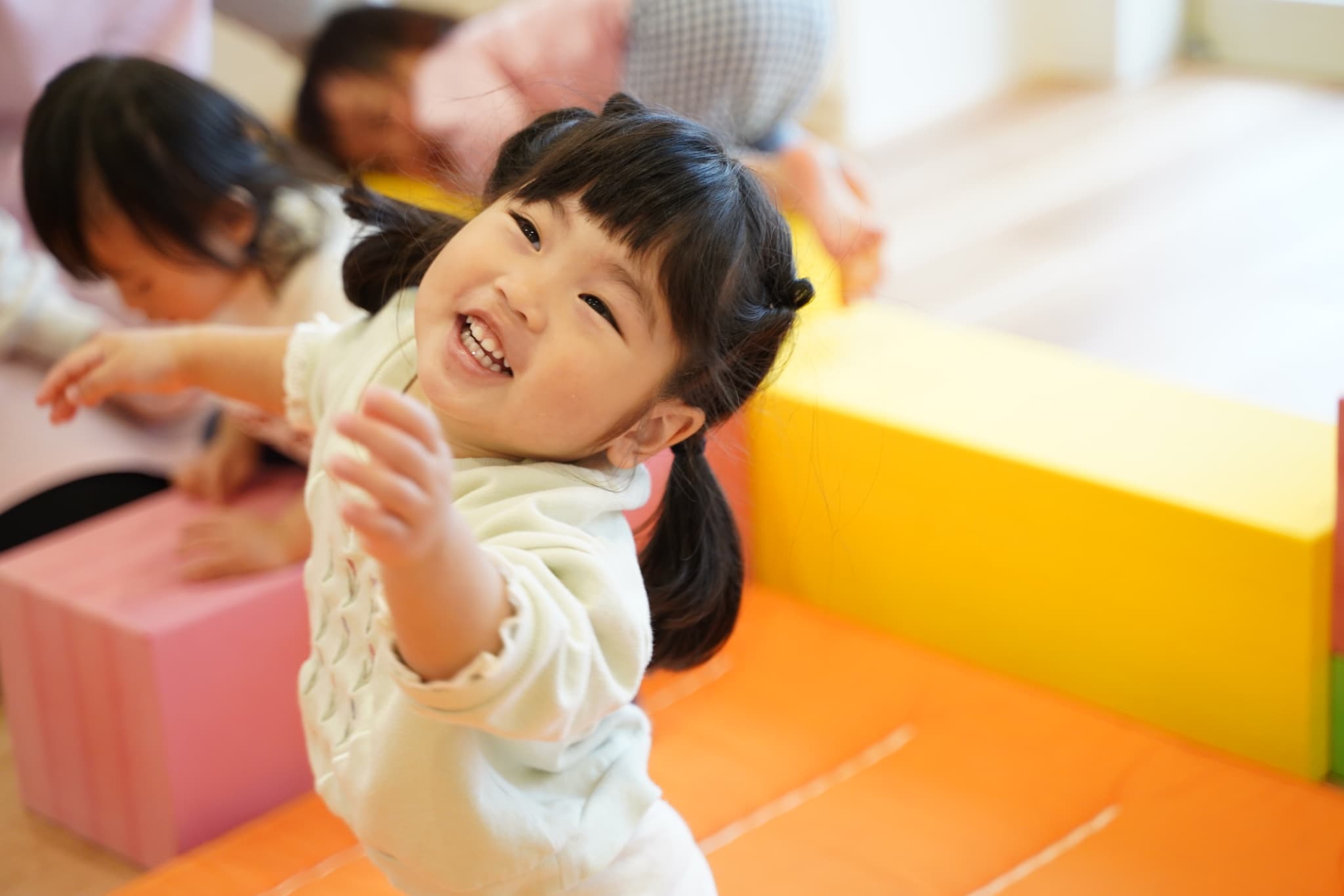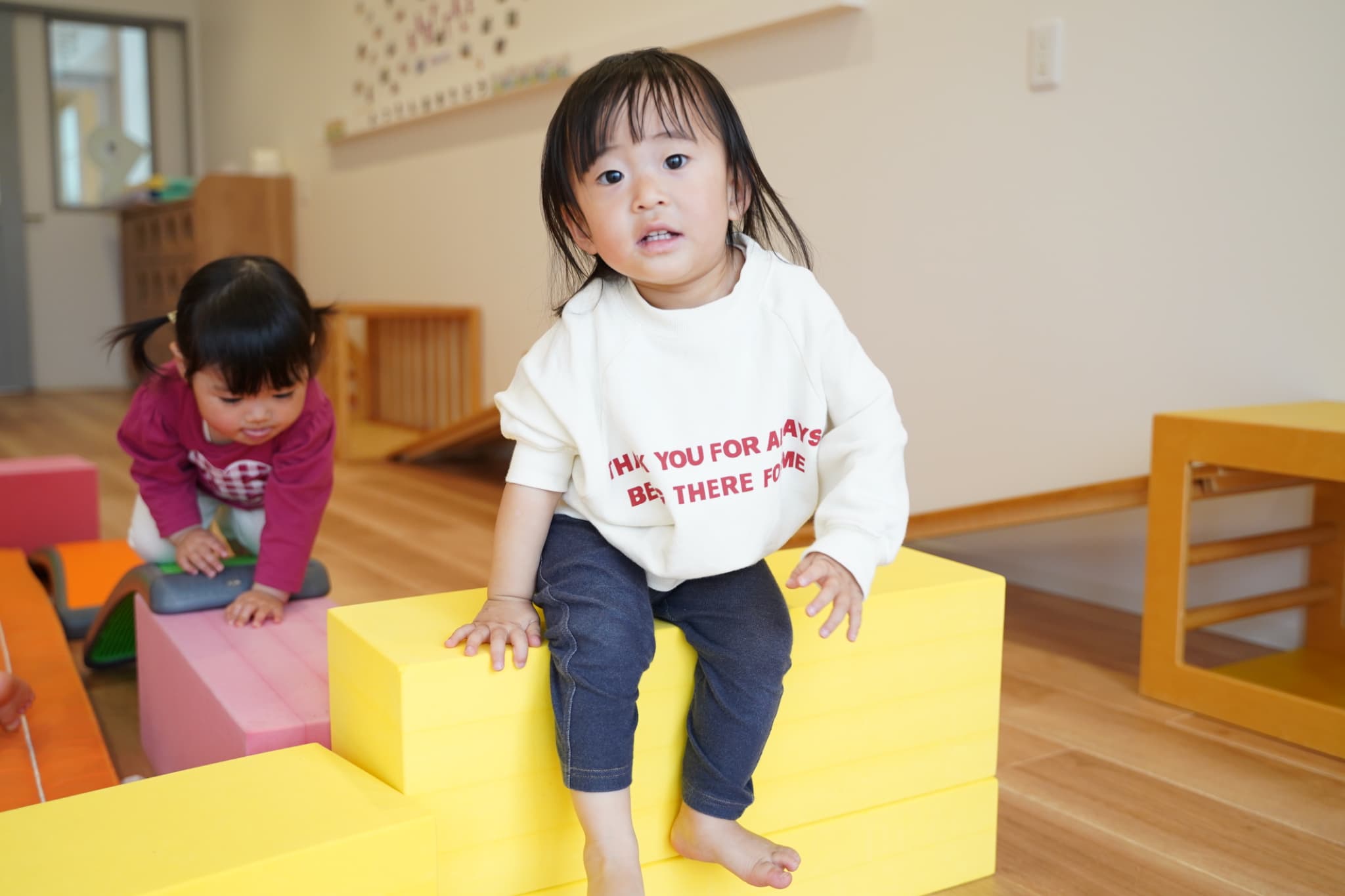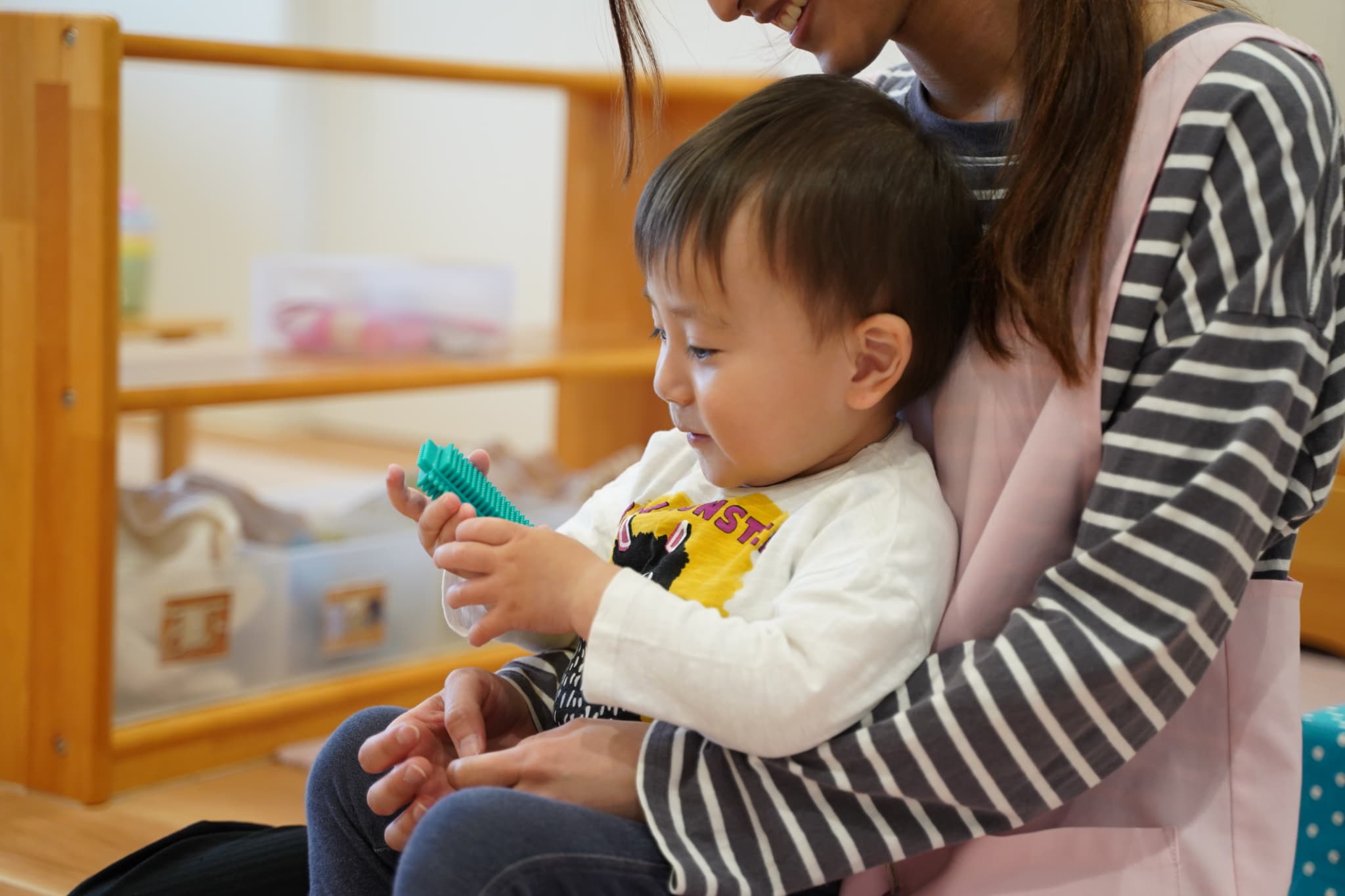 新しい環境にドキドキワクワクしていた子もいるかとは思いますが、みんな落ち着いて新しいお部屋で過ごせていましたよ。早速新しいおもちゃを手に取って遊び始めました!