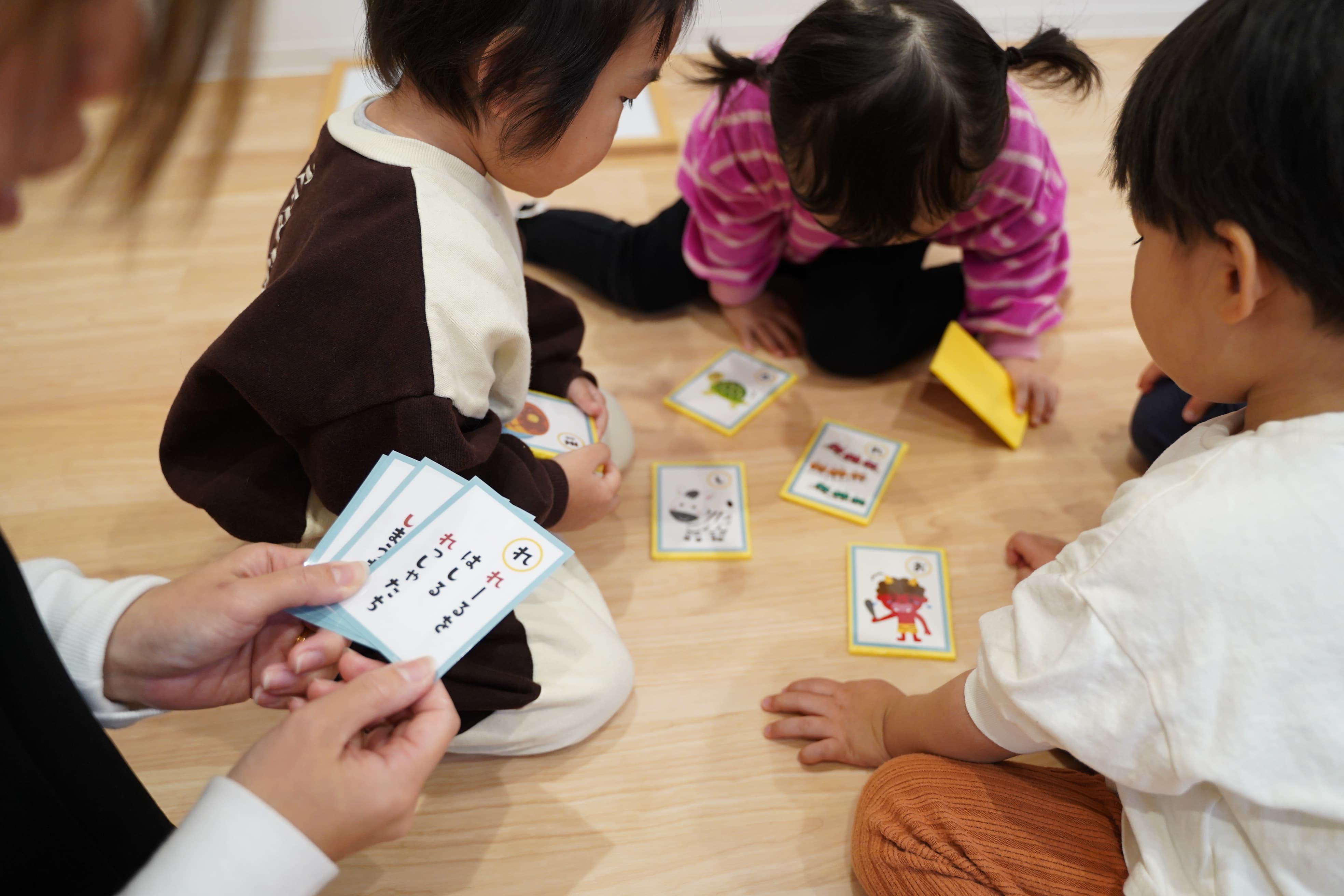 先生の読む言葉を聞いて「これだ!!」と素早く手を出す勢いに先生も驚き✨そして、子どもたちも友達の勢いに負けじと真剣にカルタをみながら取り組んでいました👏