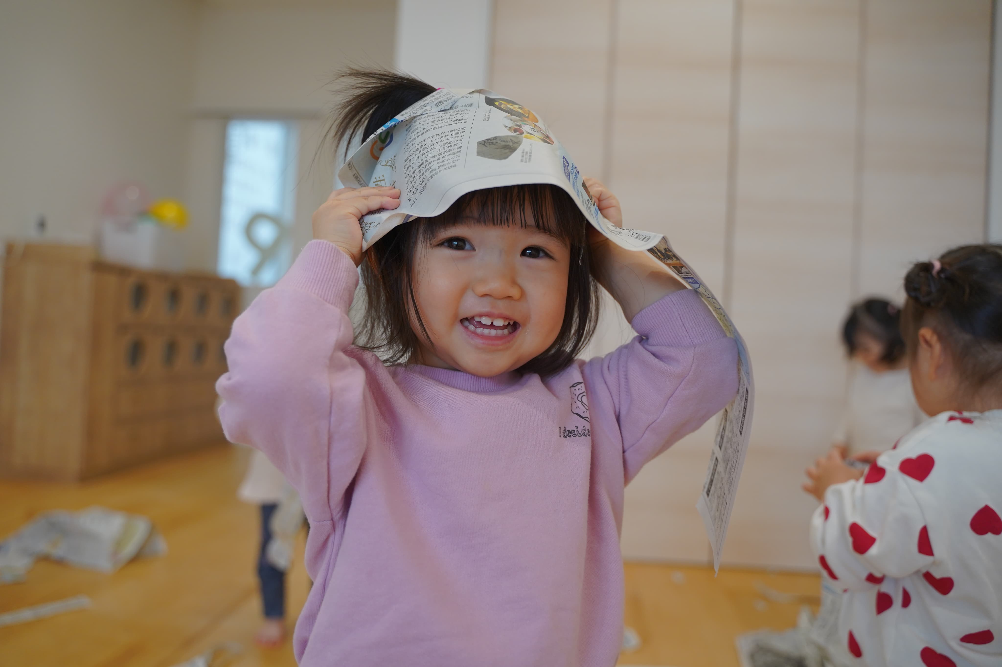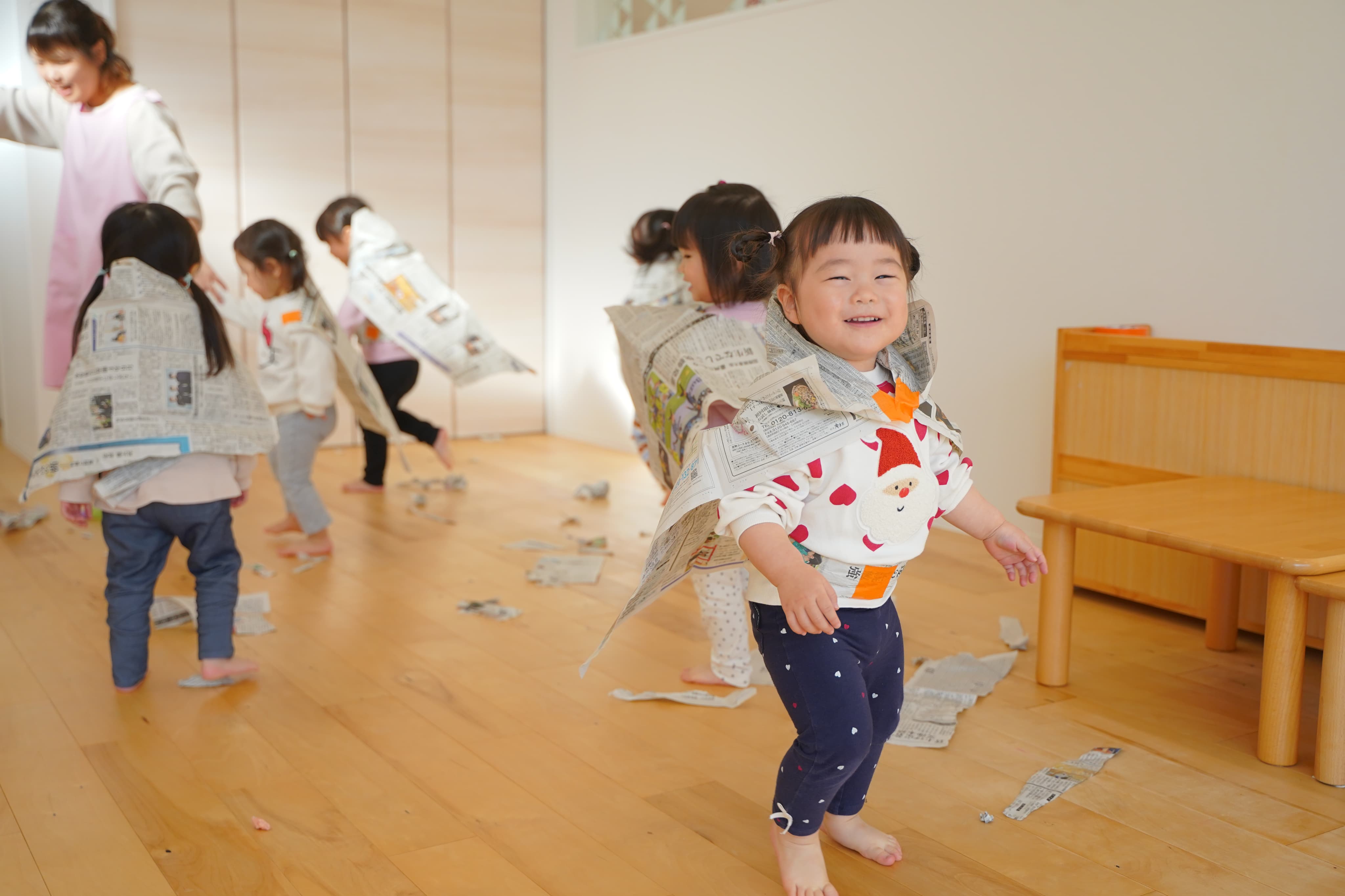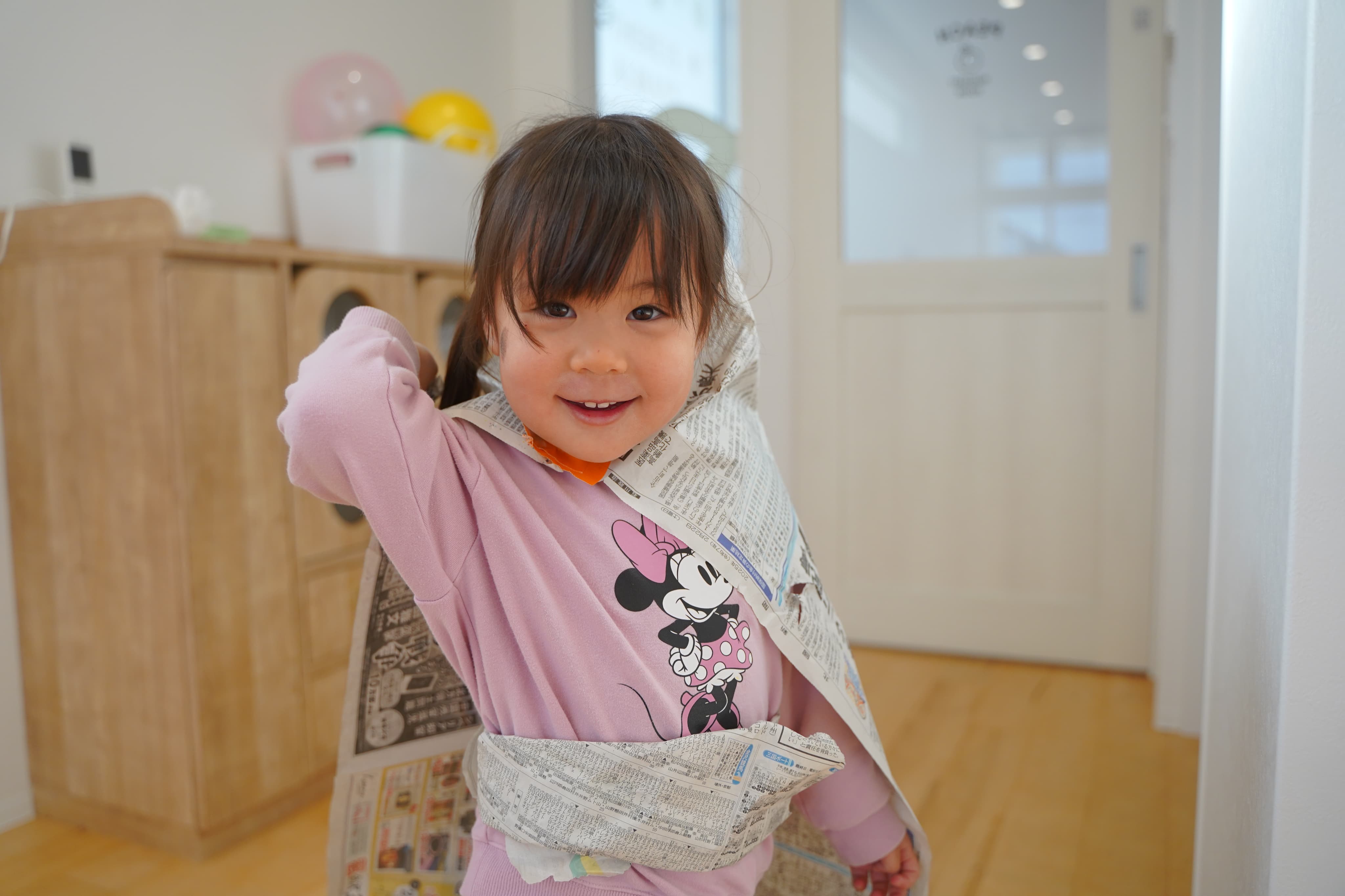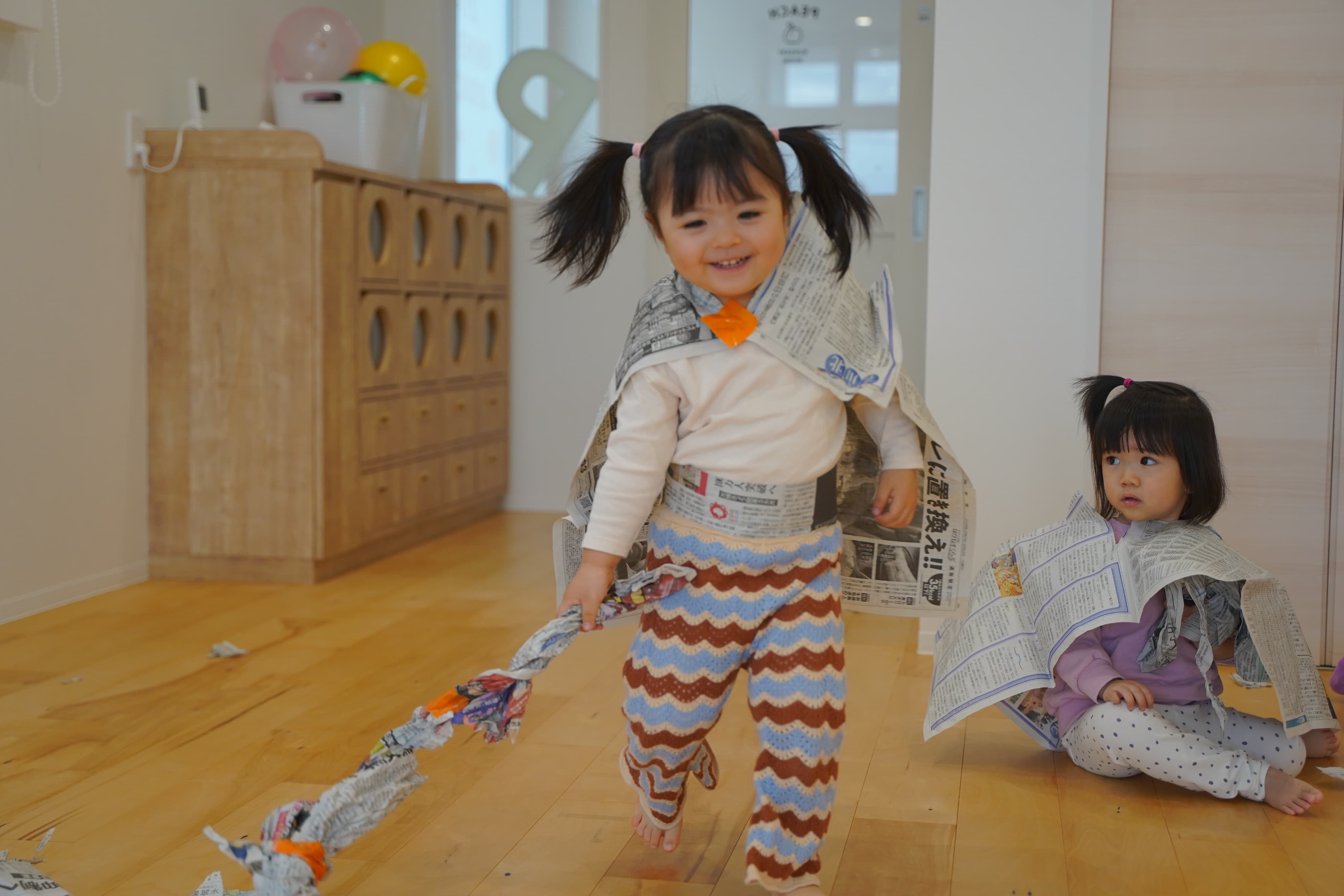 新聞マントをつけてアンパンマンになりきる子どもたち✨