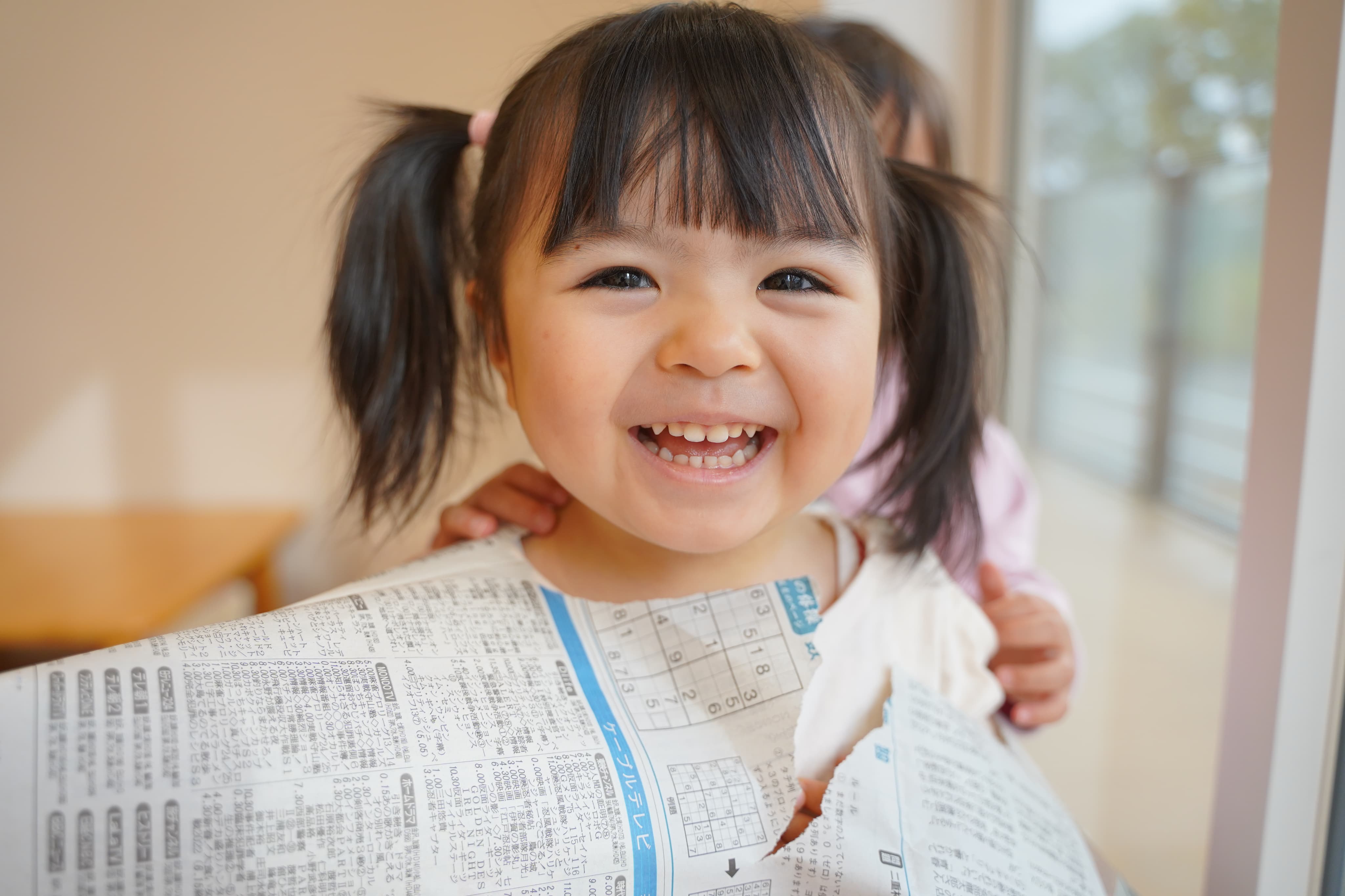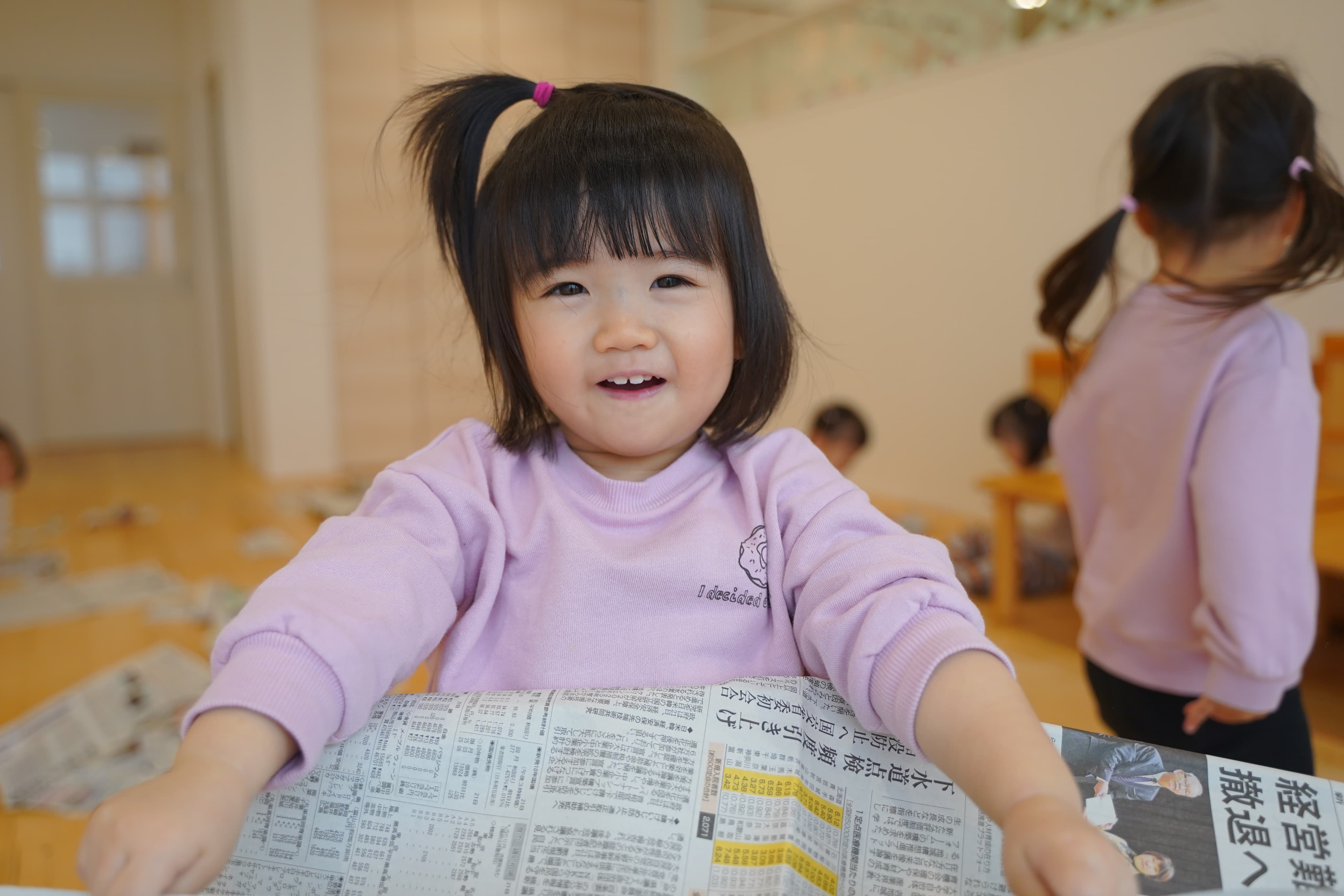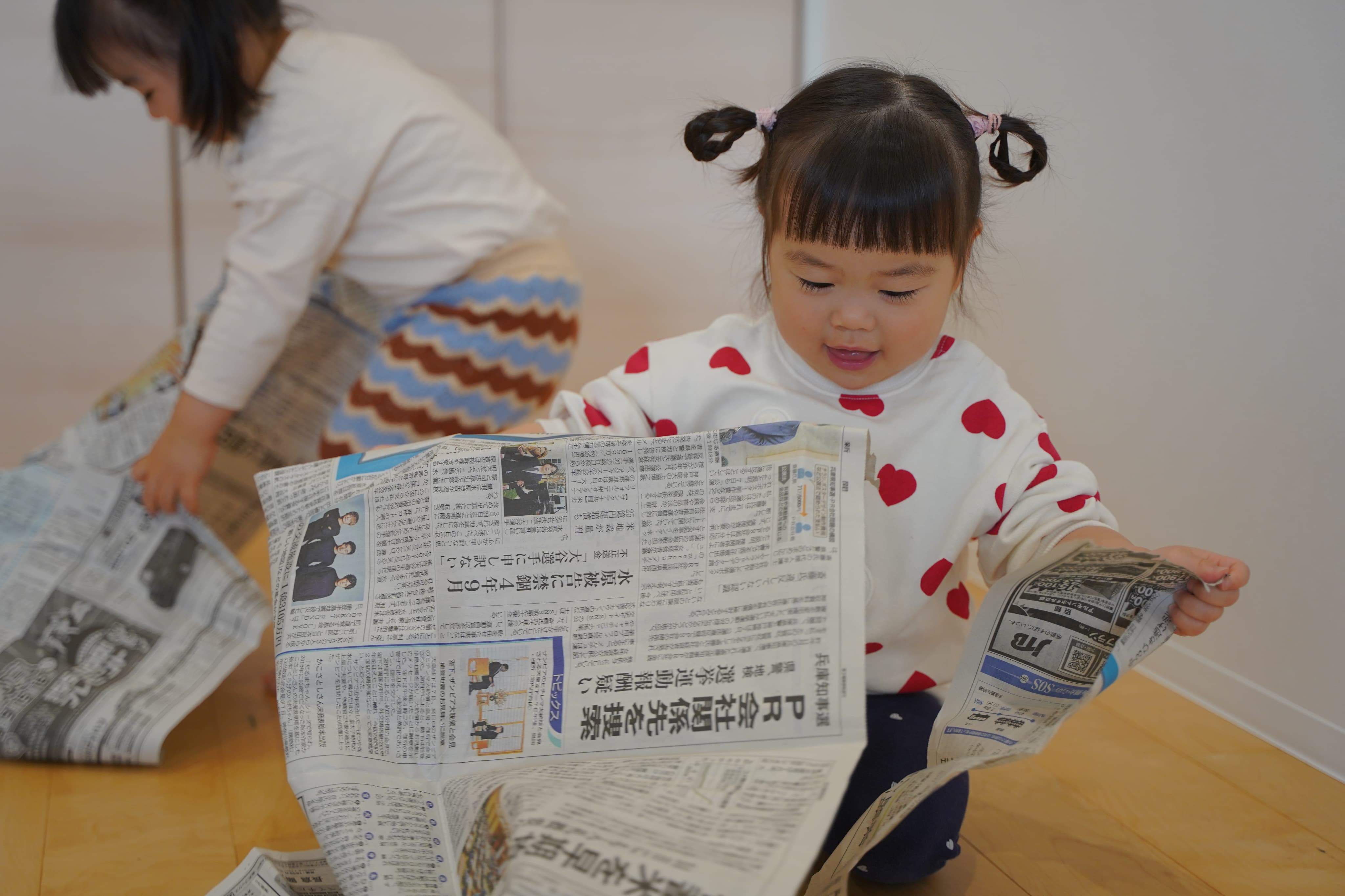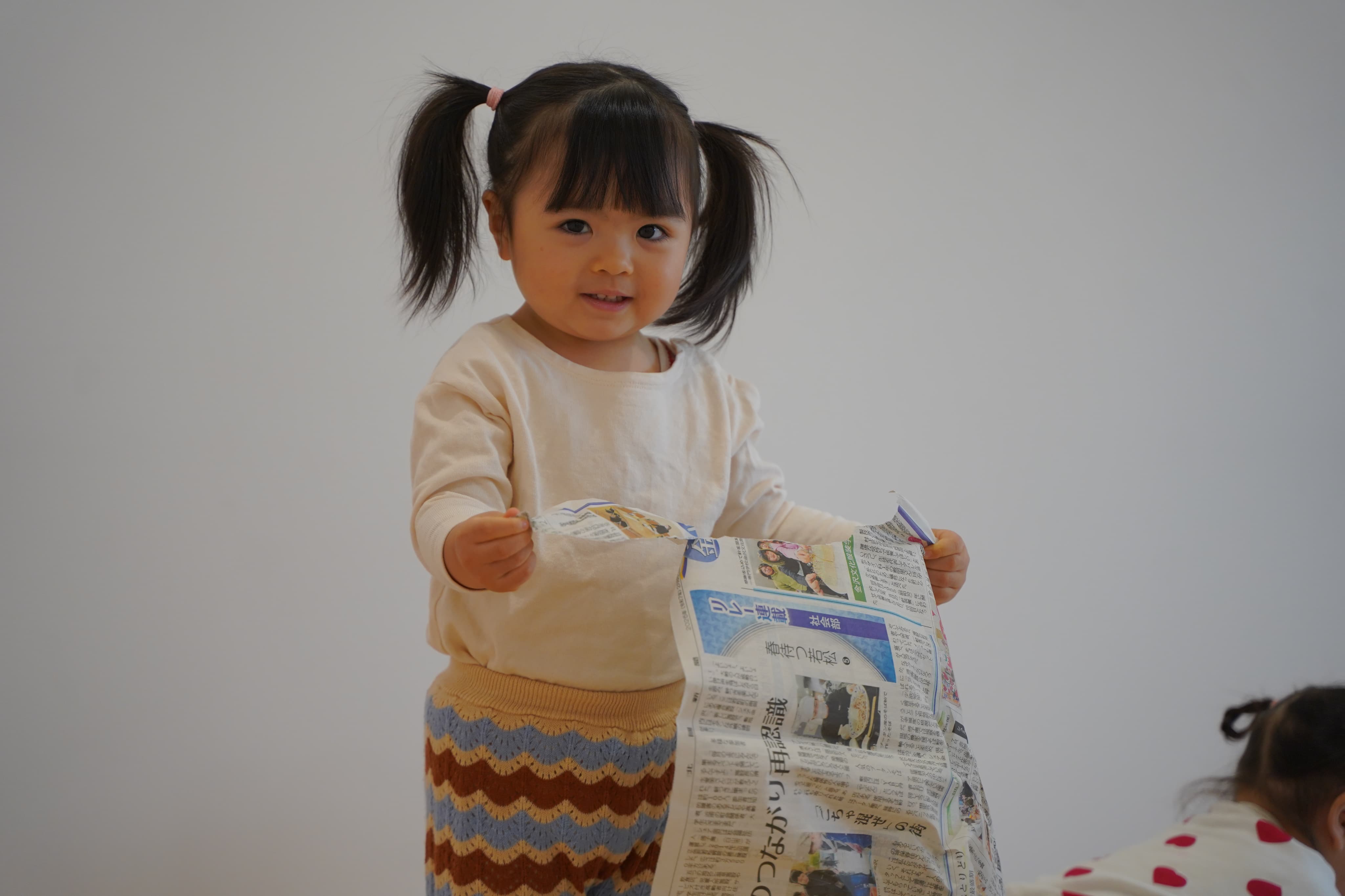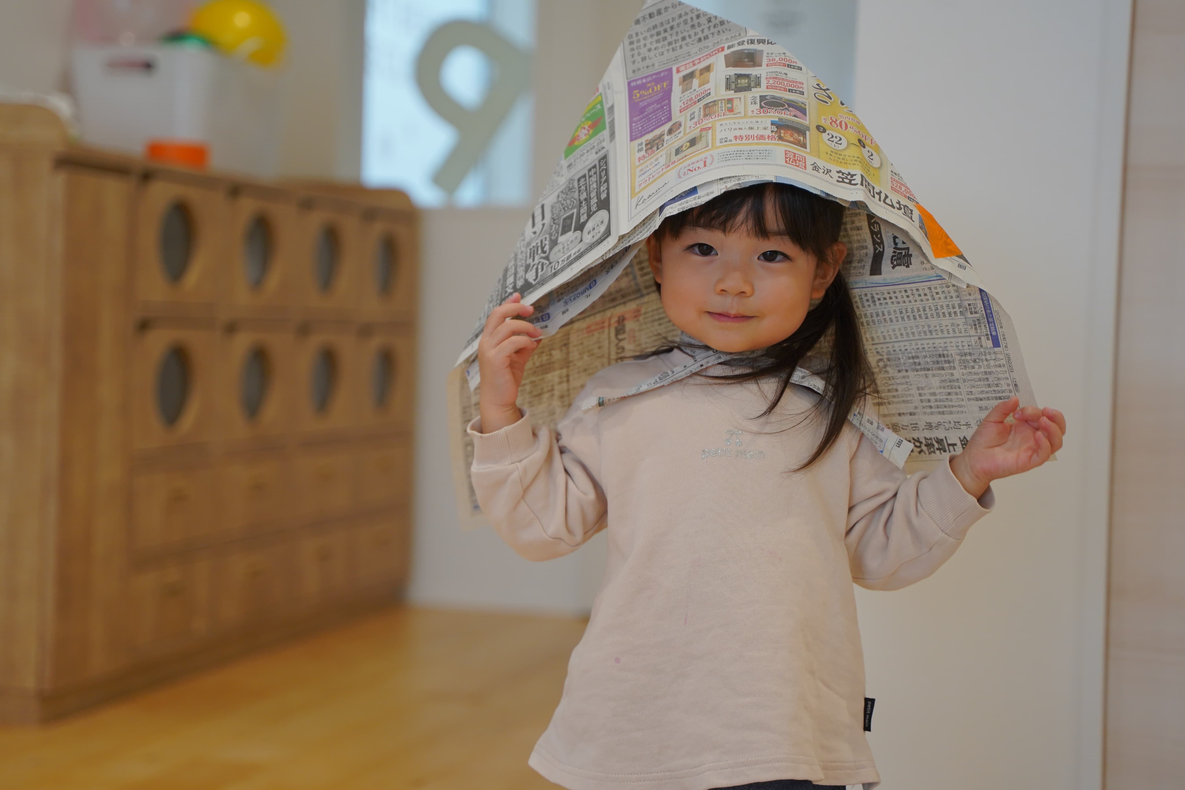 新聞マントをつけてアンパンマンになりきる子どもたち✨
