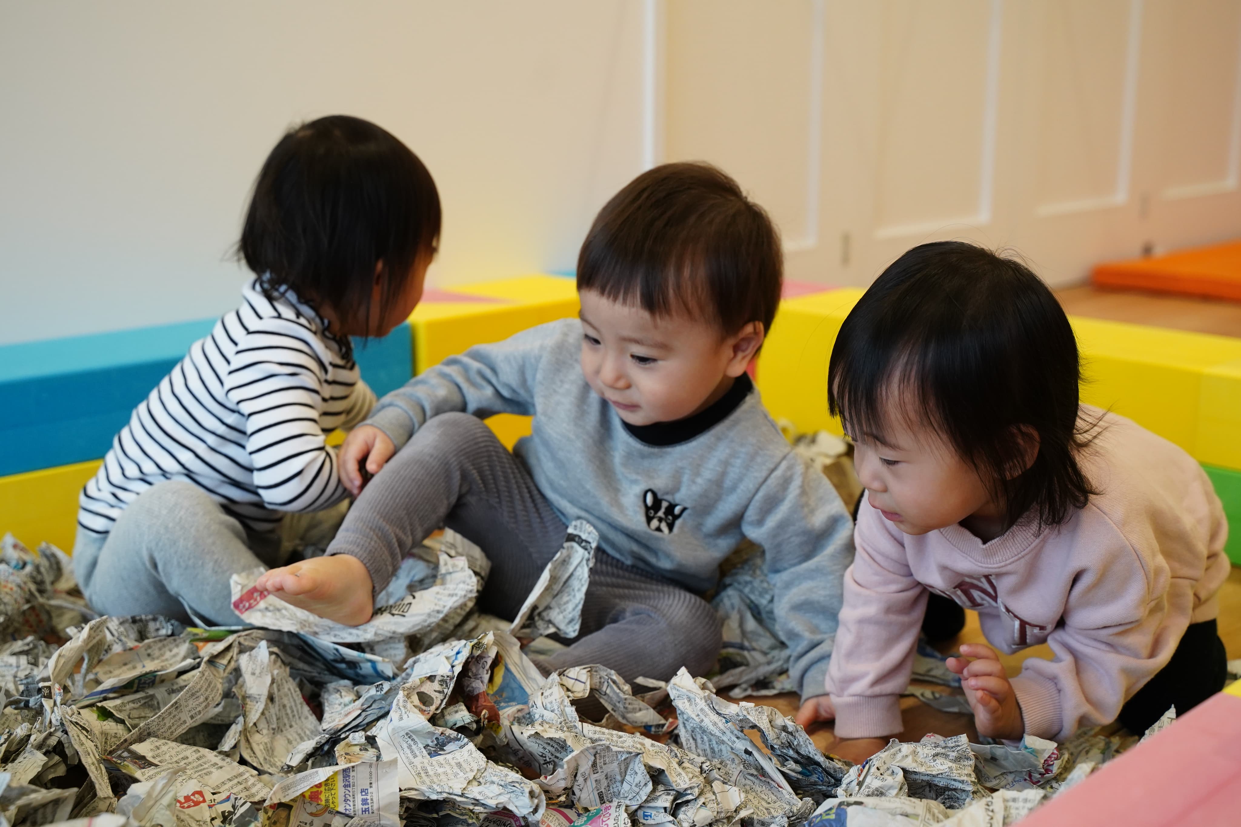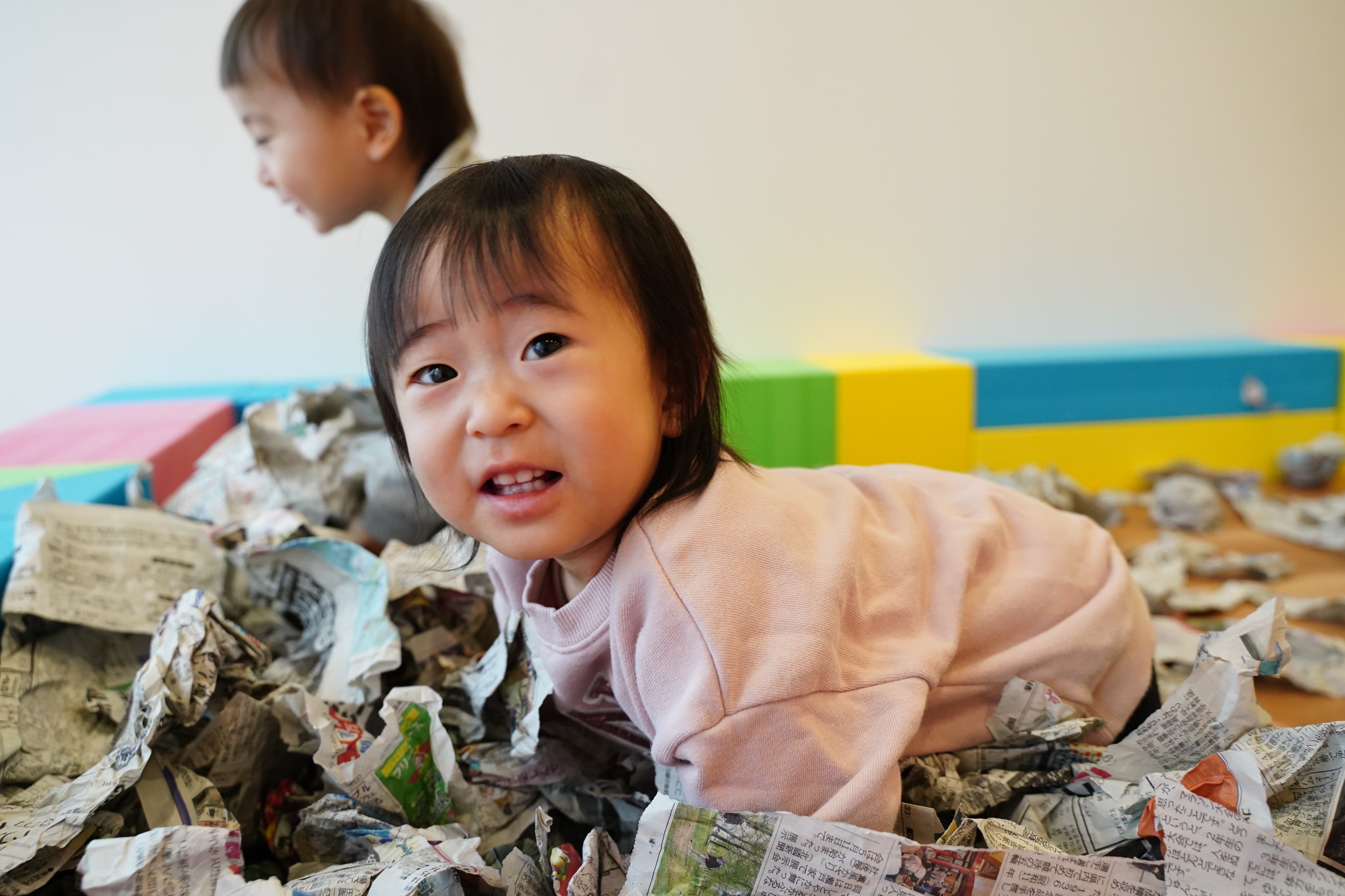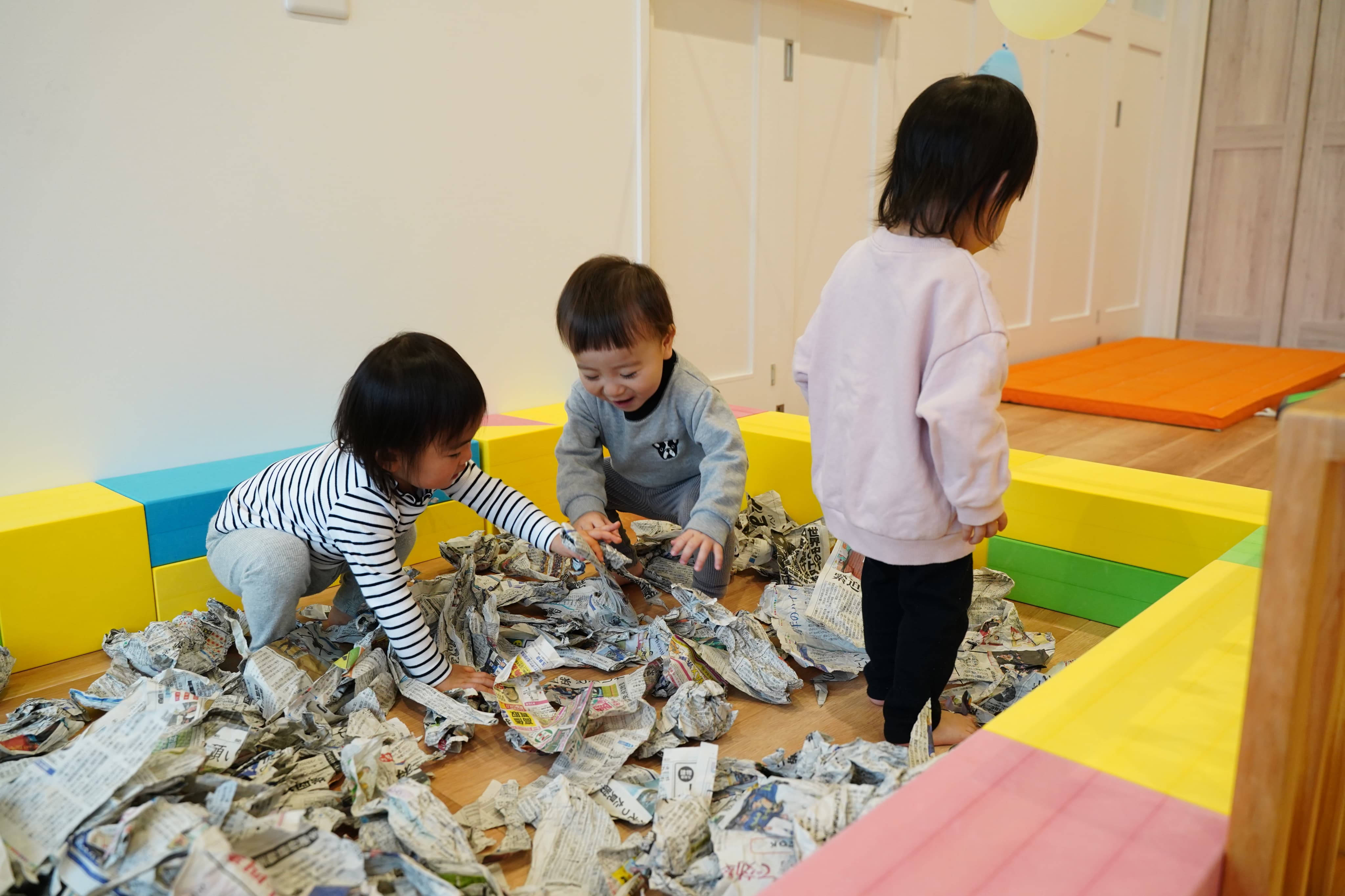 今日はプレイルームで久しぶりに新聞紙遊びをしました。