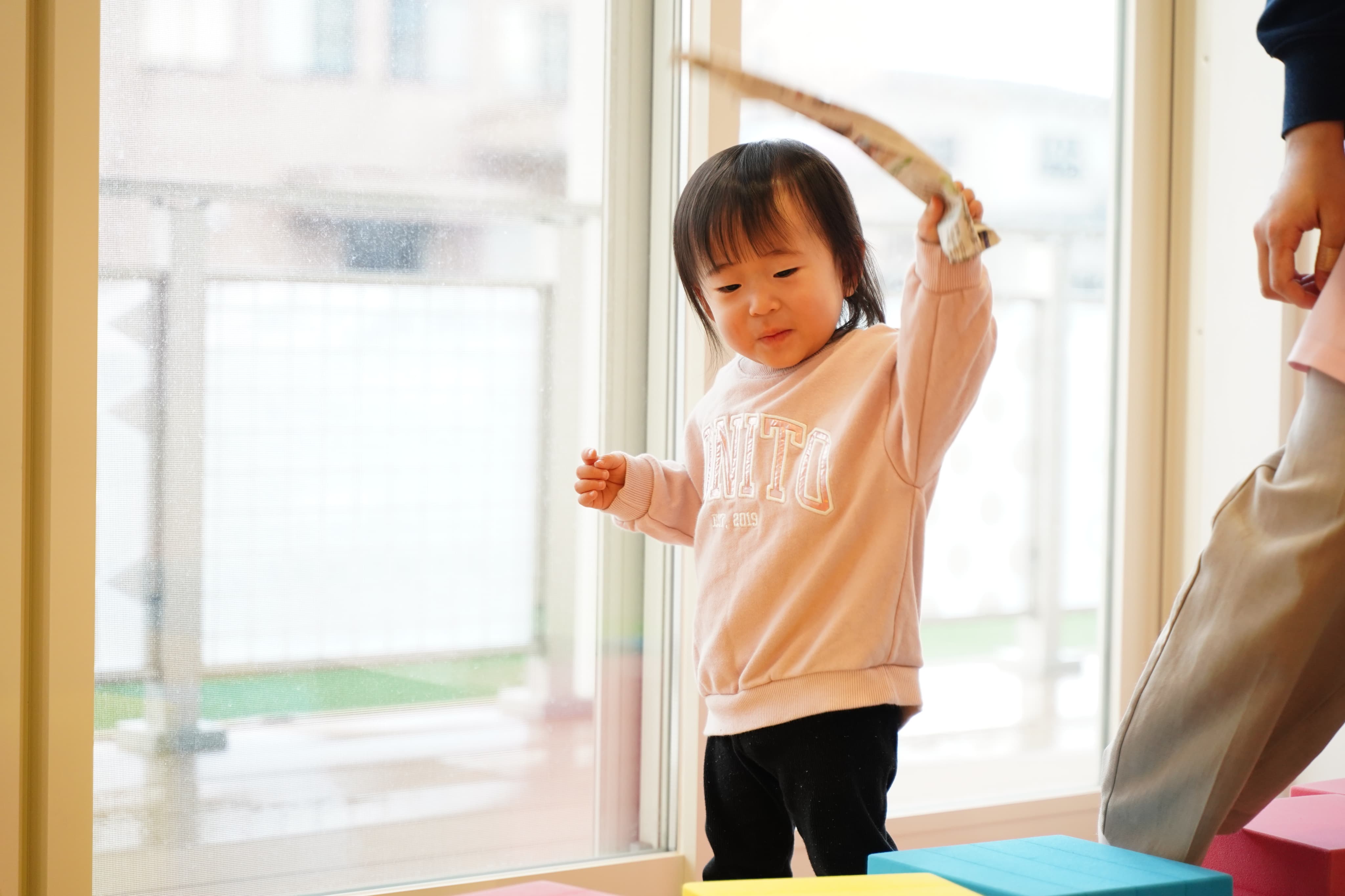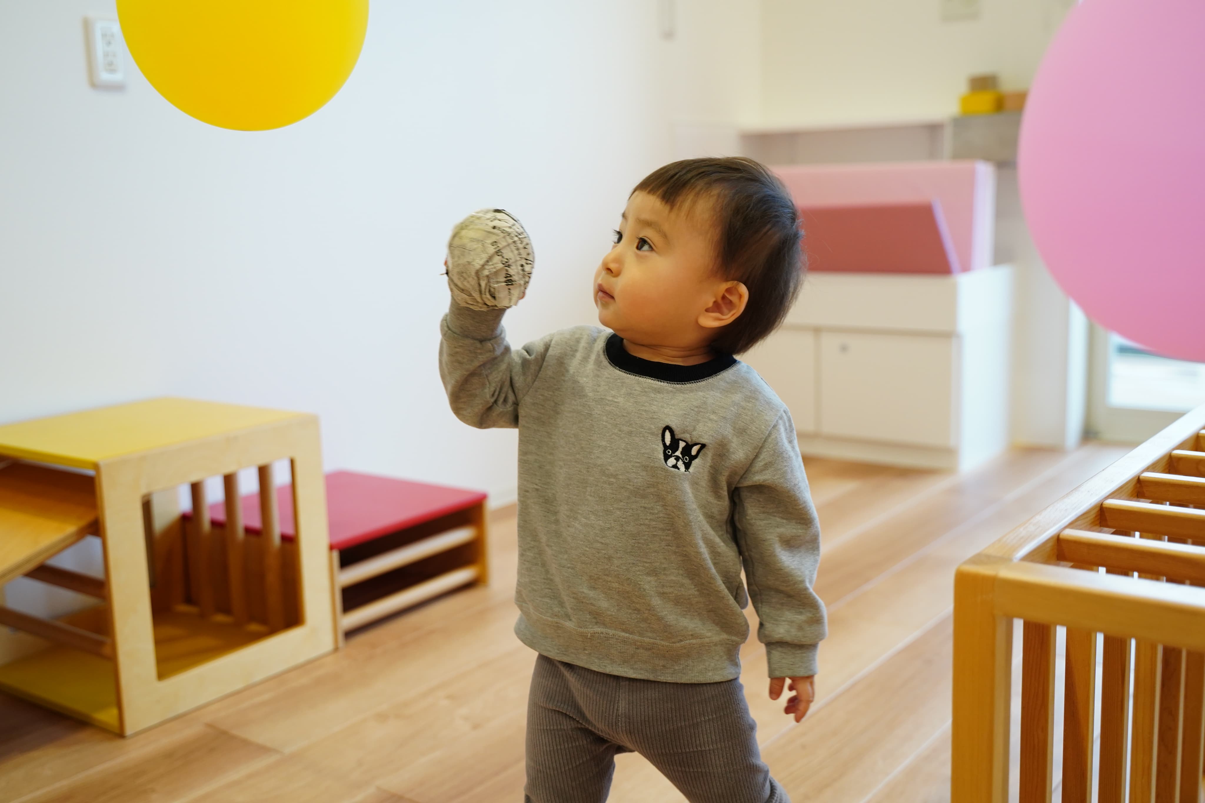 新聞紙で棒状のものを作って渡すと、それを使って風船を叩いてみようとする子もいましたよ。