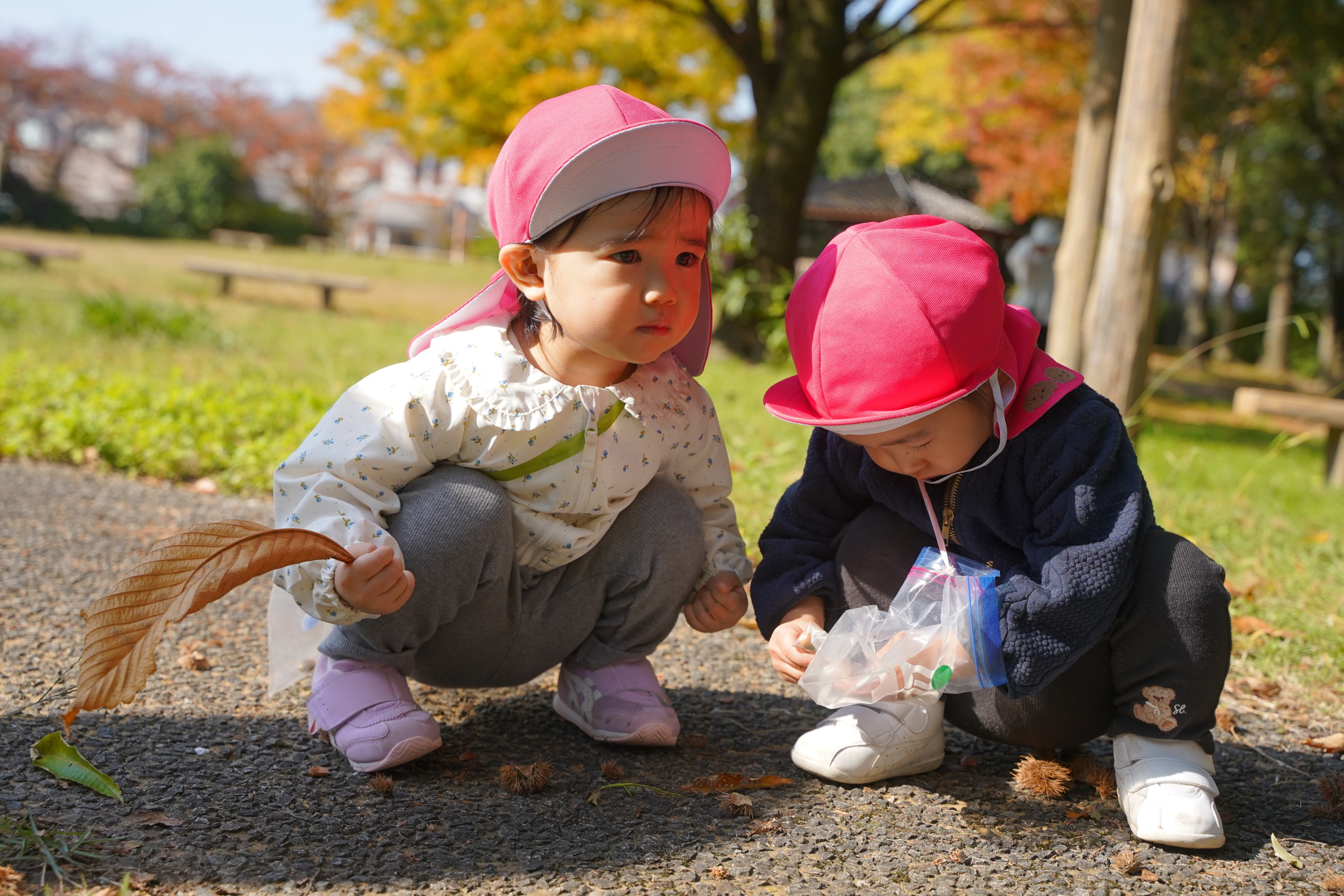 どんぐりや落ち葉、栗の実をお散歩バックに入れていました!