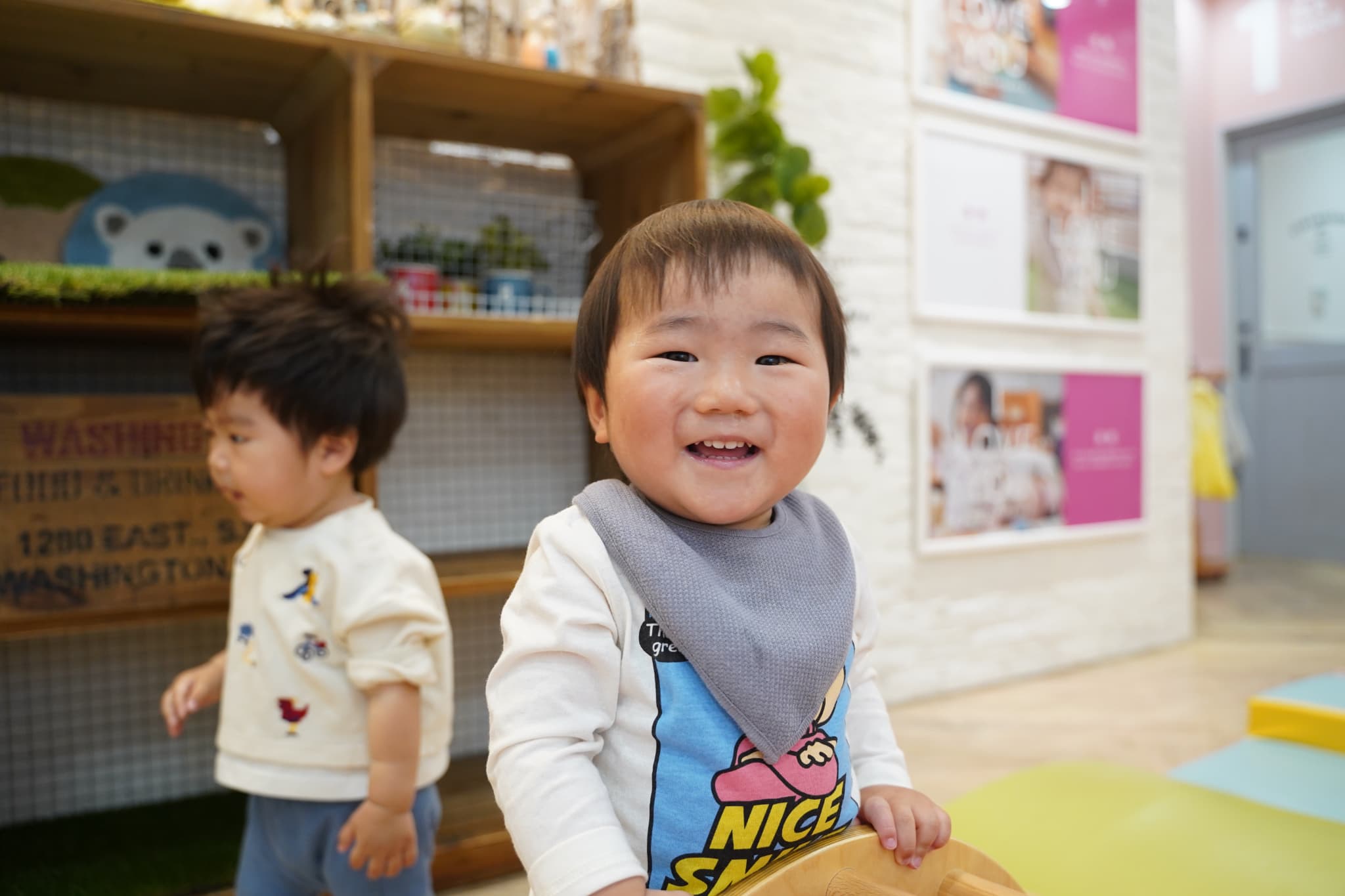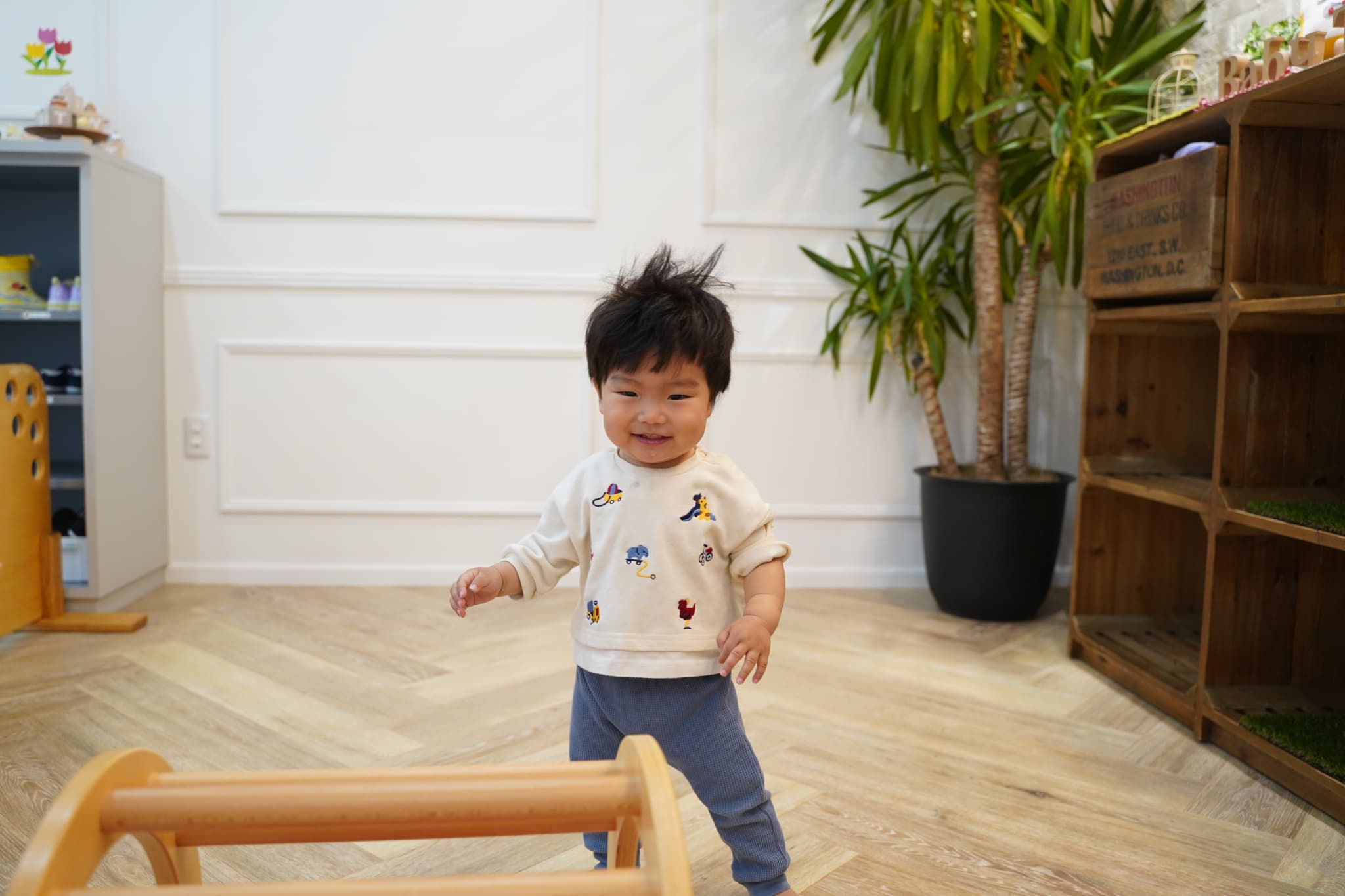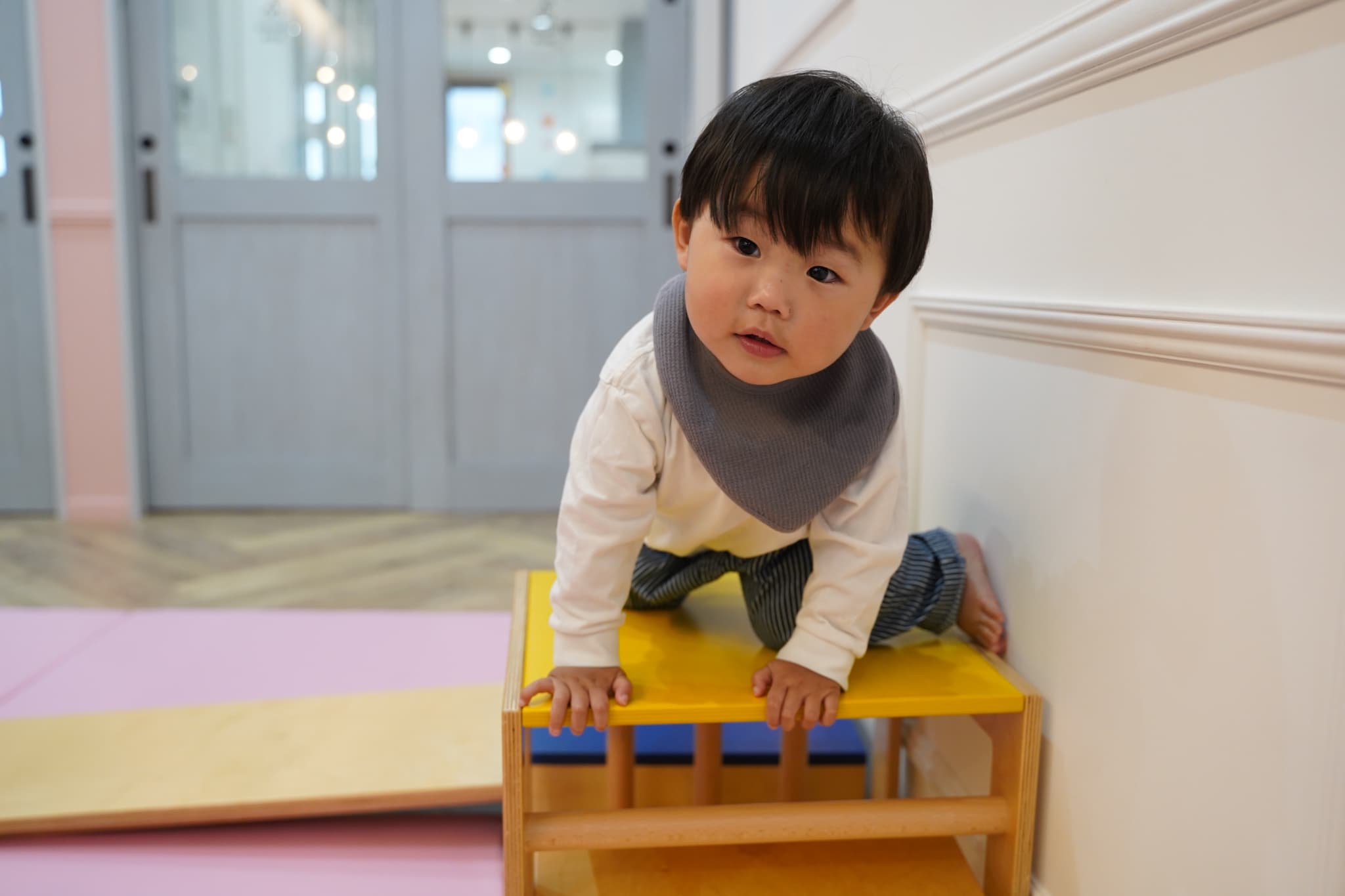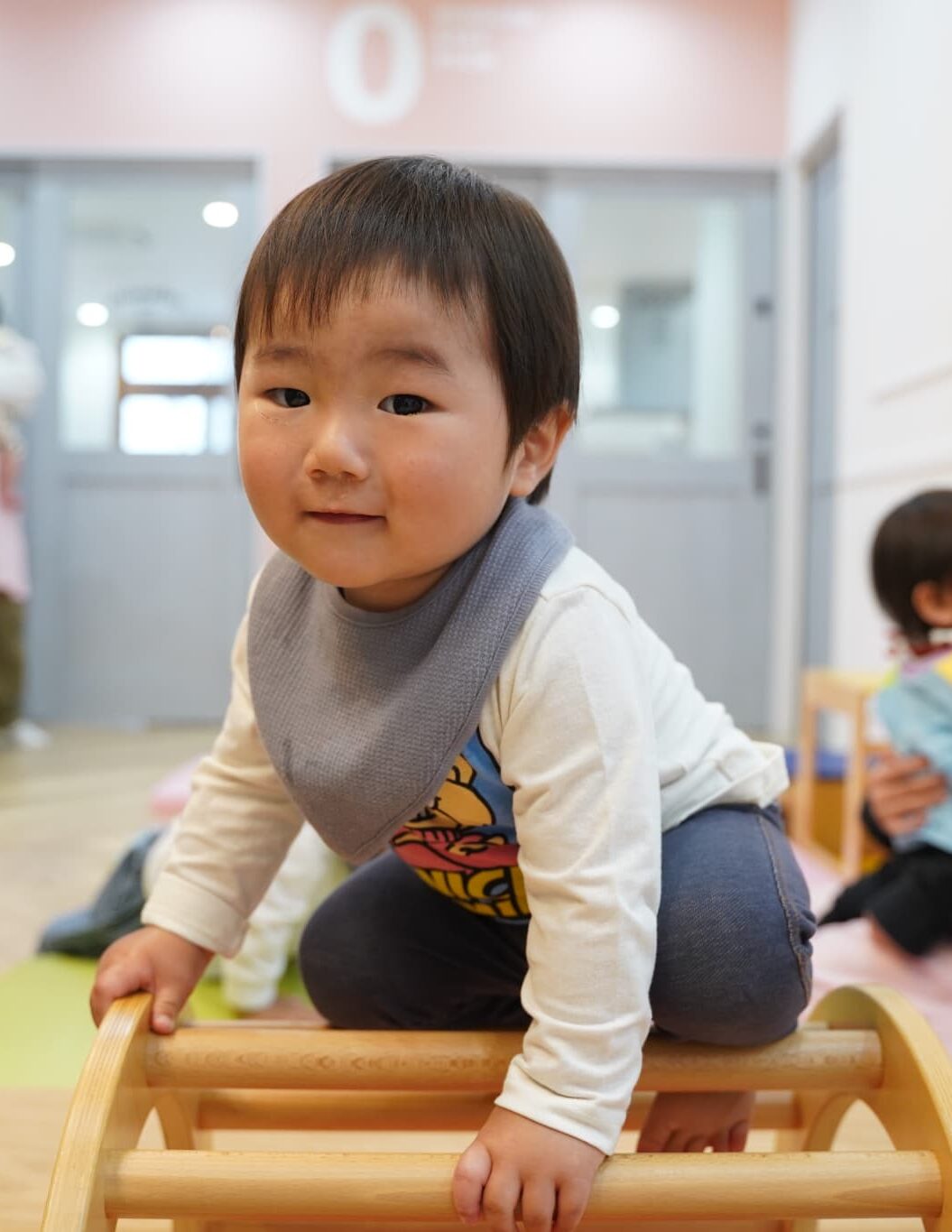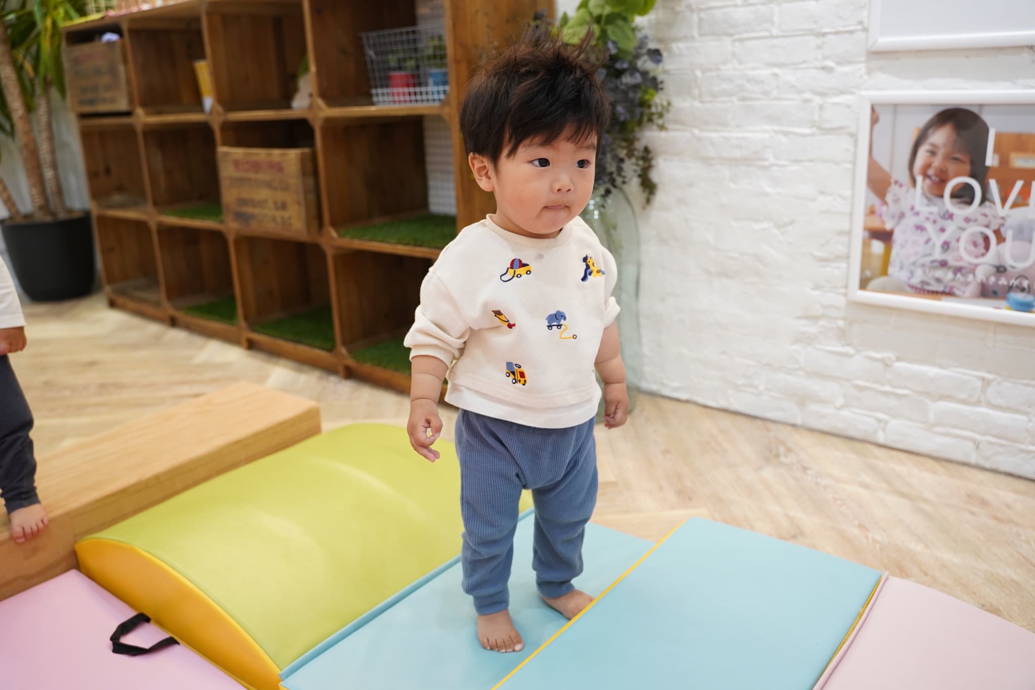 プレイキューブの上に立ってみたり、穴をくぐってみたりと活発に体を動かす子どもたちでした!