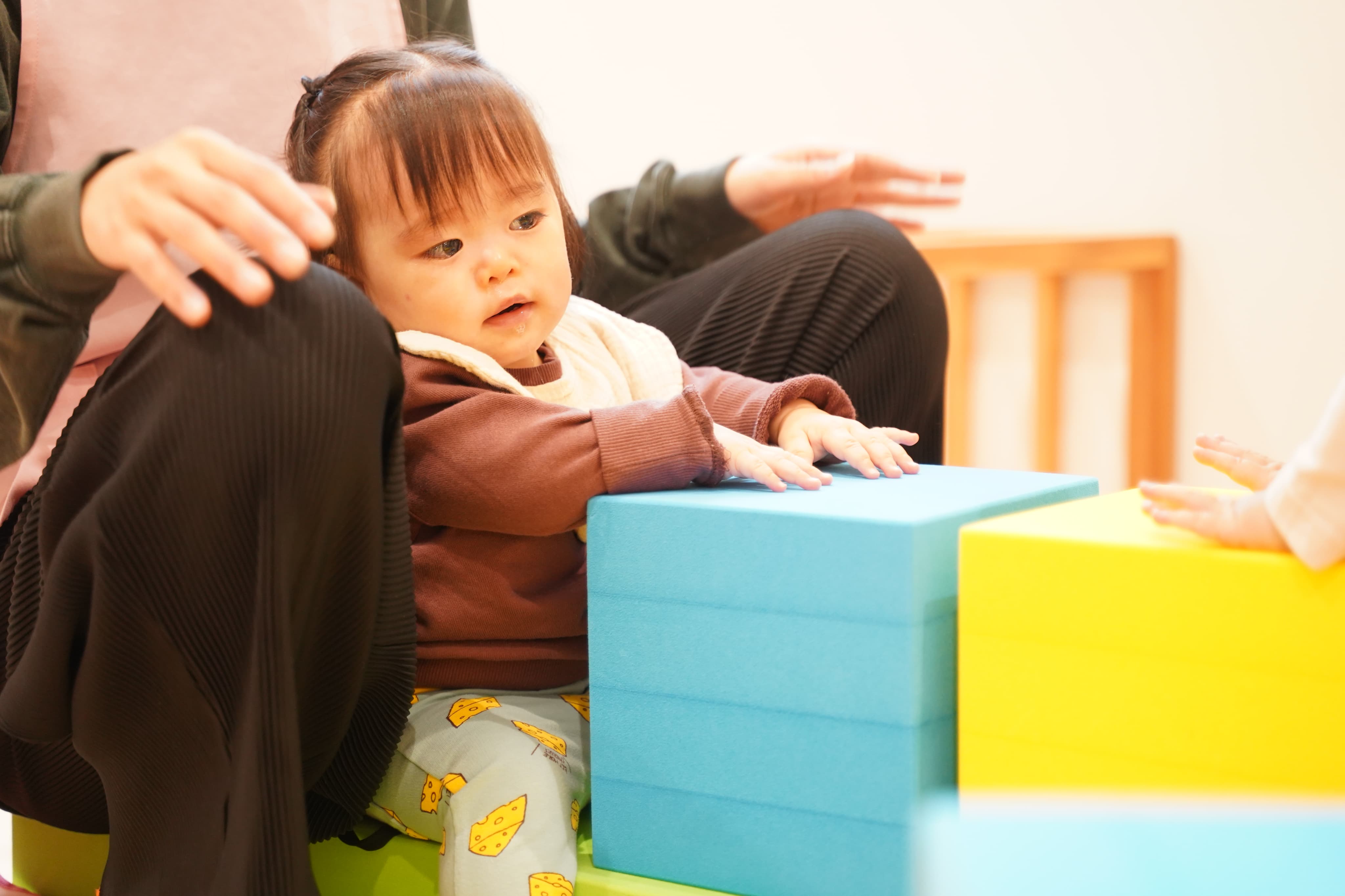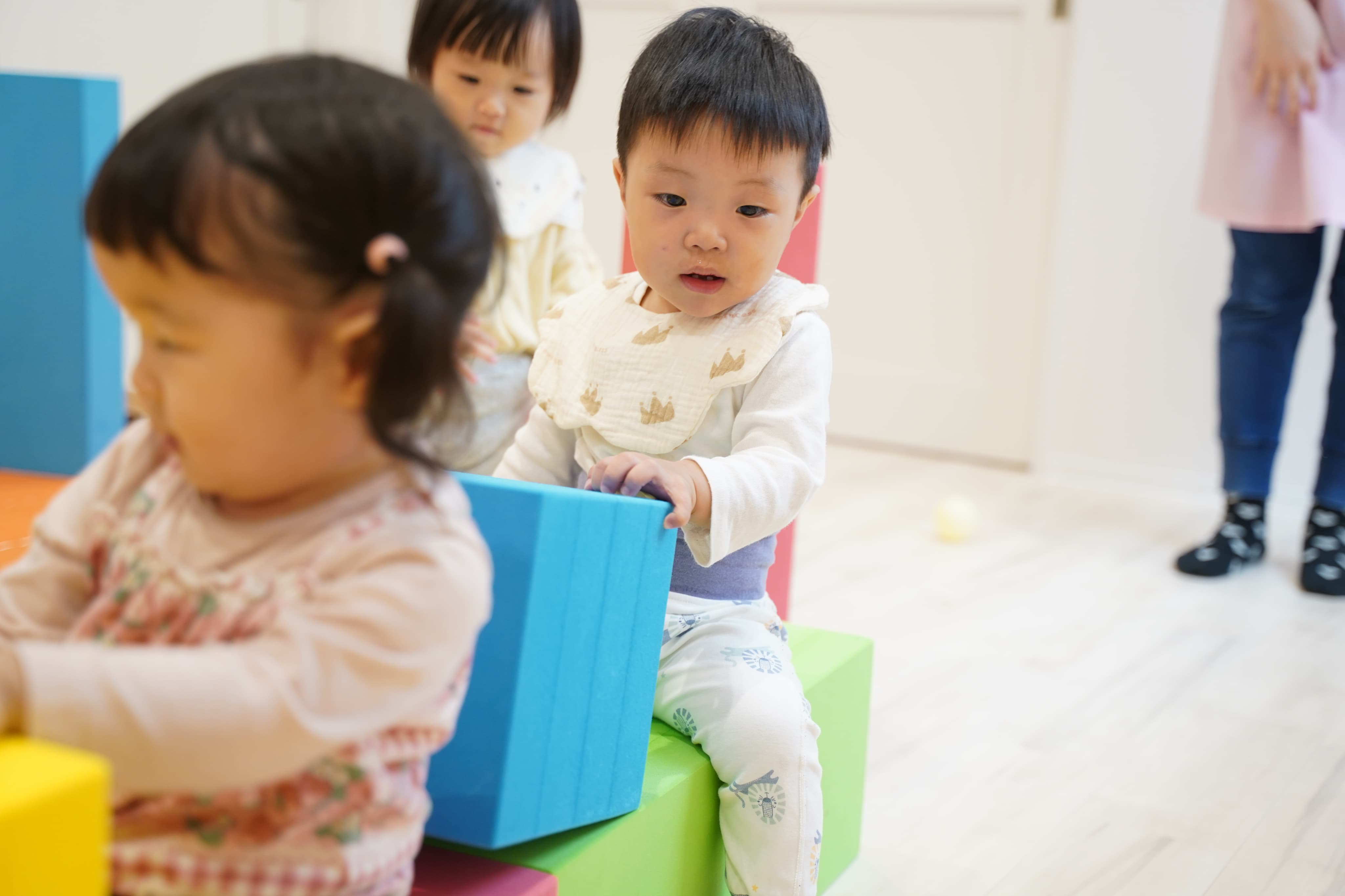 プレイルームでは、ソフト積み木を並べてバスごっこ!🚌