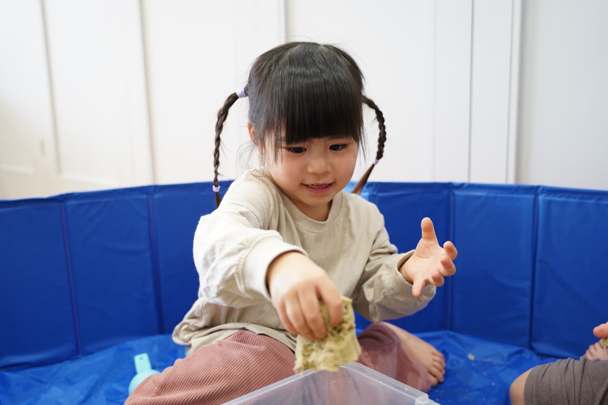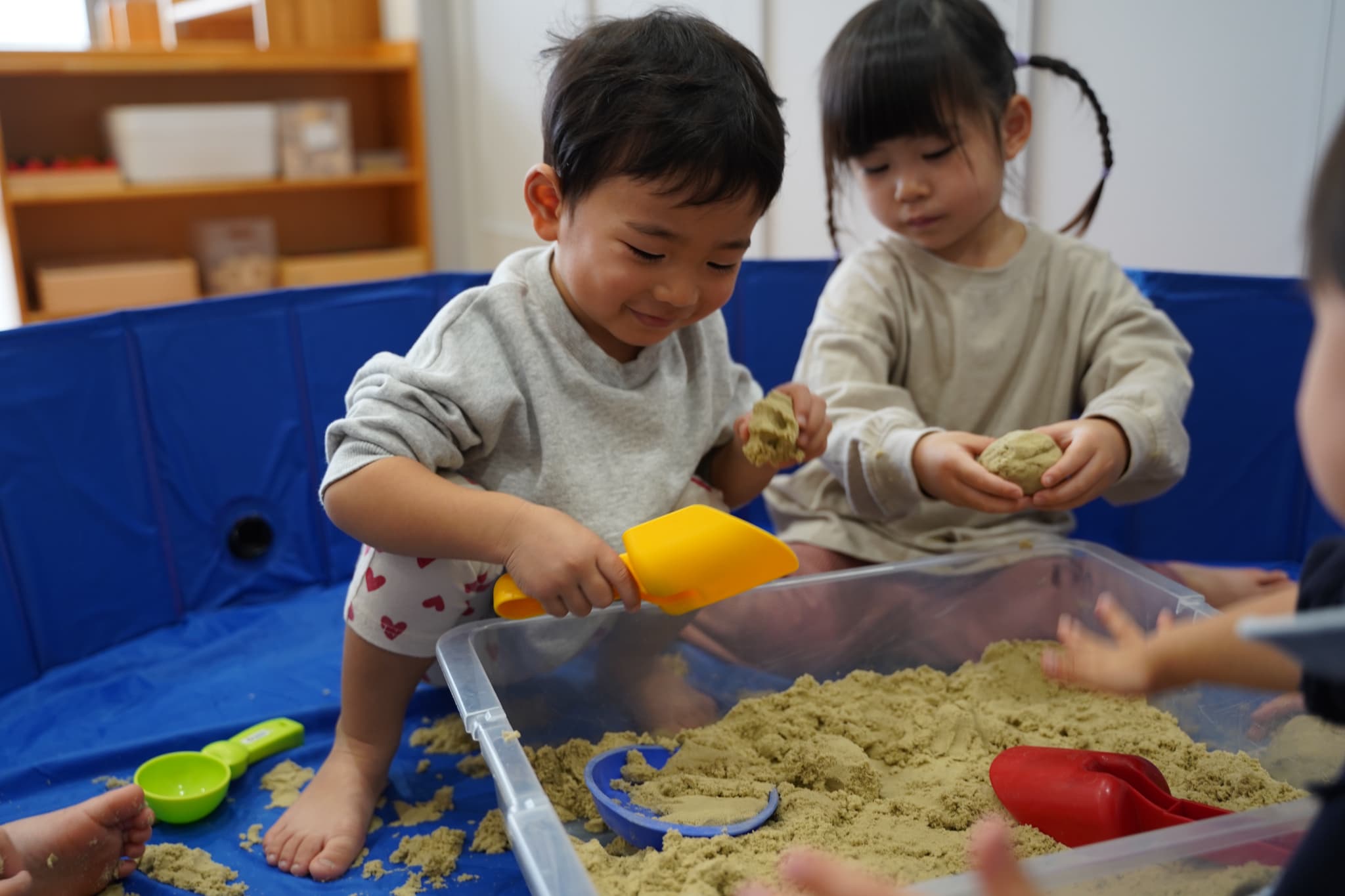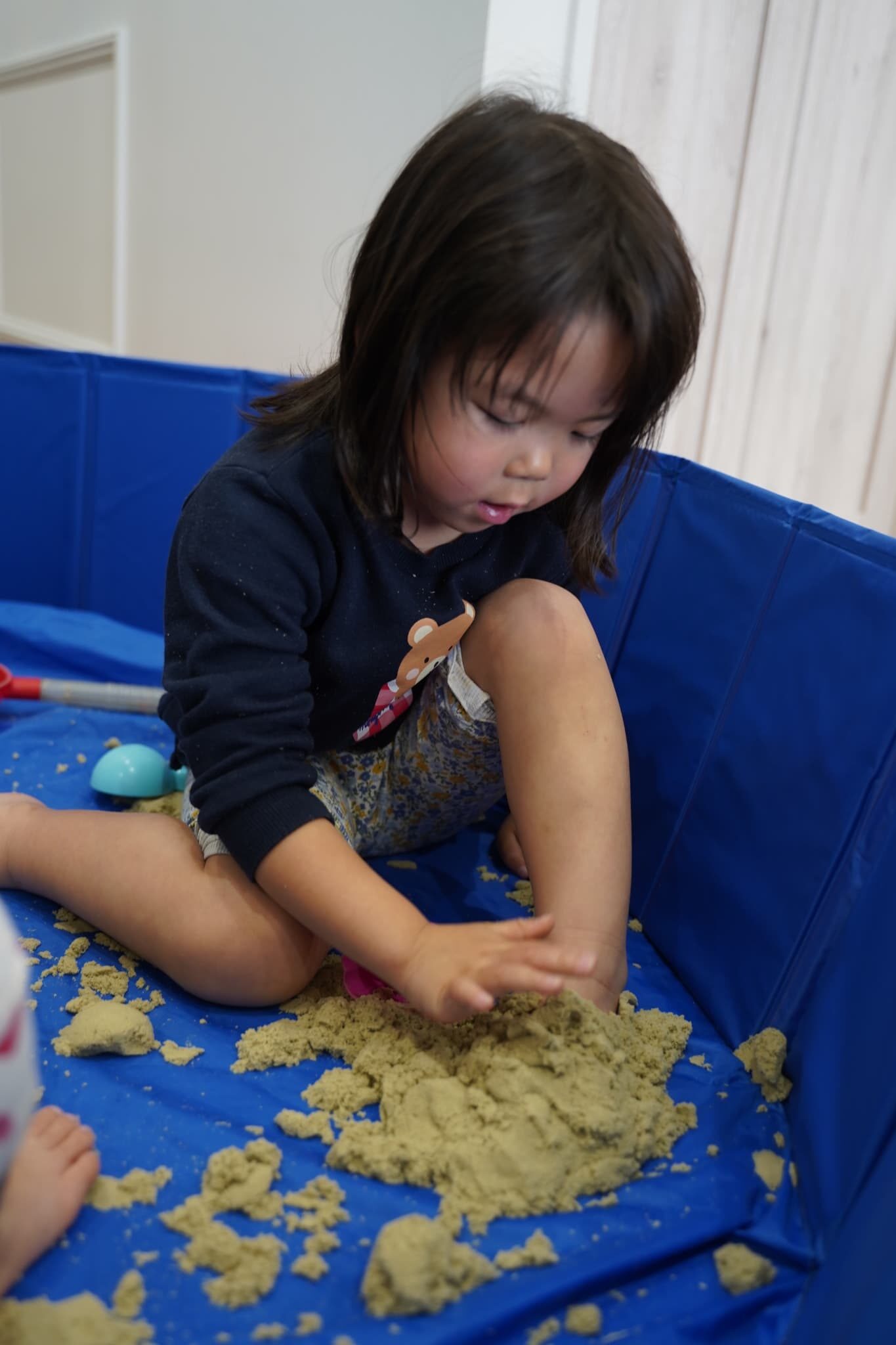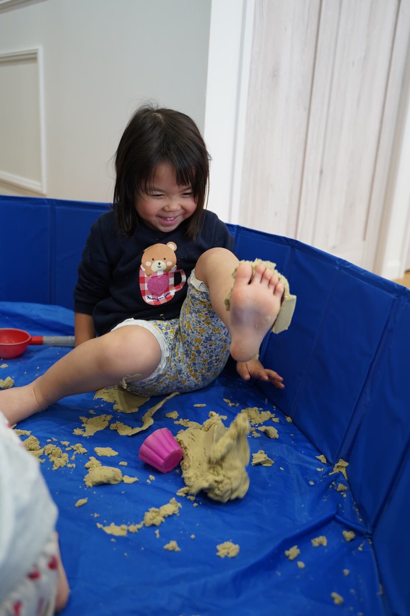 お外の砂場ではなかなかできない、ダイナミックに裸足で砂を感じれるのも室内砂遊びの面白いところです🤭
