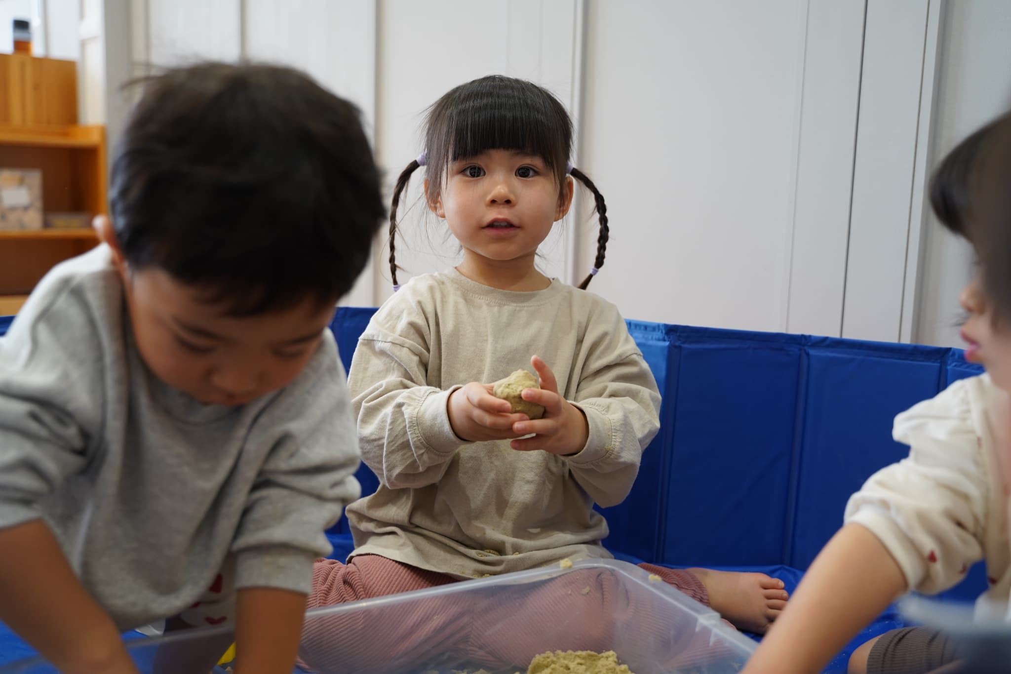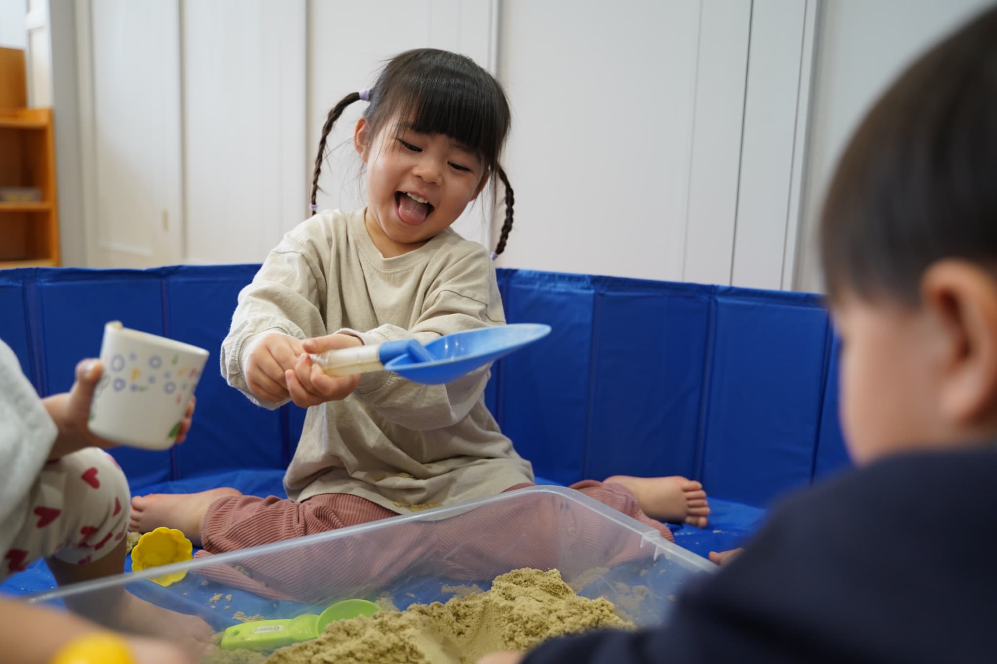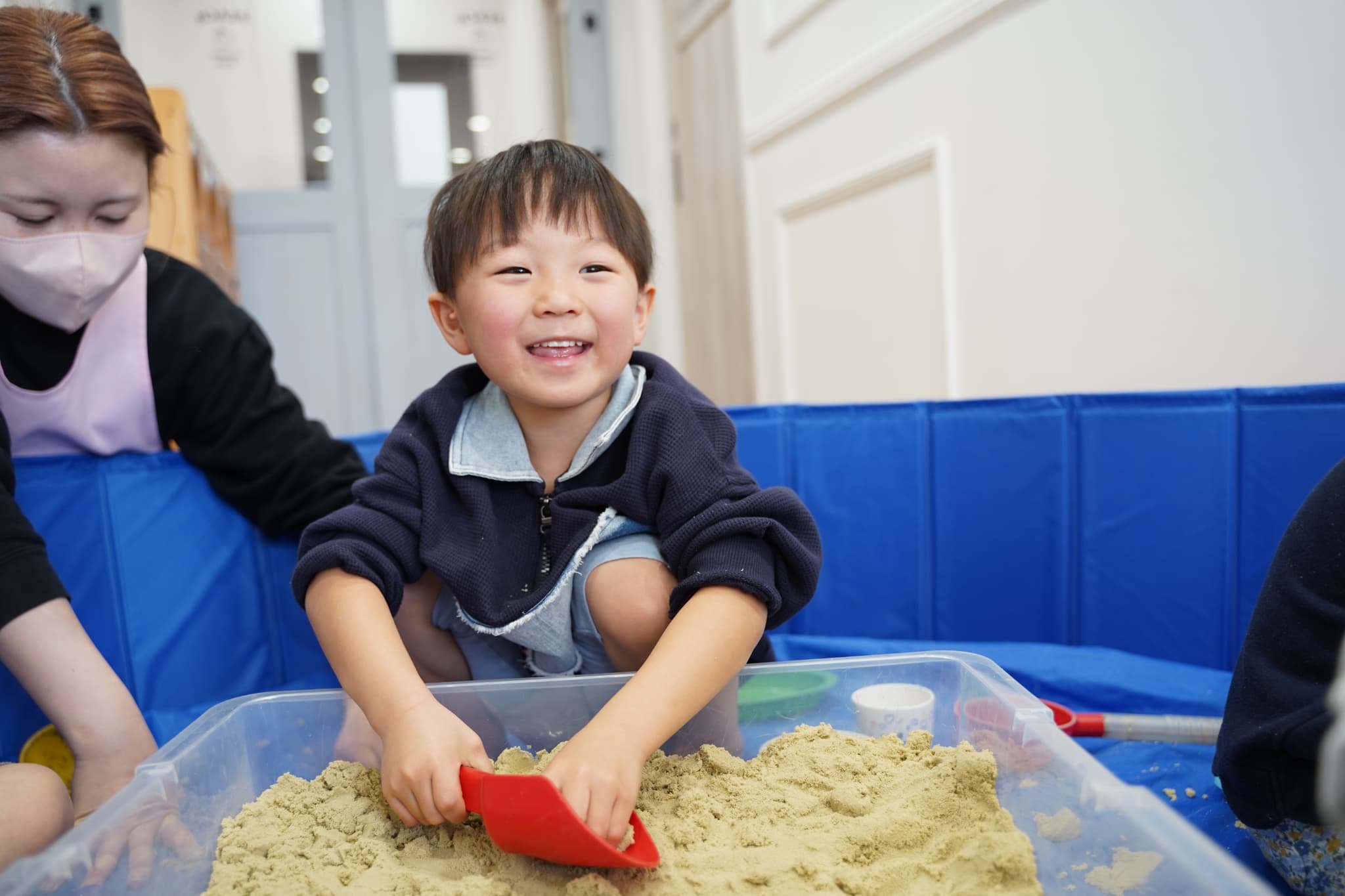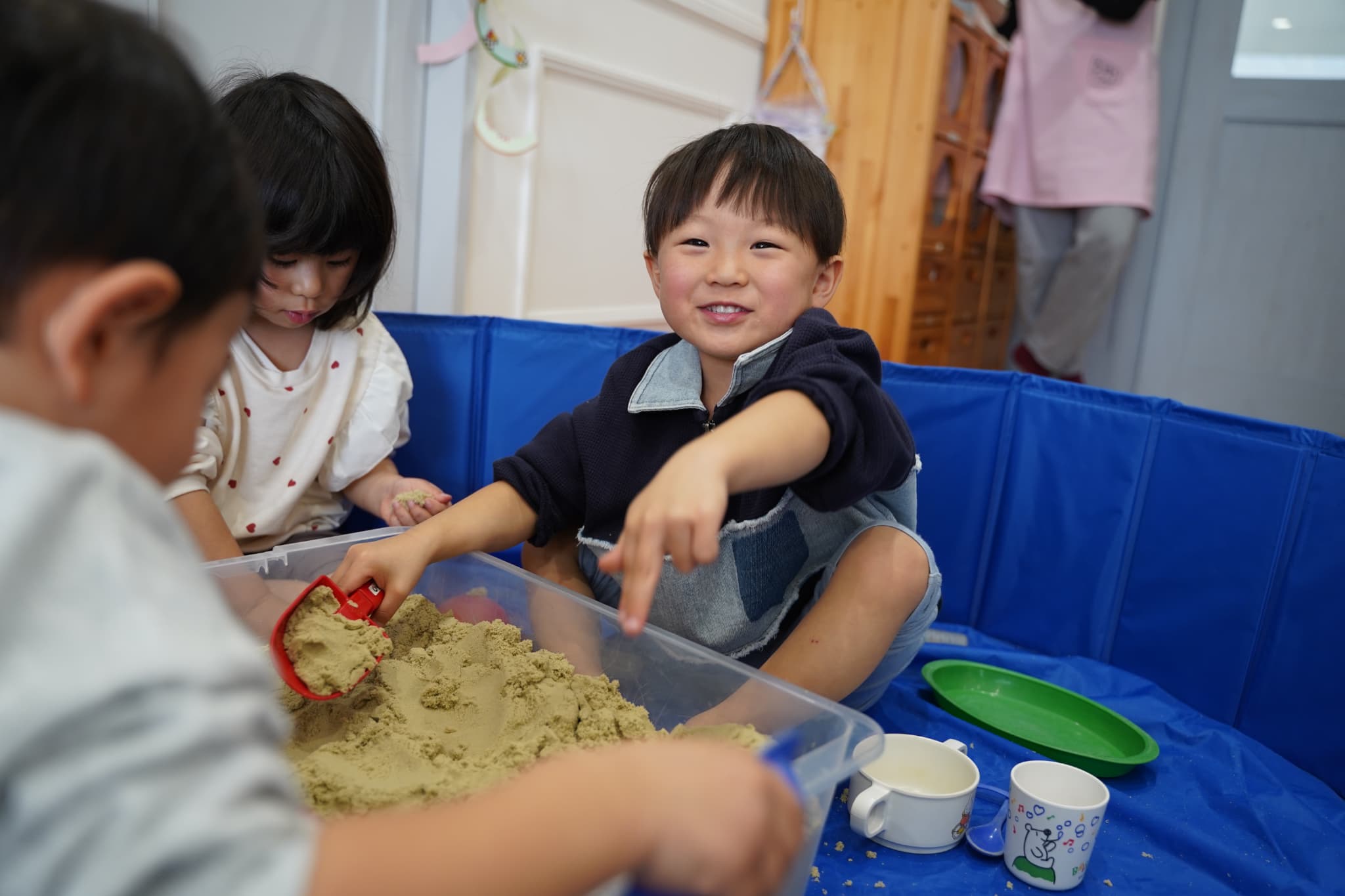 お外の砂場ではなかなかできない、ダイナミックに裸足で砂を感じれるのも室内砂遊びの面白いところです🤭