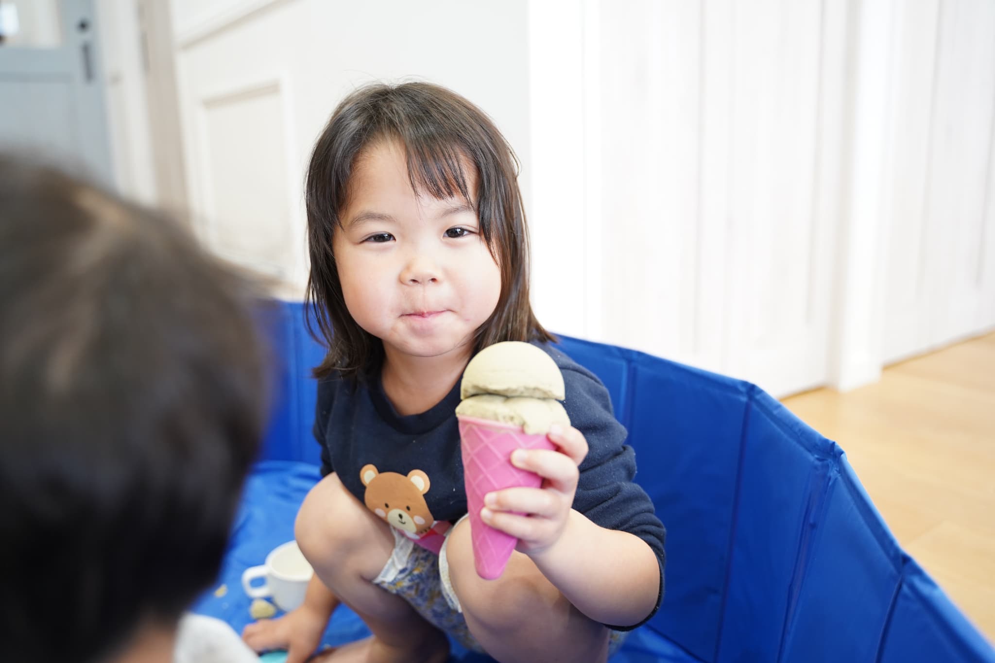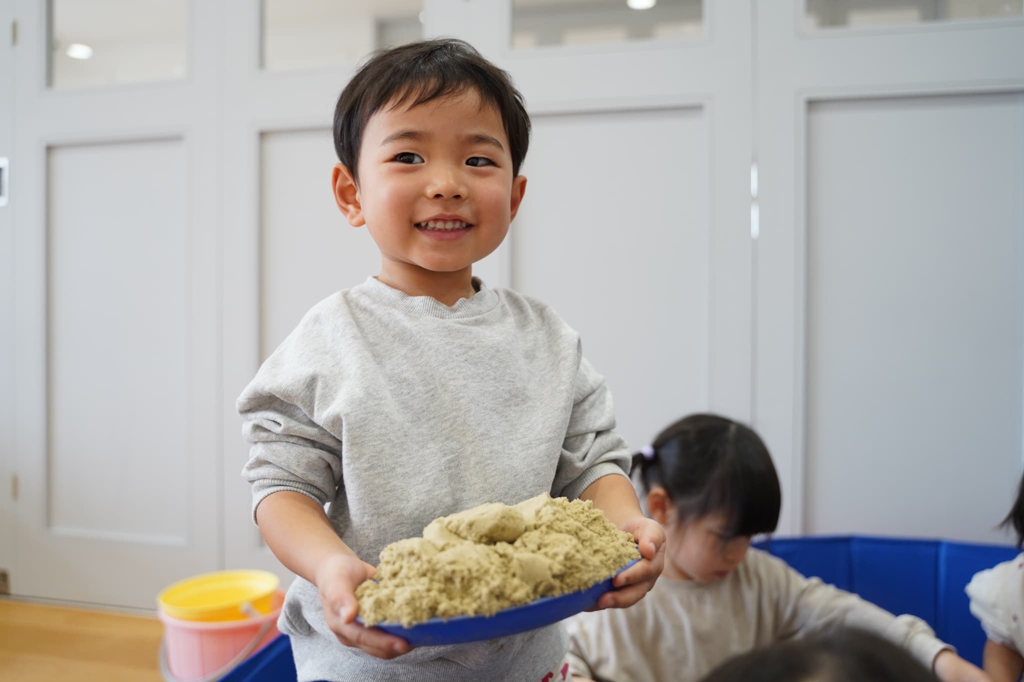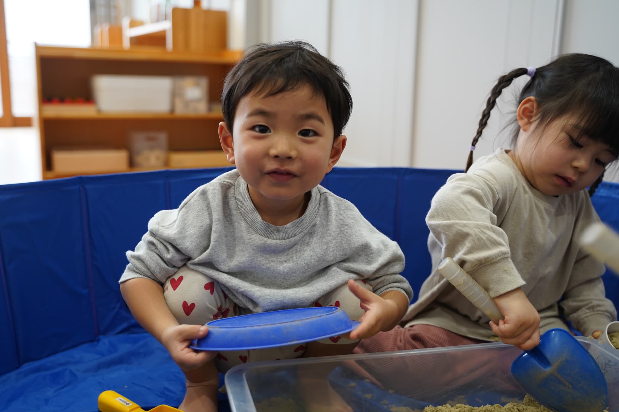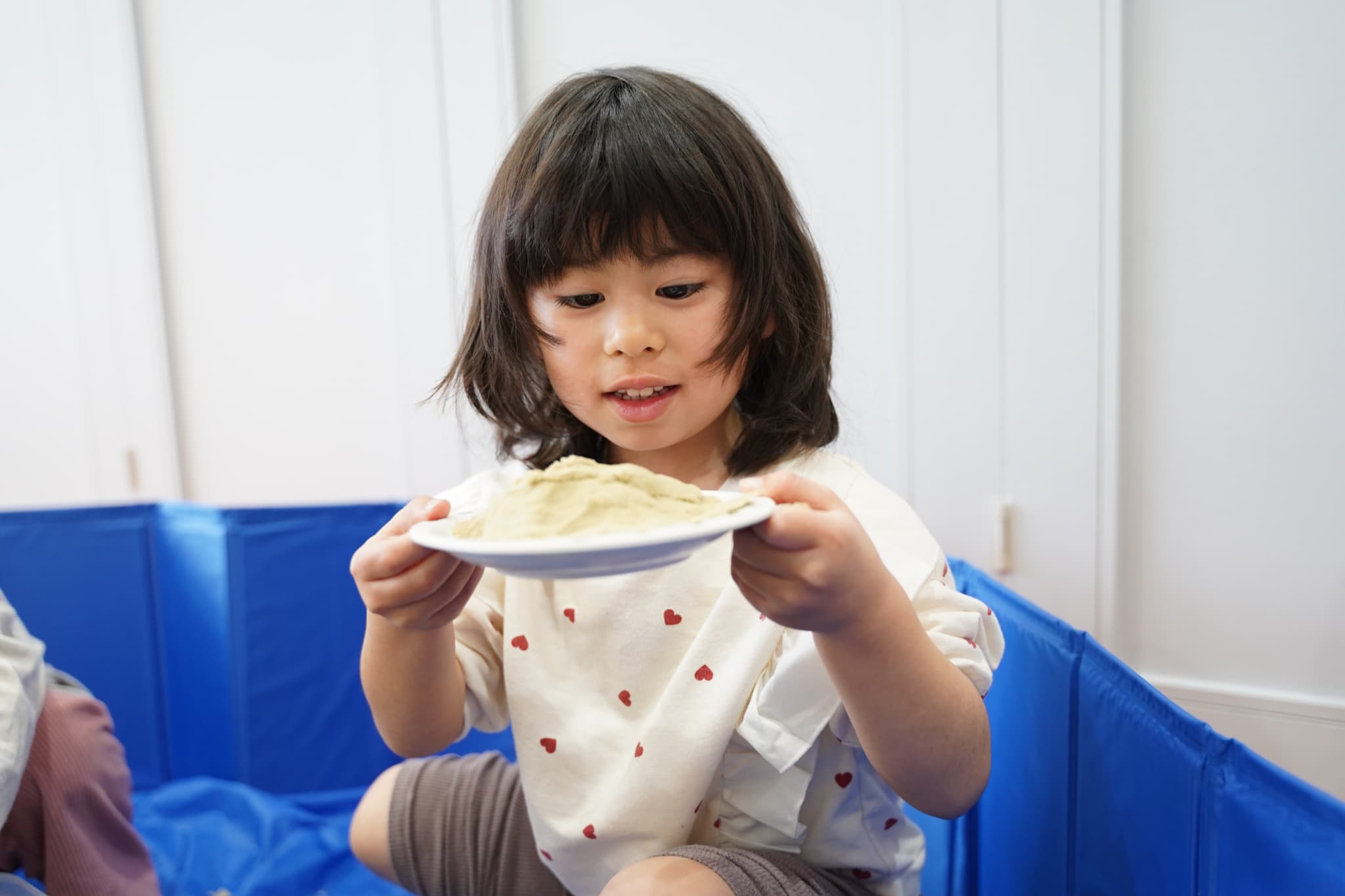 お外の砂場ではなかなかできない、ダイナミックに裸足で砂を感じれるのも室内砂遊びの面白いところです🤭