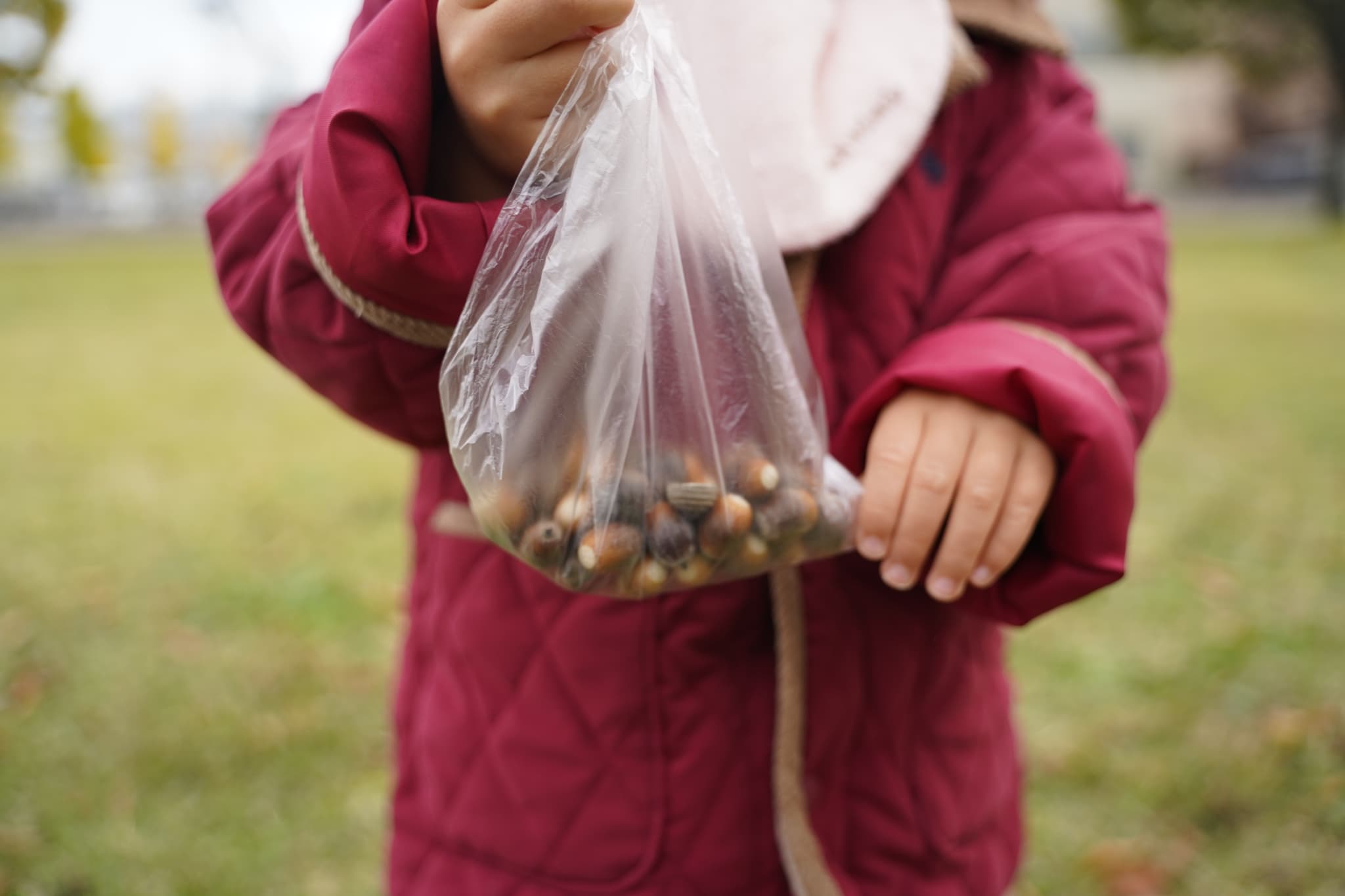 とってもたくさんのどんぐりが入った袋を