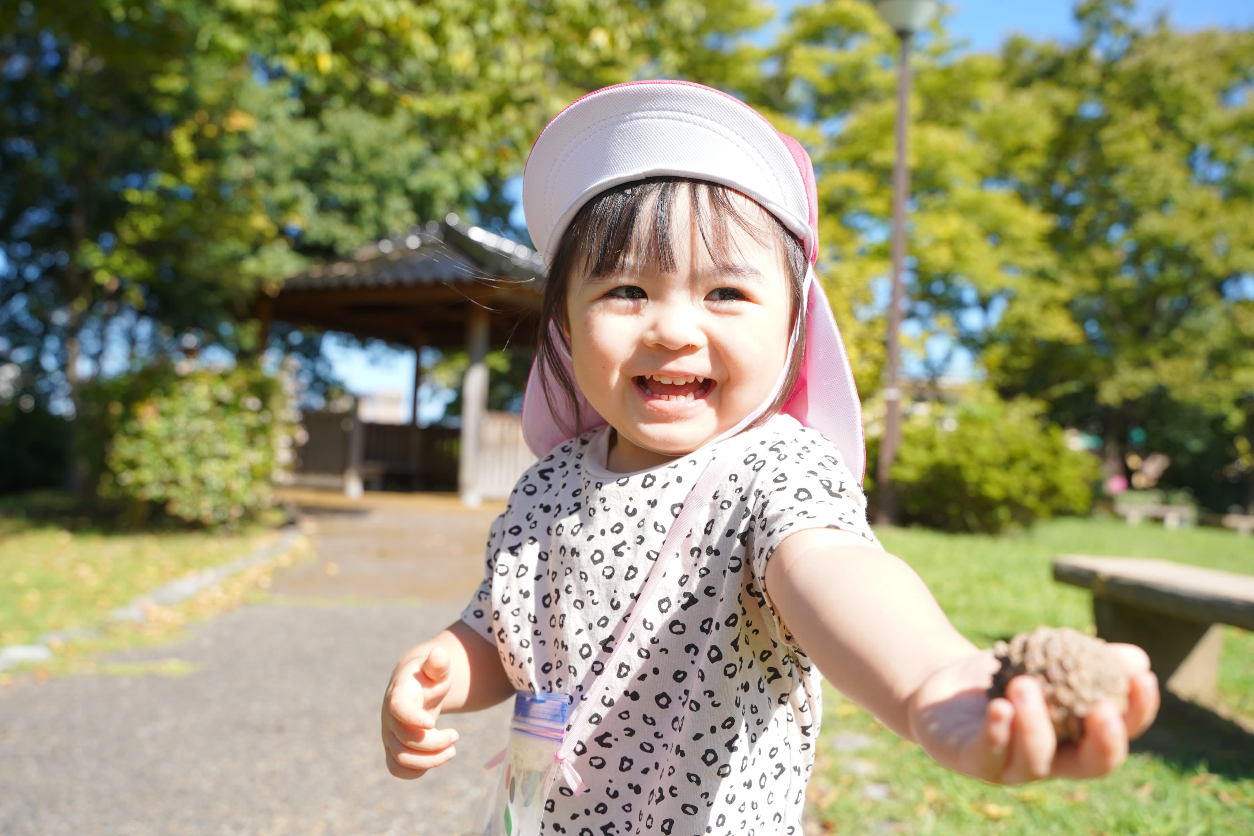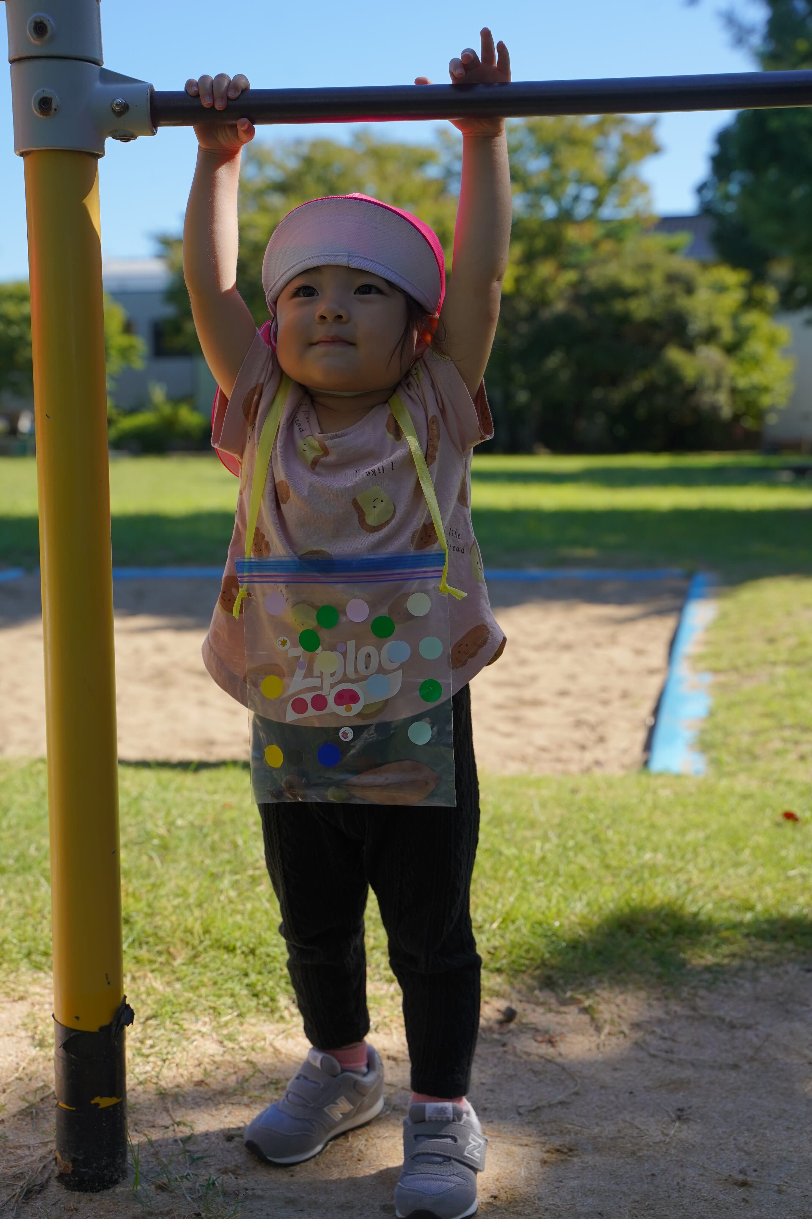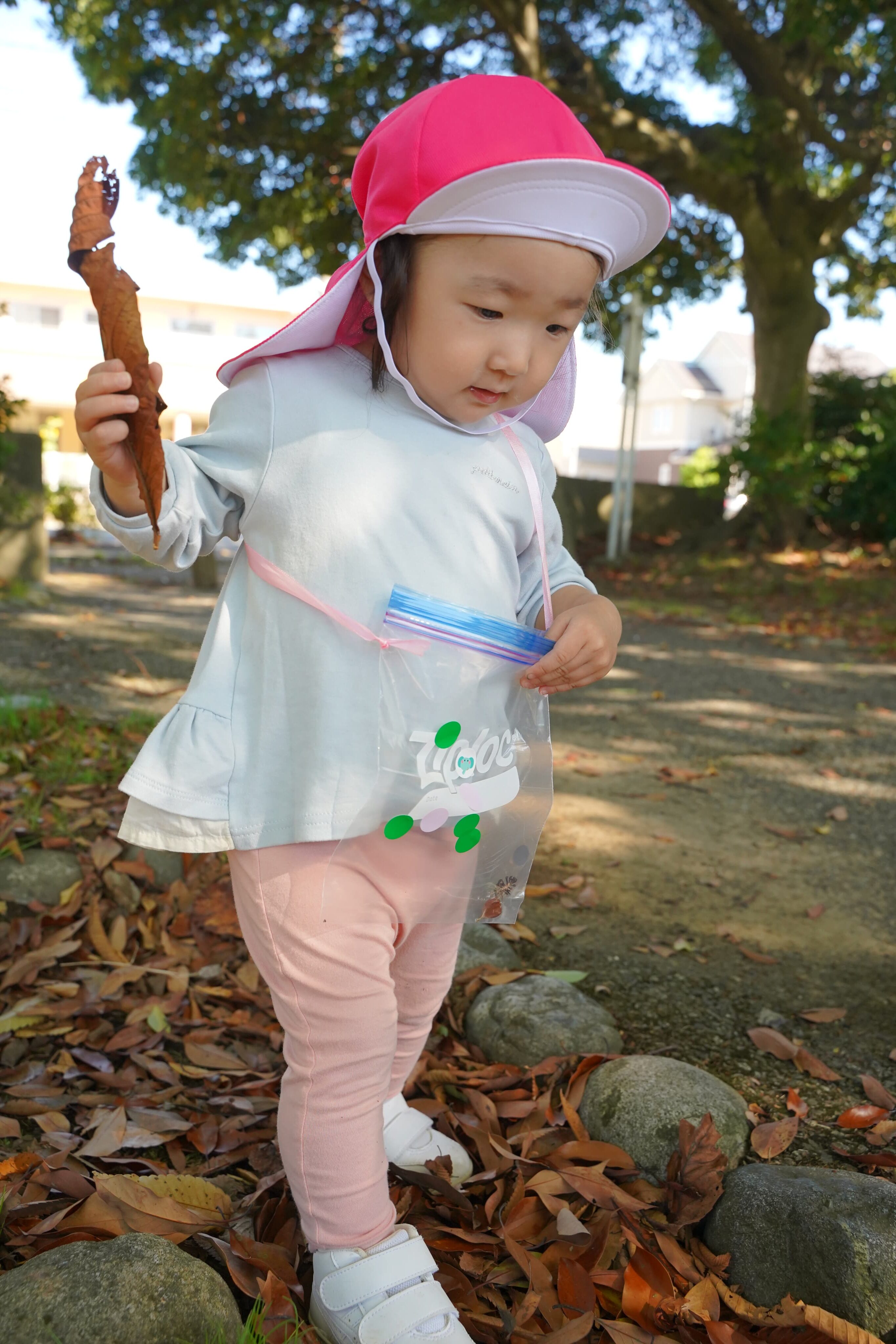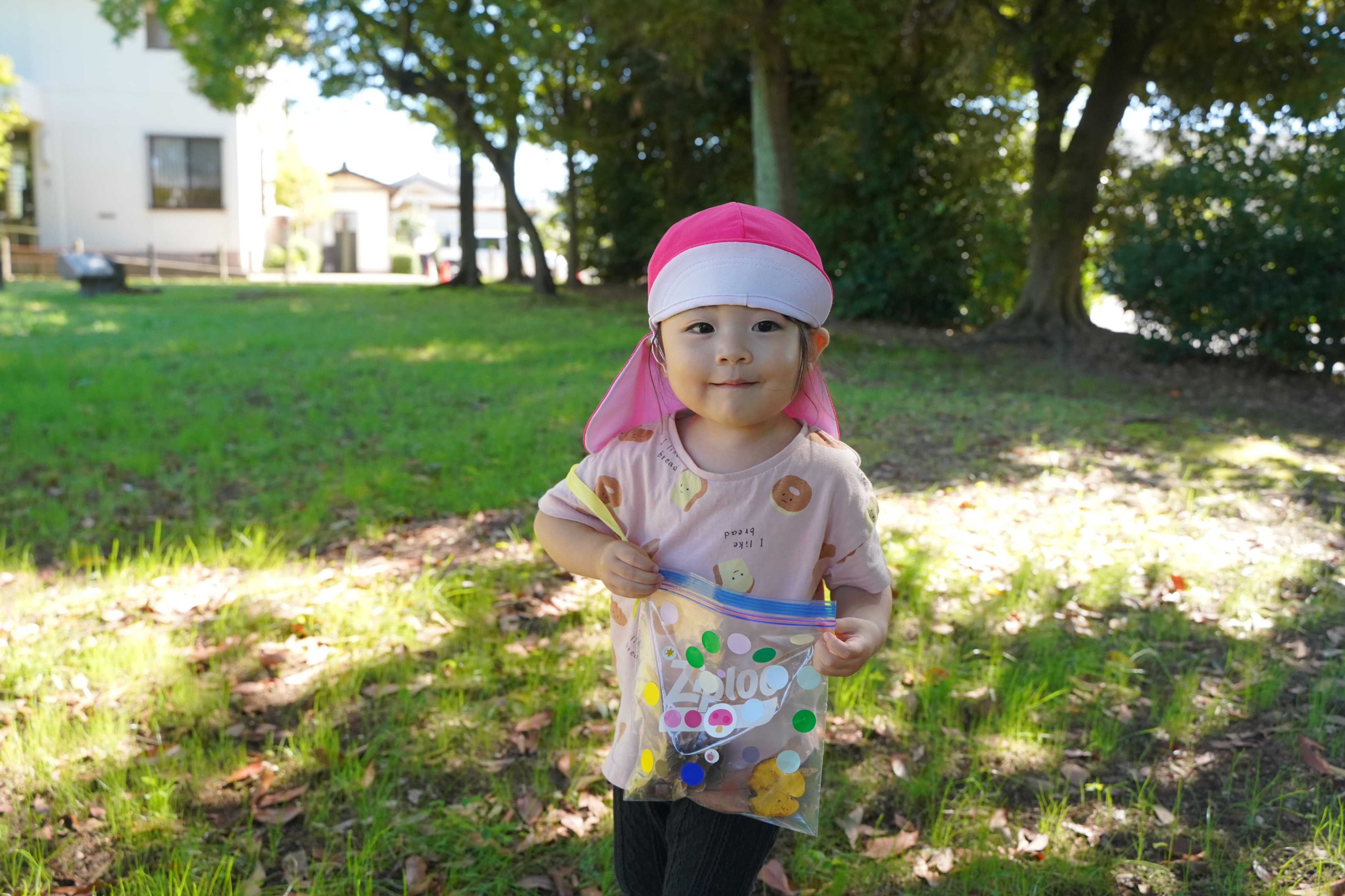 秋は自然がたくさん!お散歩に行く度、子どもたちの手にはどんぐりなどでいっぱいだったので、シール貼りをした散歩バックを準備🛍️早速、身につけてチカモリ公園で遊びました💚