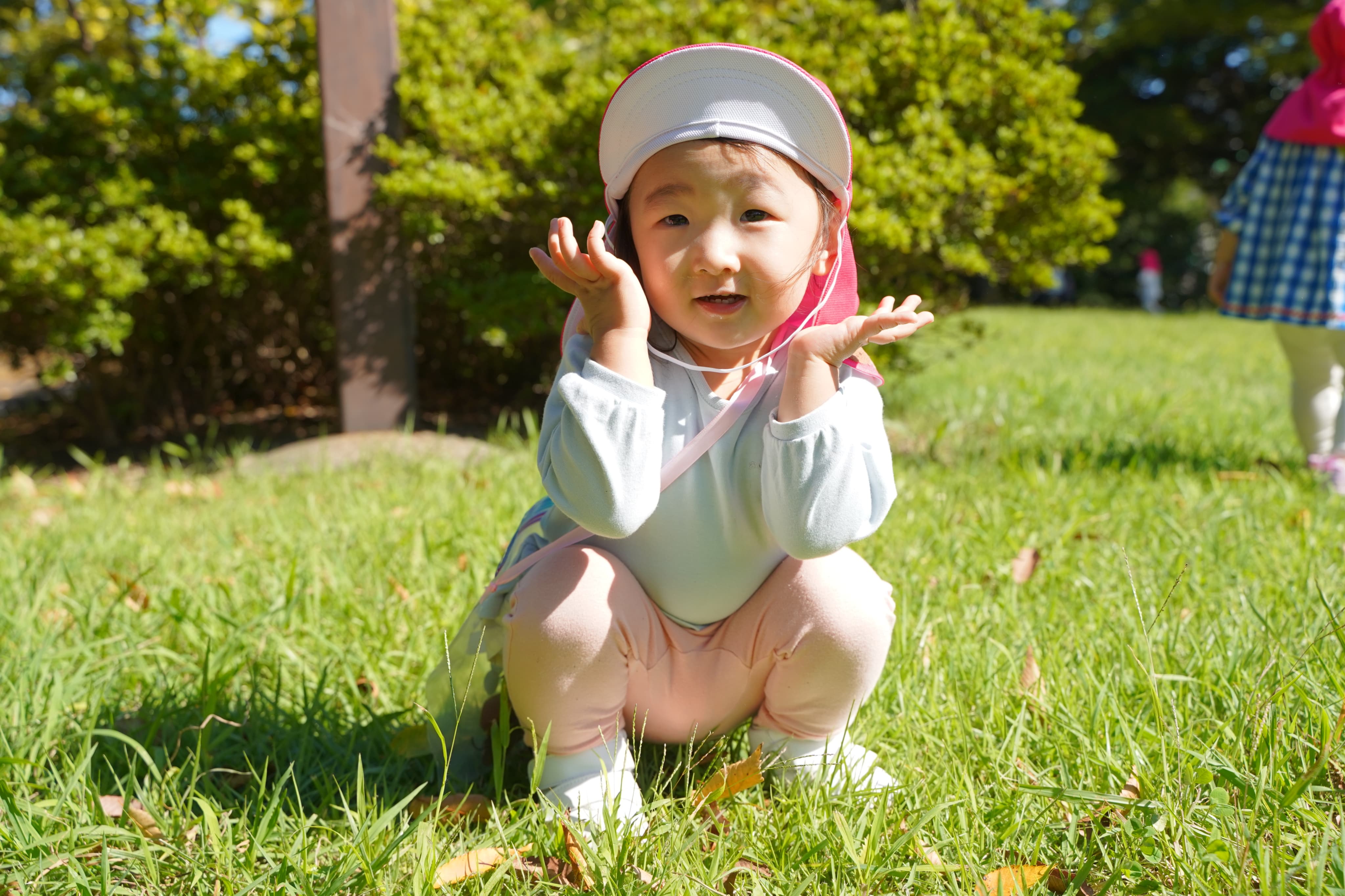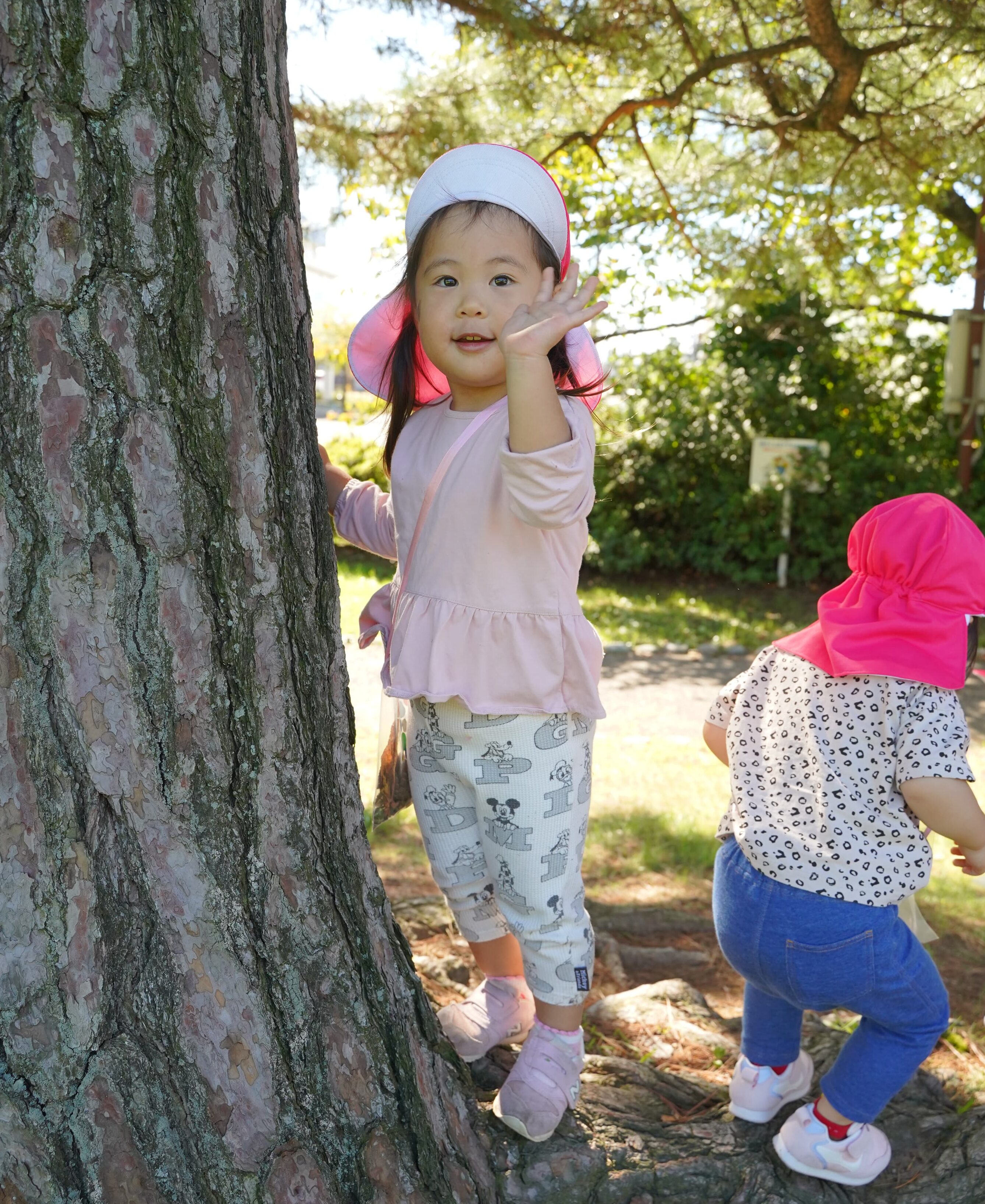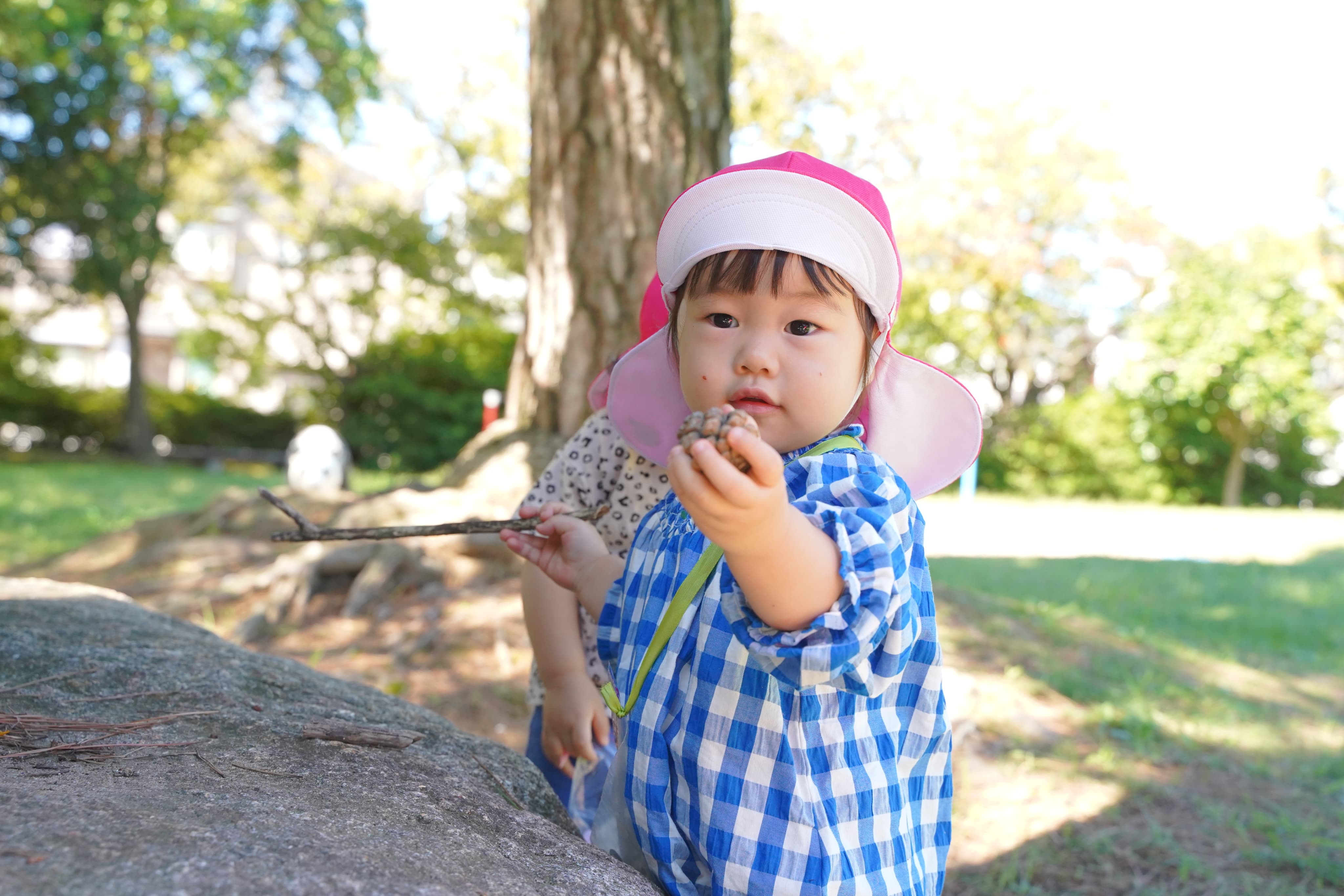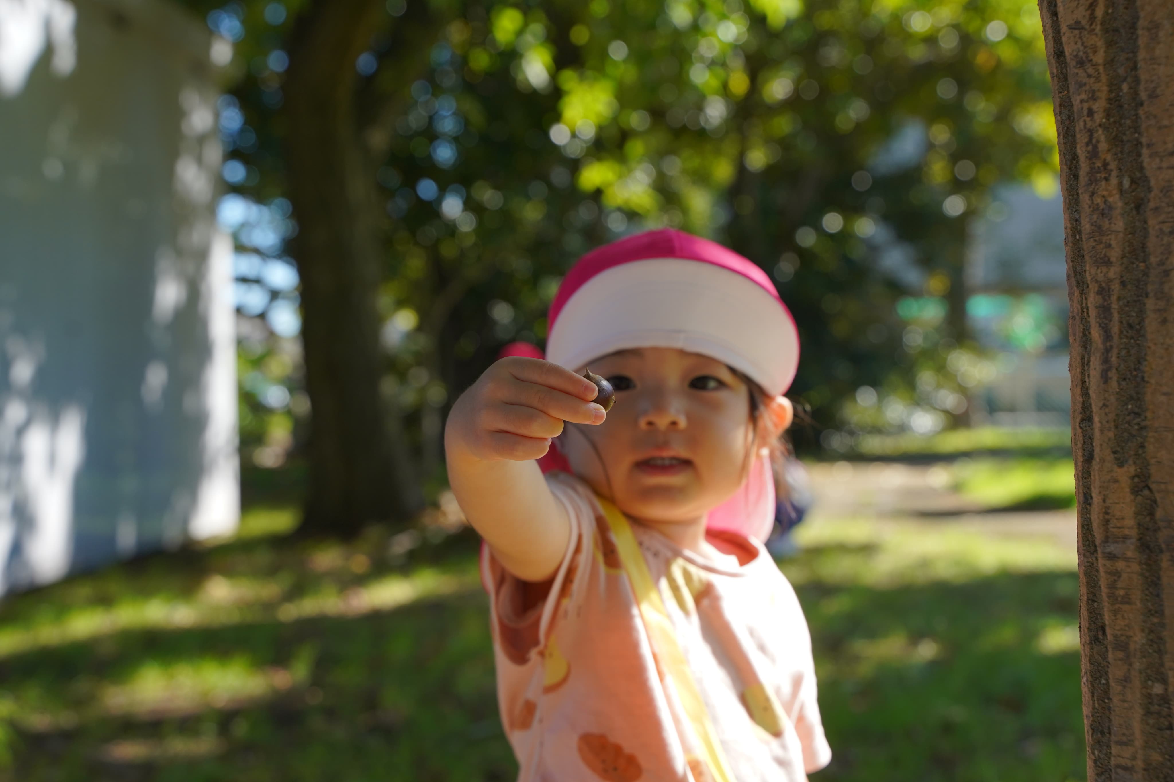 秋は自然がたくさん!お散歩に行く度、子どもたちの手にはどんぐりなどでいっぱいだったので、シール貼りをした散歩バックを準備🛍️早速、身につけてチカモリ公園で遊びました💚