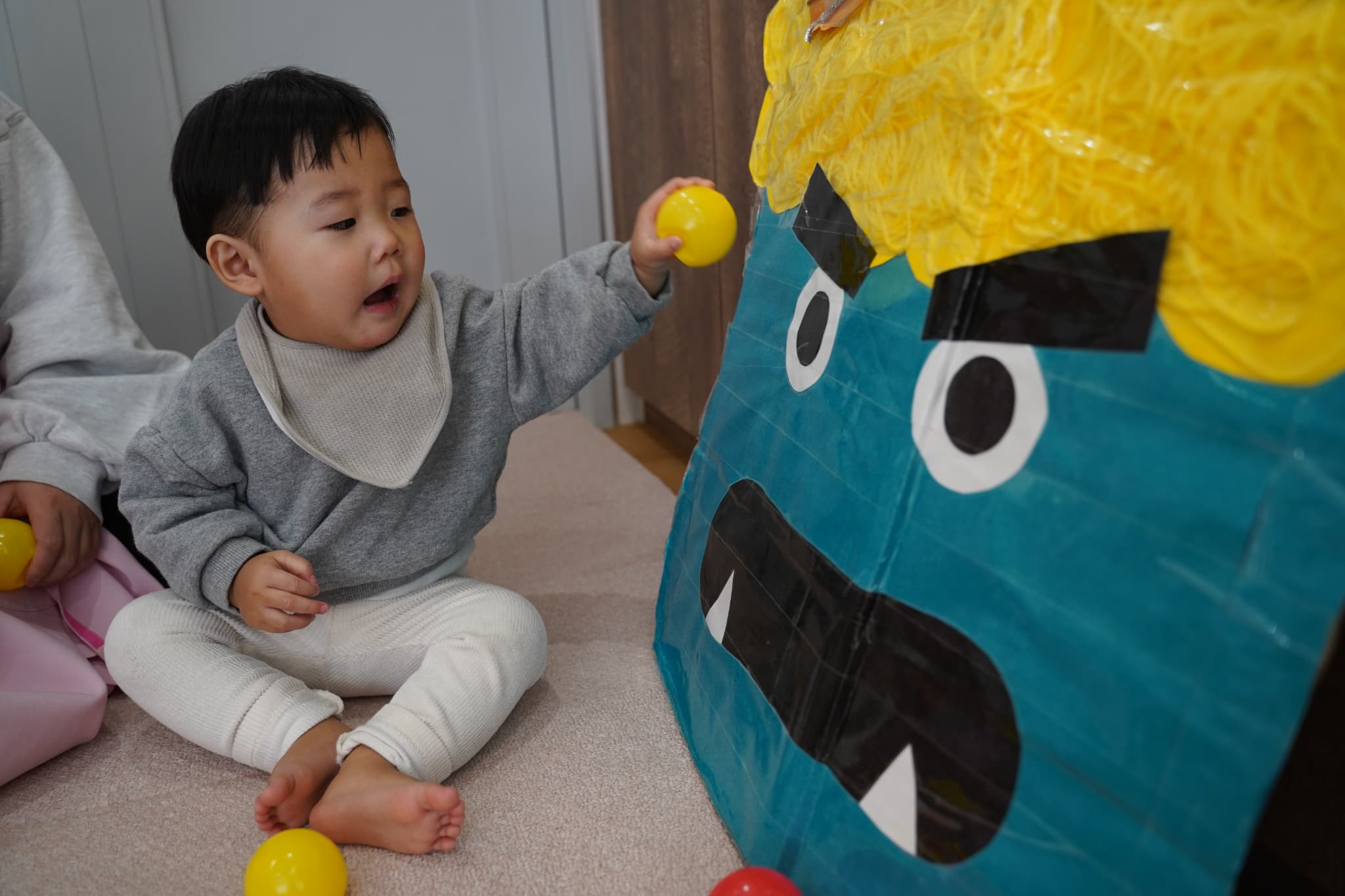 お部屋でカラーボールを使って豆まきごっこをしてみました☺︎