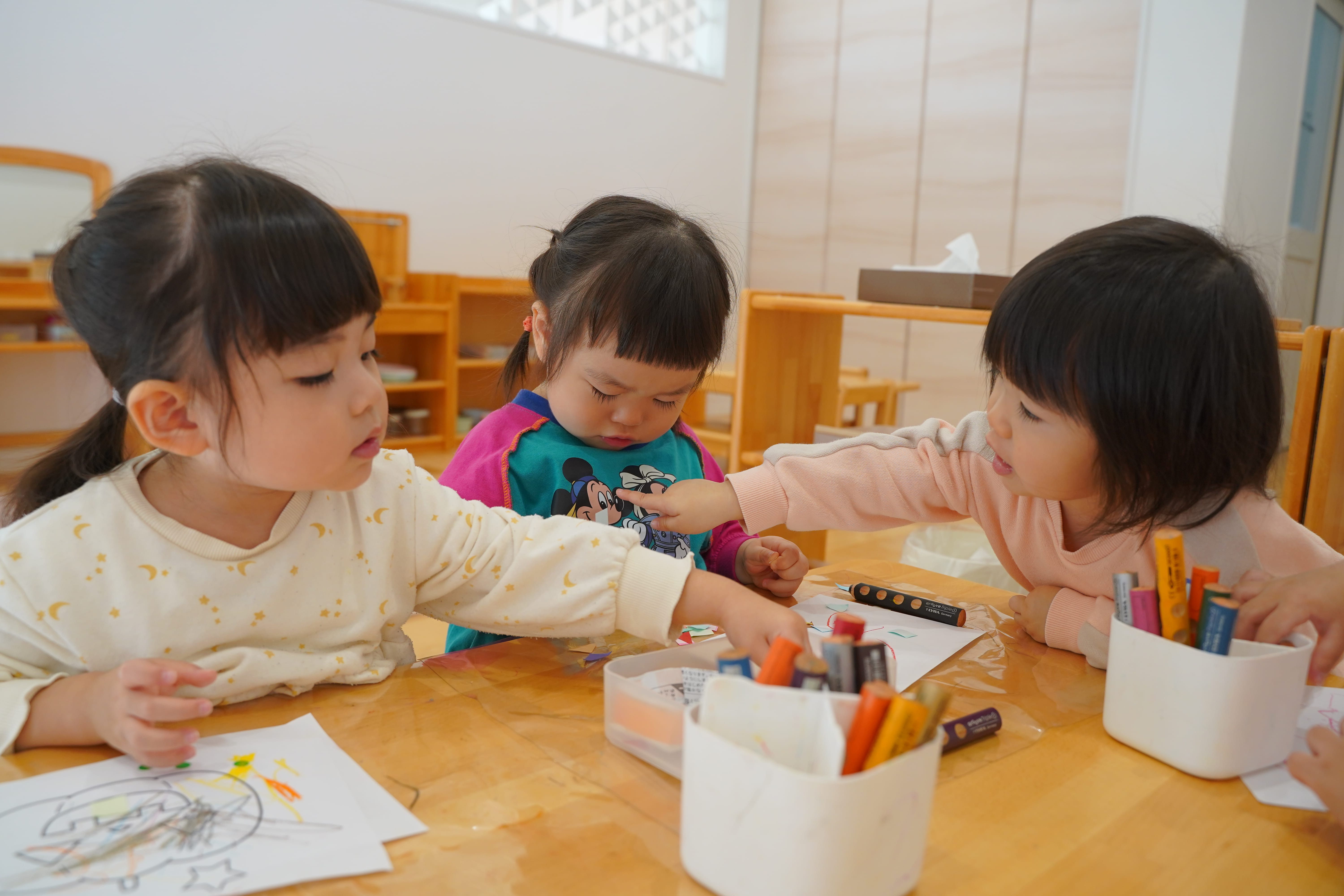 お絵描きや塗り絵もとっても人気で「〇〇ちゃん、何色にする??」とシールや色鉛筆を共有したり、イメージを広げながら書くことも楽しんでいますよ🎶