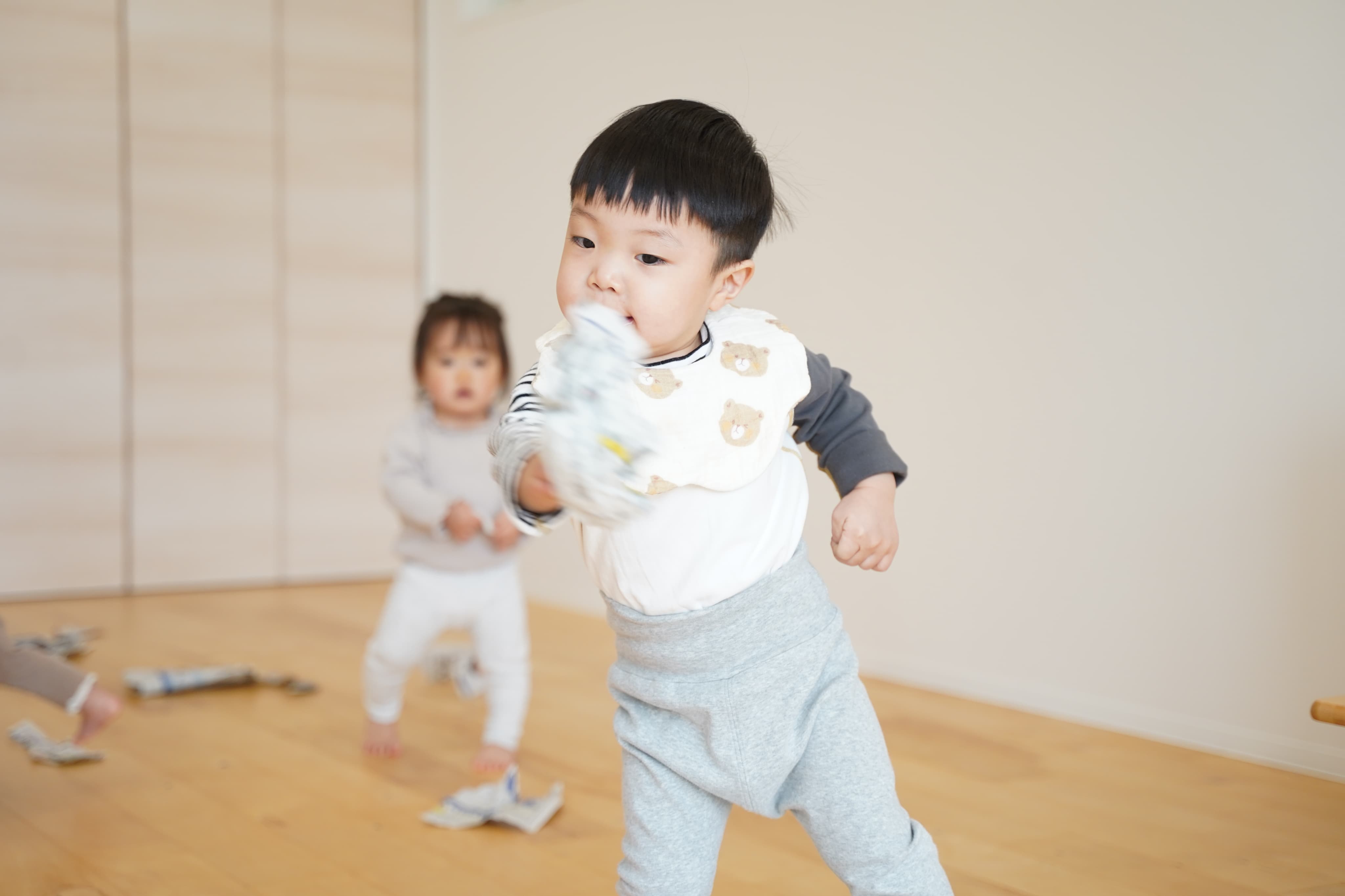 今日も大きいプレイルームで新聞紙遊びをしました!