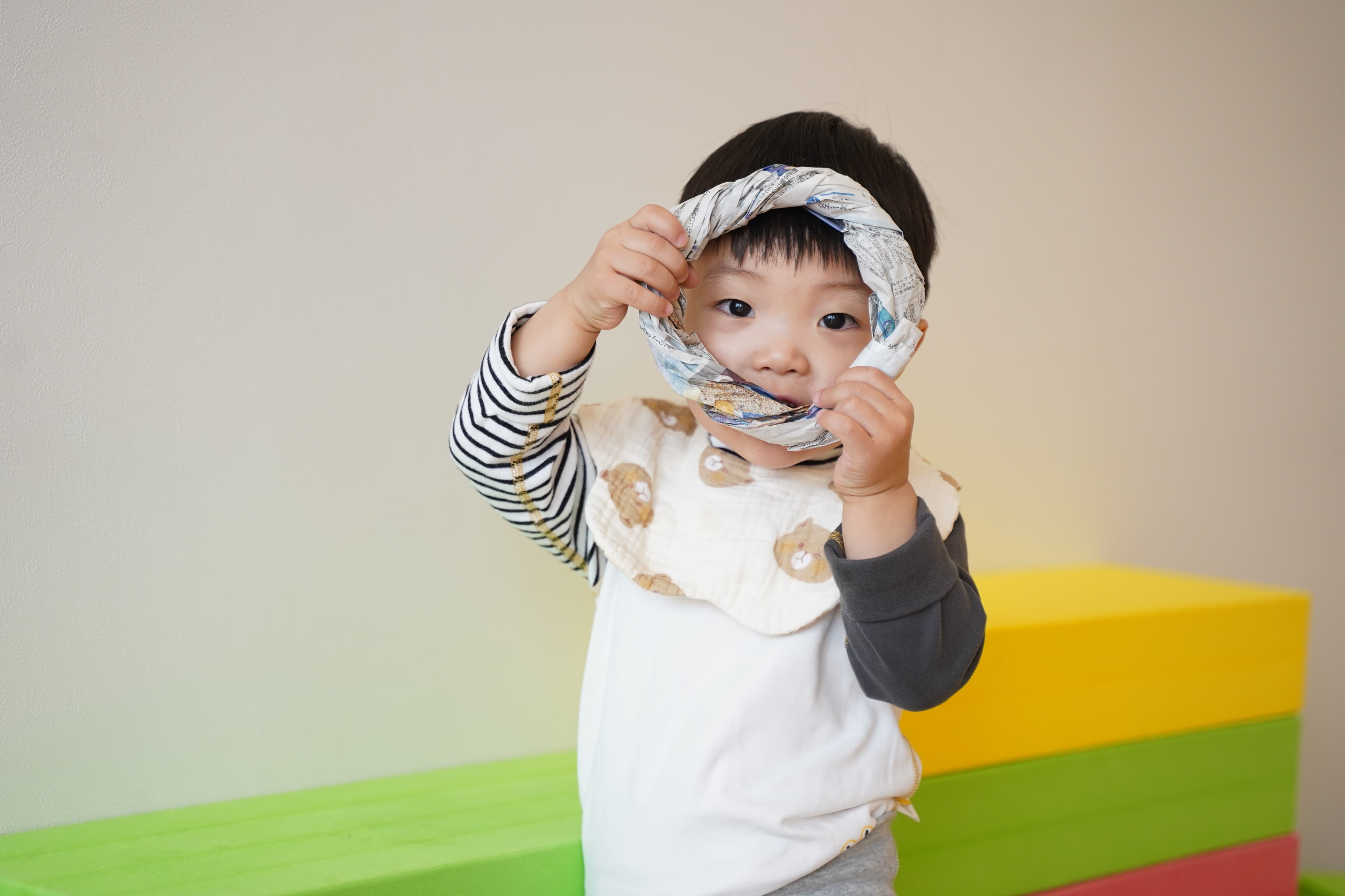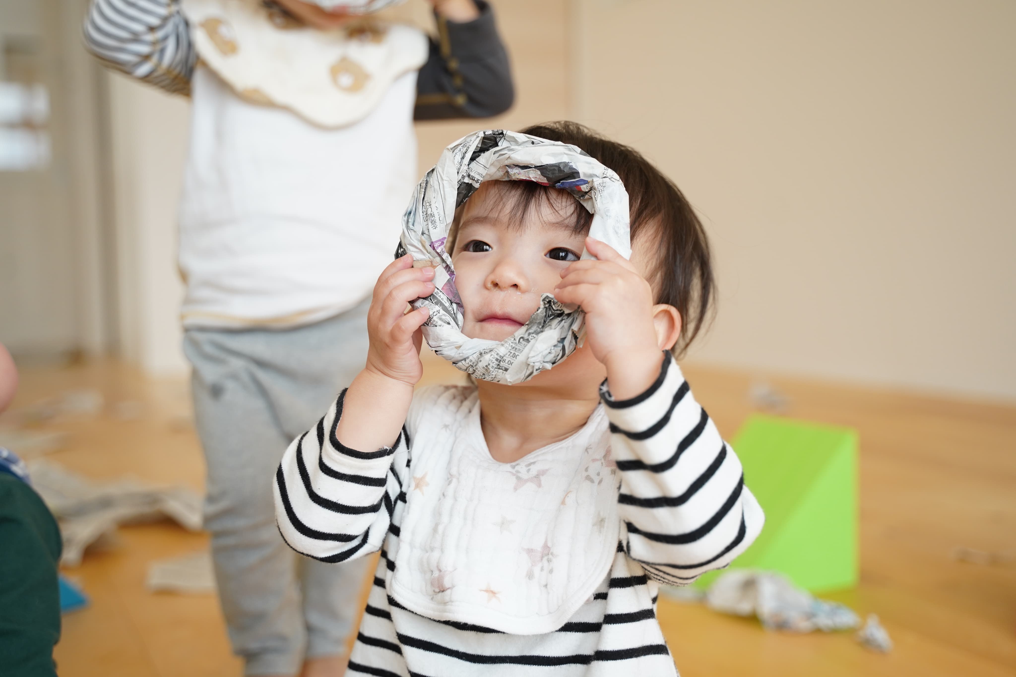 新聞紙の輪っかはハンドルのように握ったり、顔をはめてみたりと使い道がたくさん!