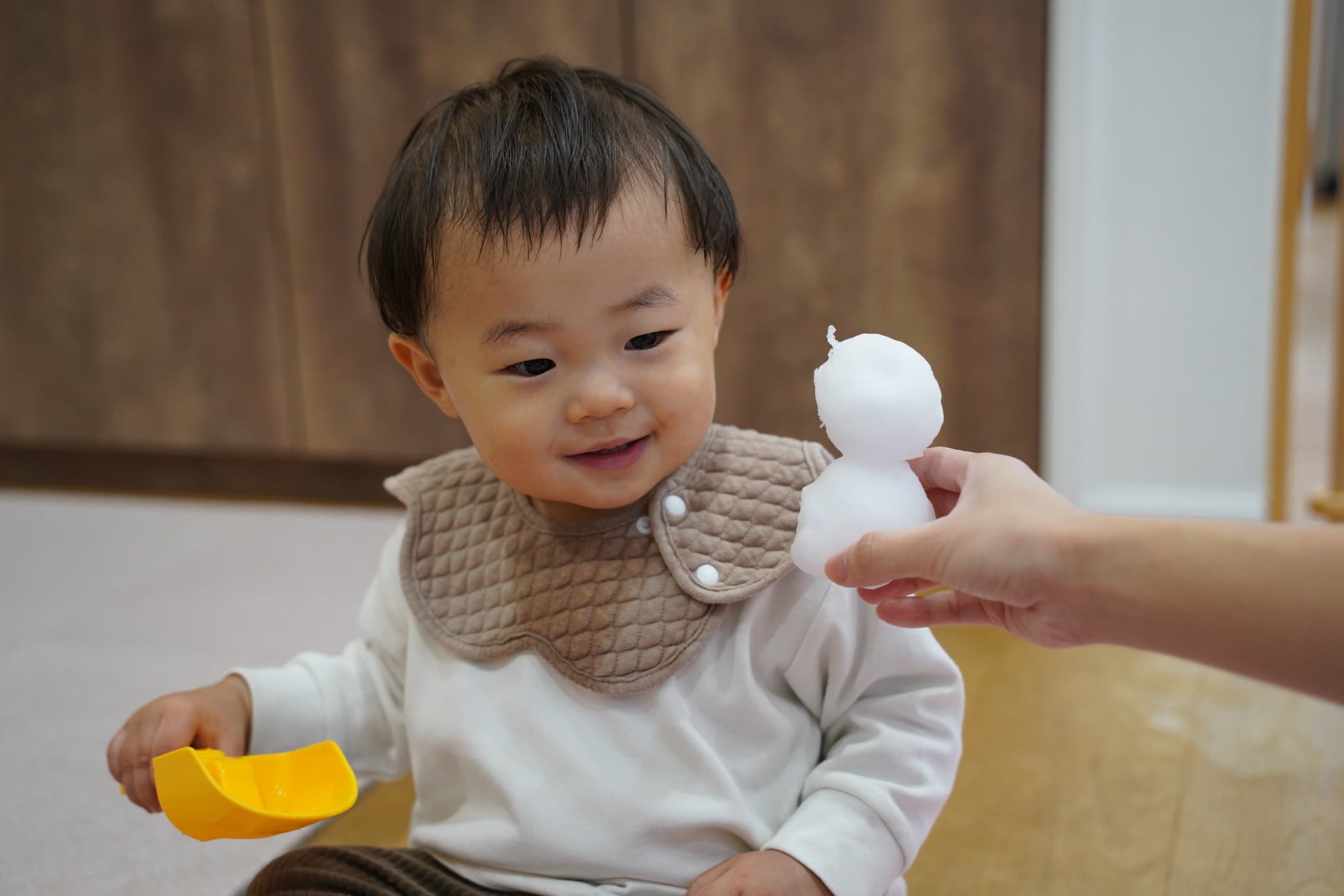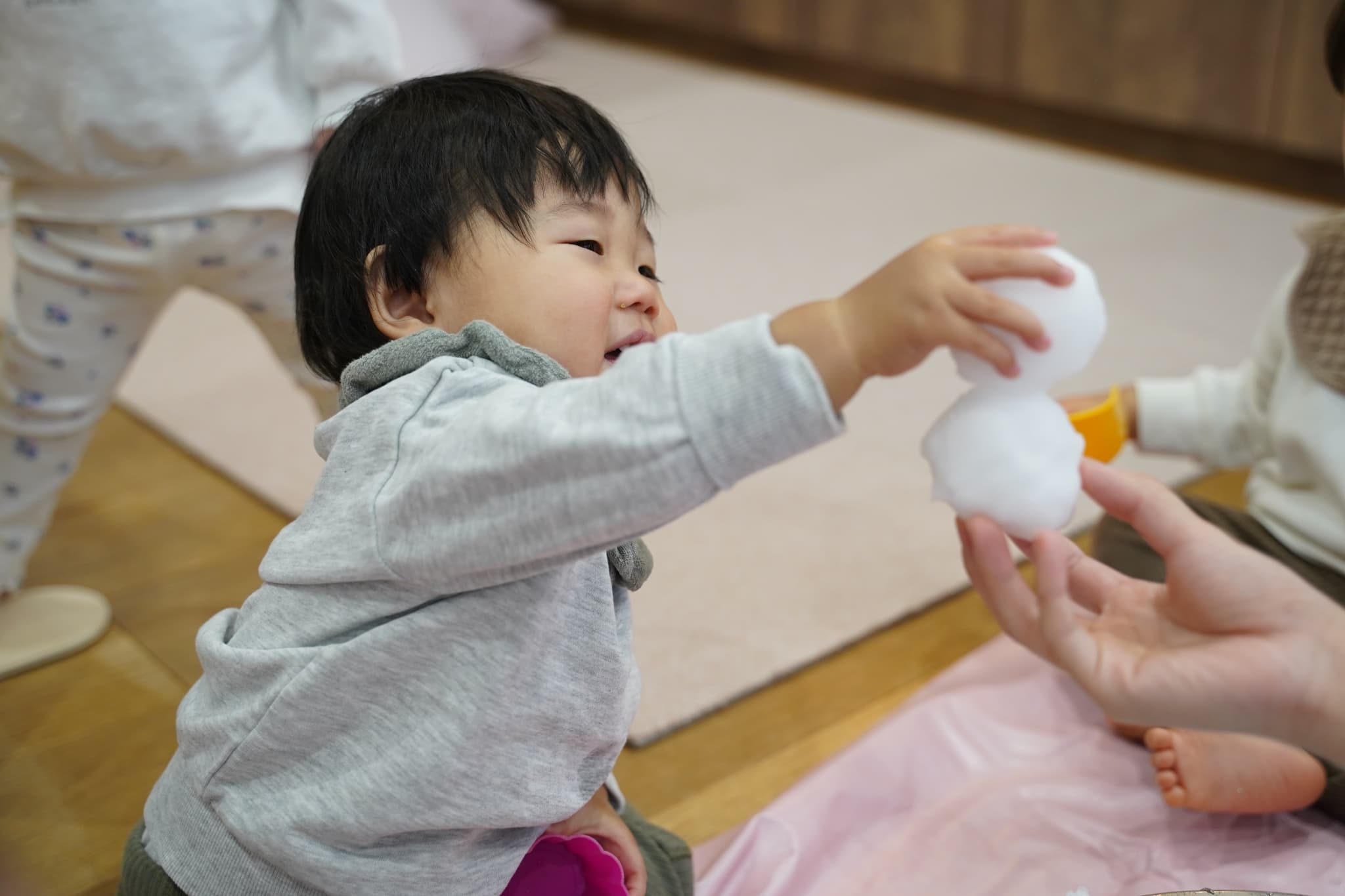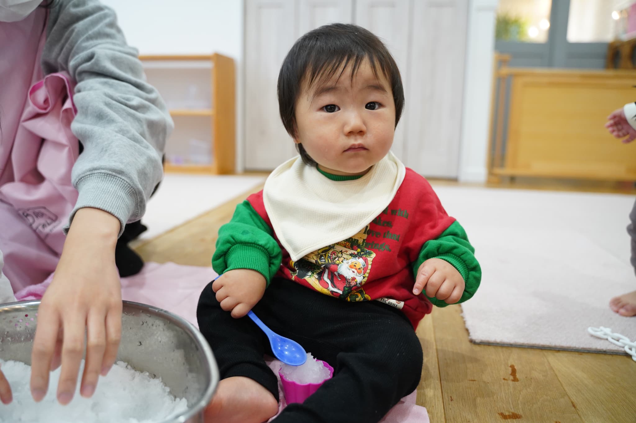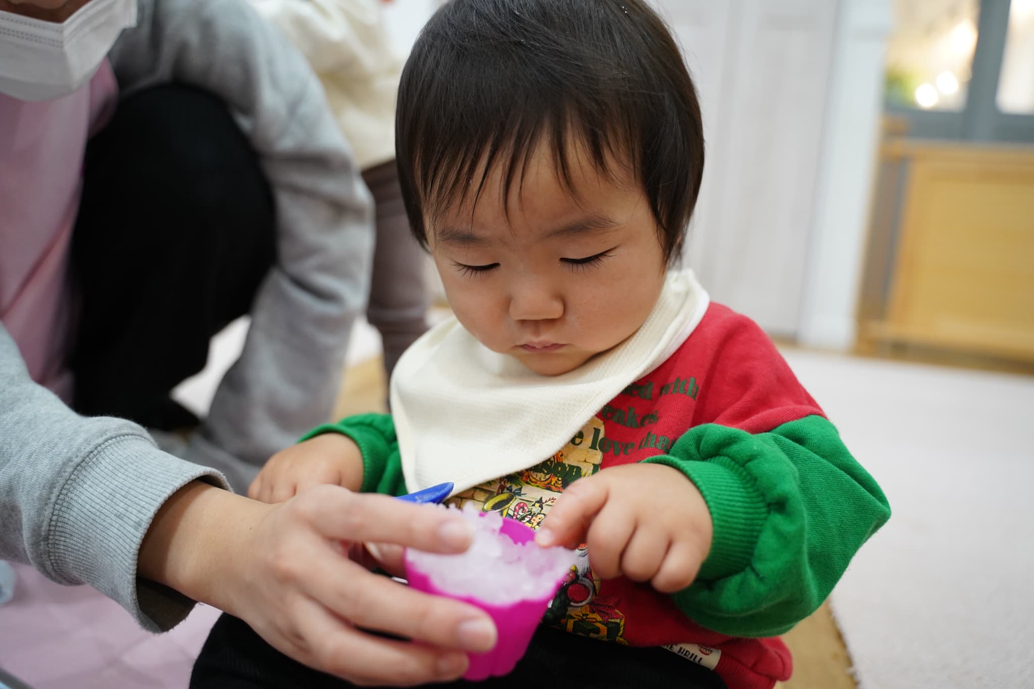 雪の入ったタライがお部屋に入っているくると、はじめはみんな不思議そうでこれはなんだろう?と言った表情をしてきたのですが、だんだんと慣れてくると夢中に遊んでいましたよ🍒