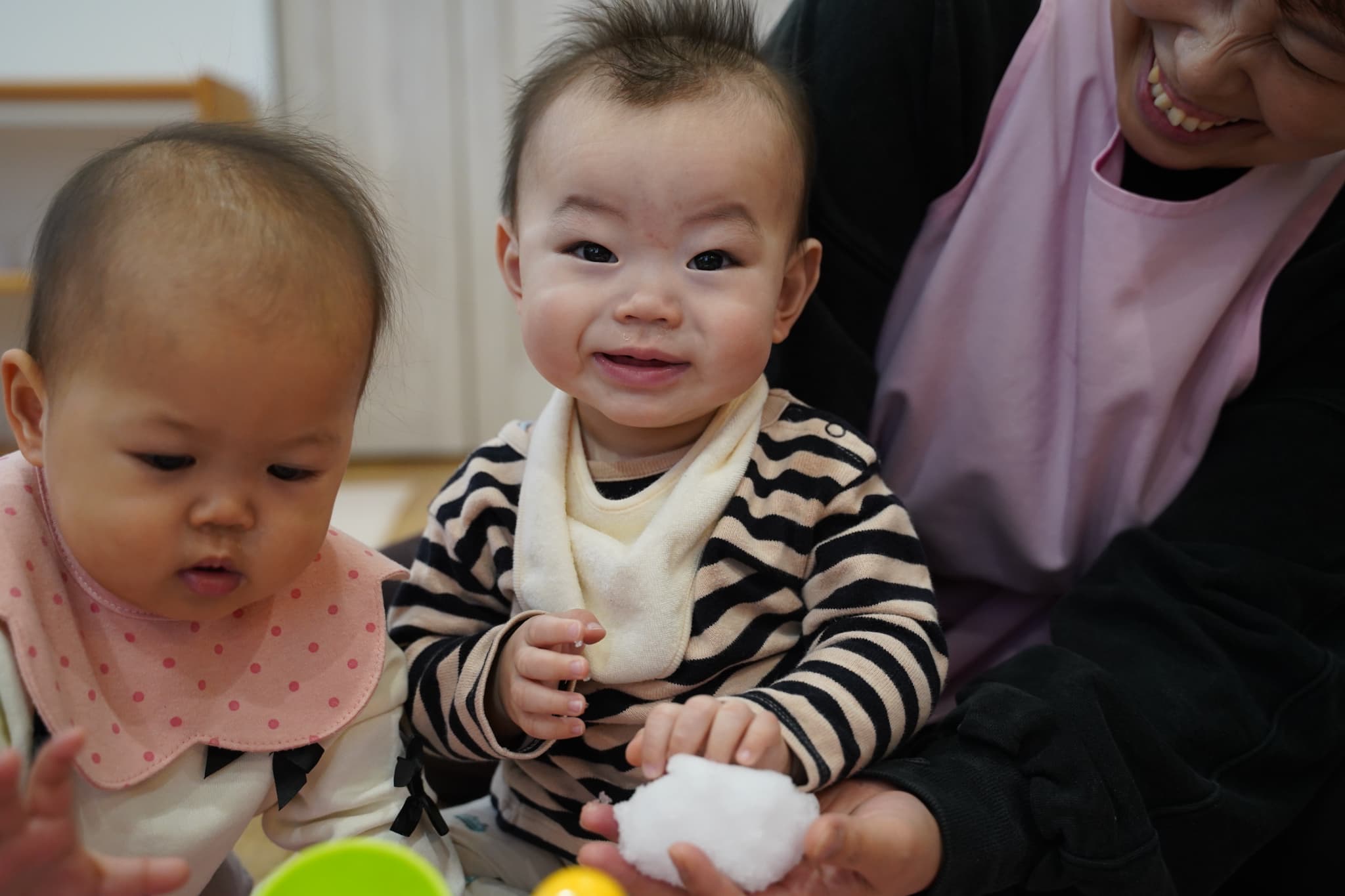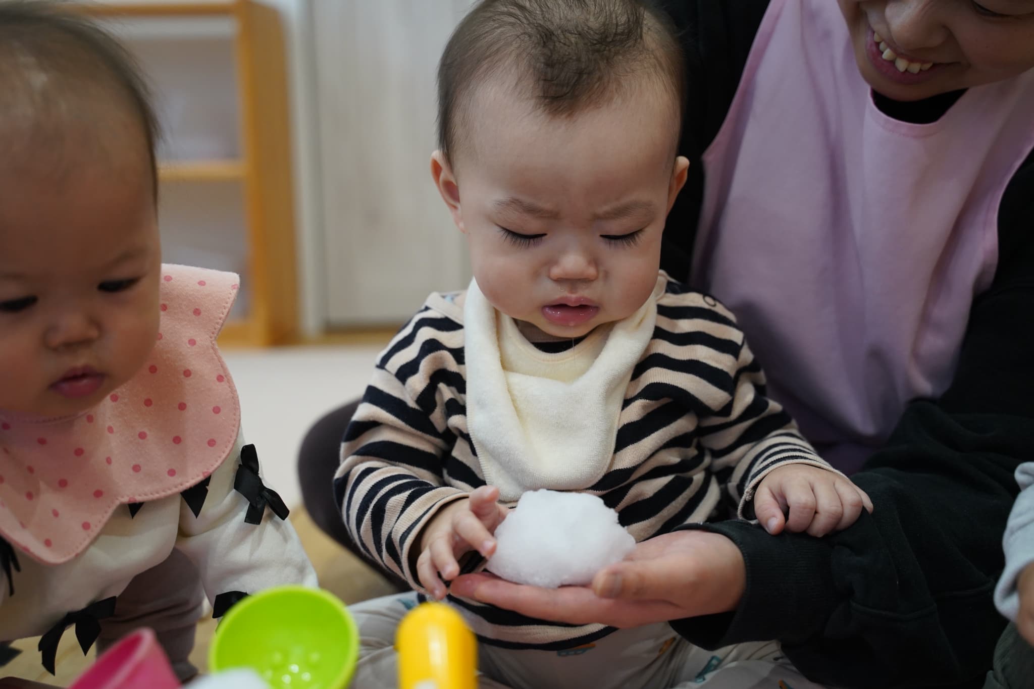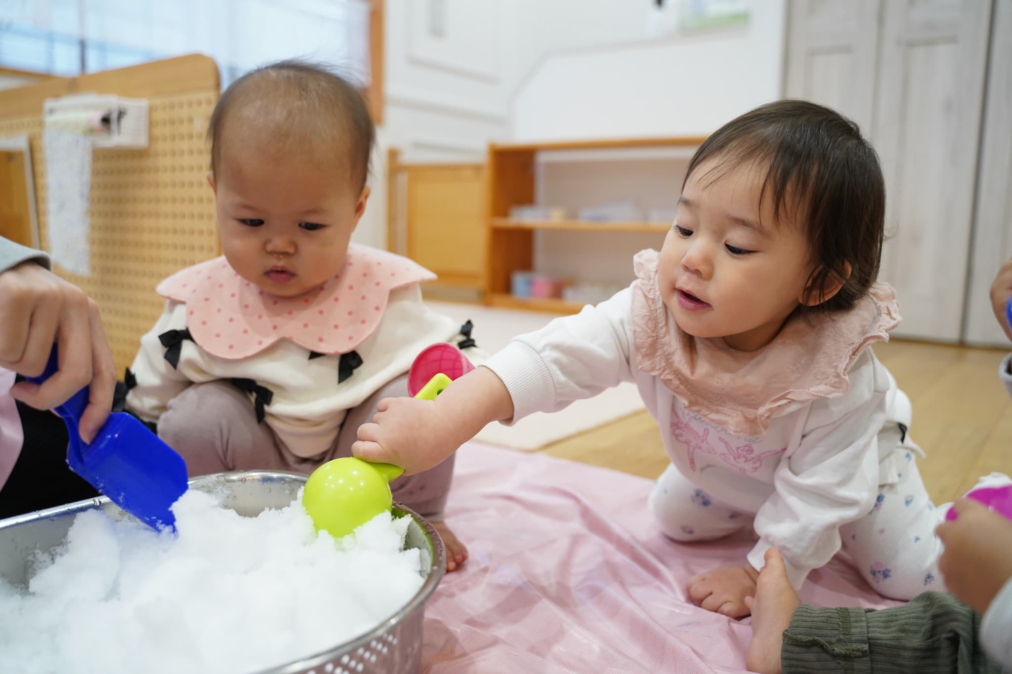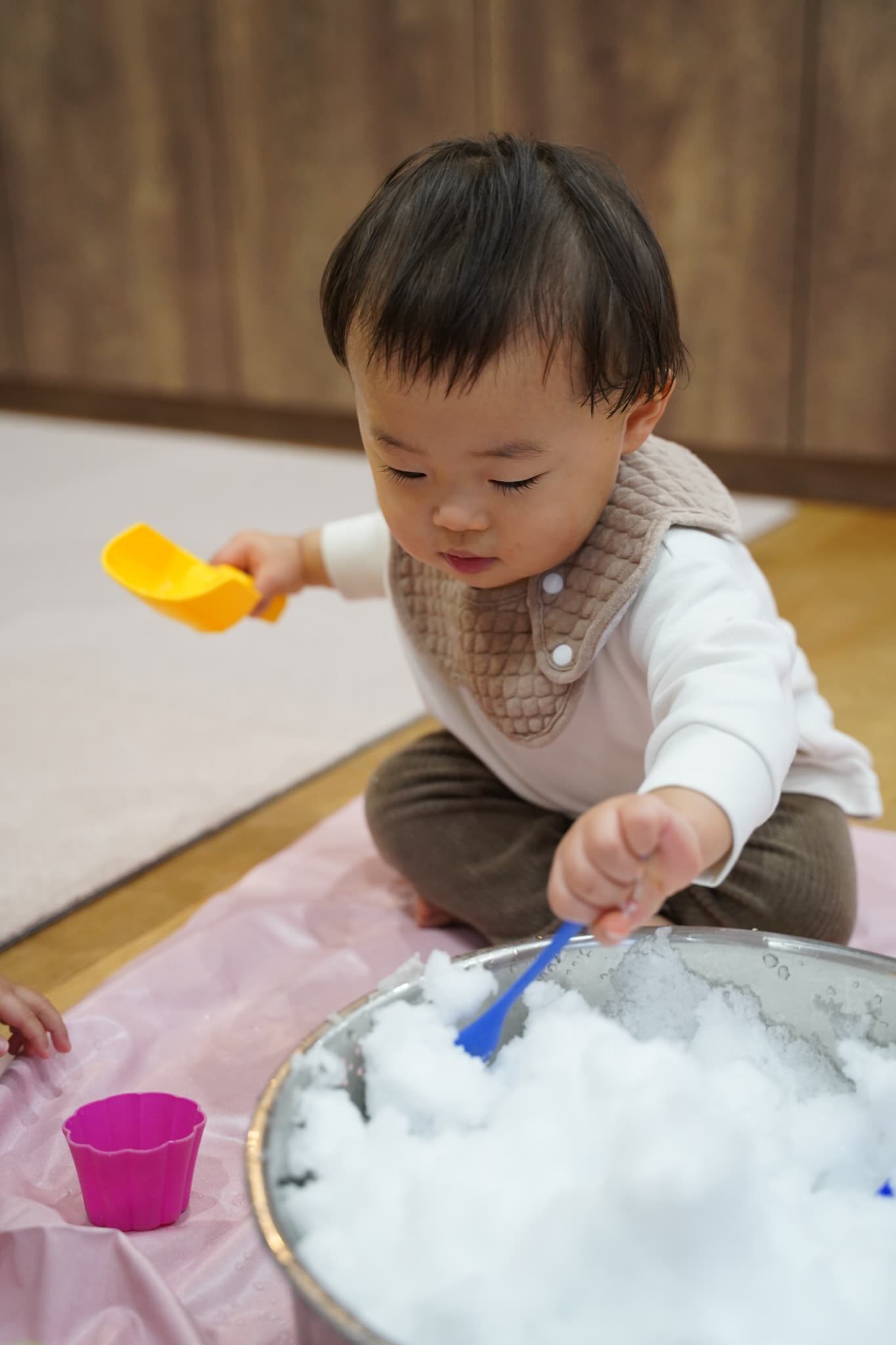 雪の入ったタライがお部屋に入っているくると、はじめはみんな不思議そうでこれはなんだろう?と言った表情をしてきたのですが、だんだんと慣れてくると夢中に遊んでいましたよ🍒
