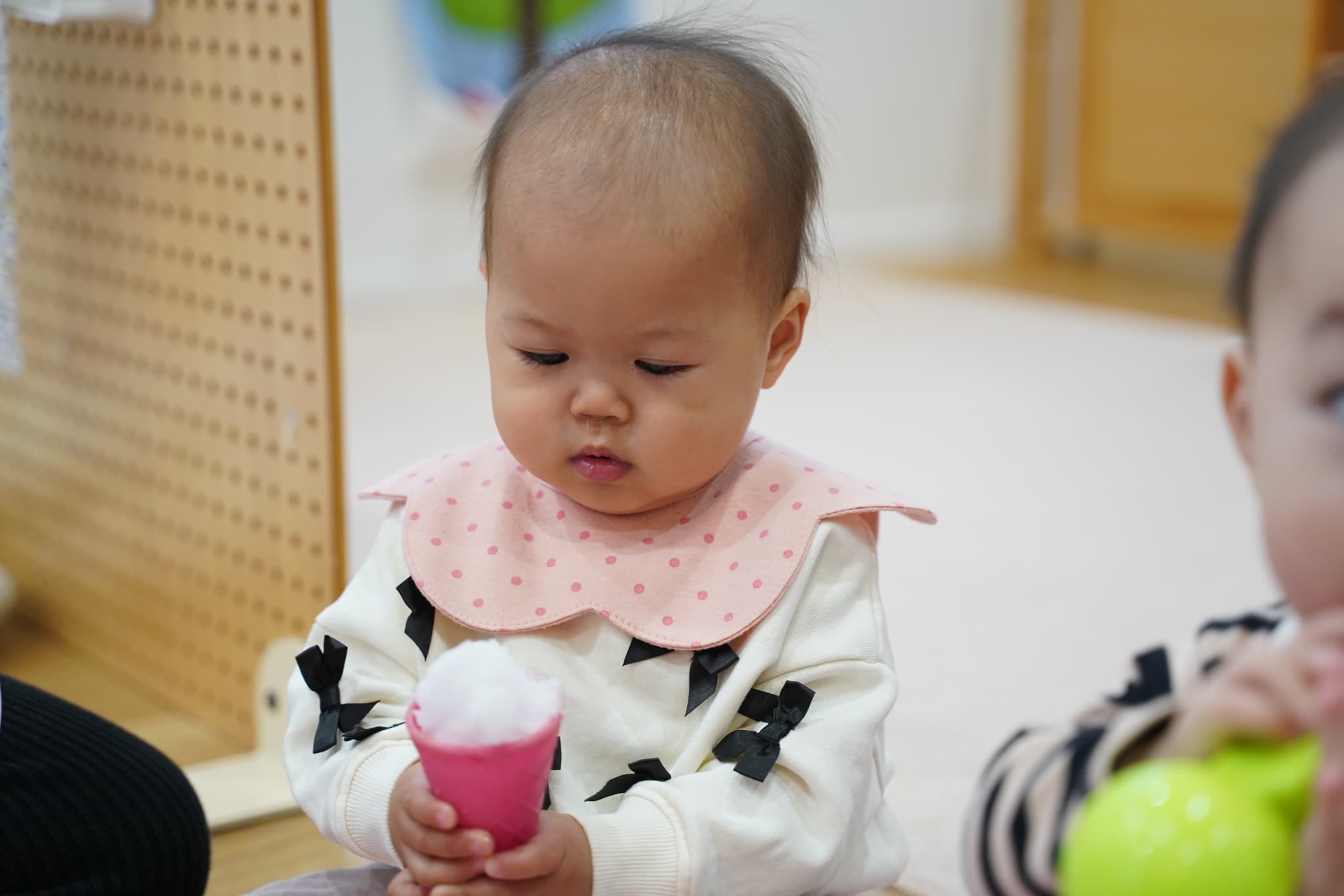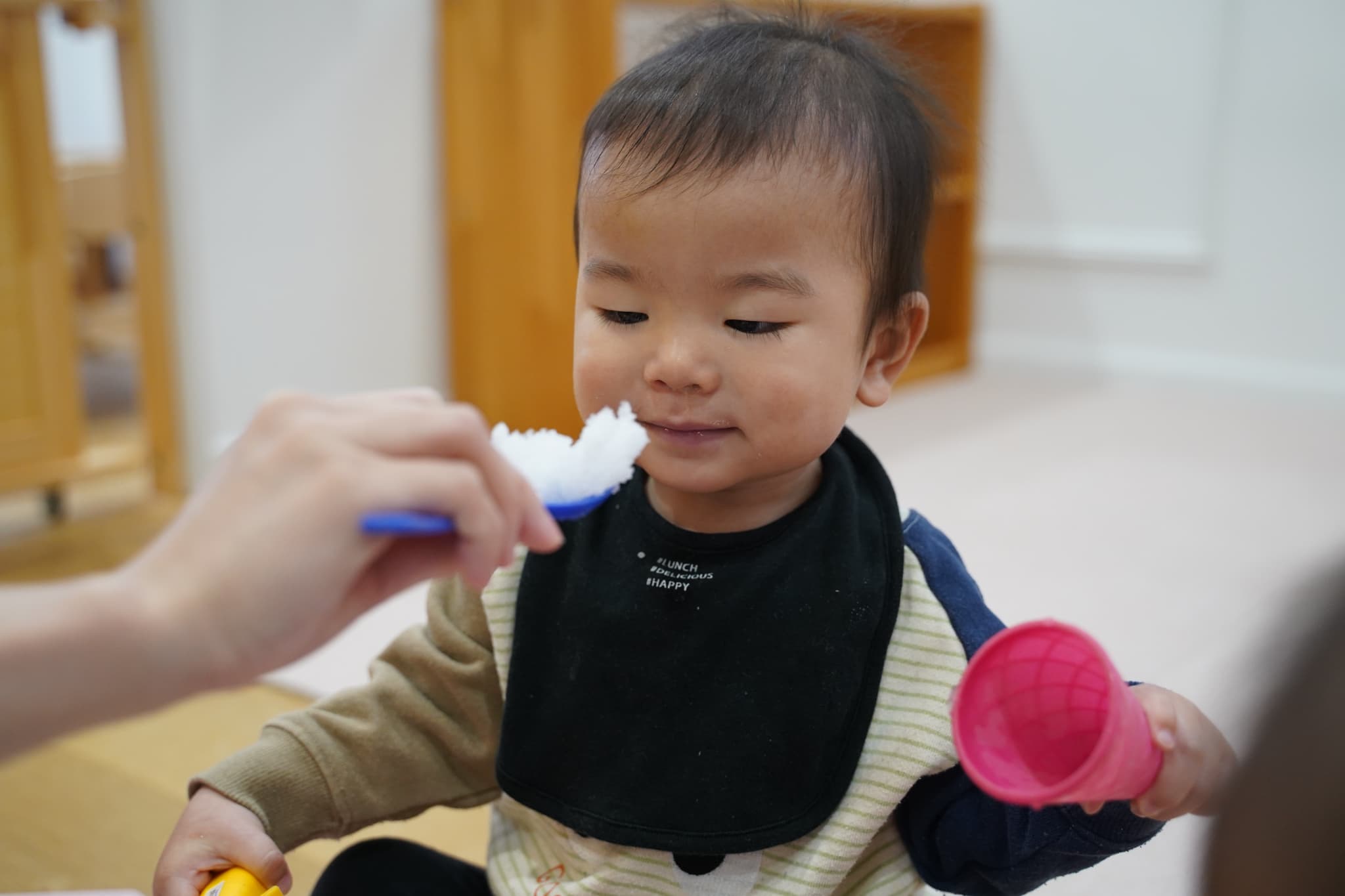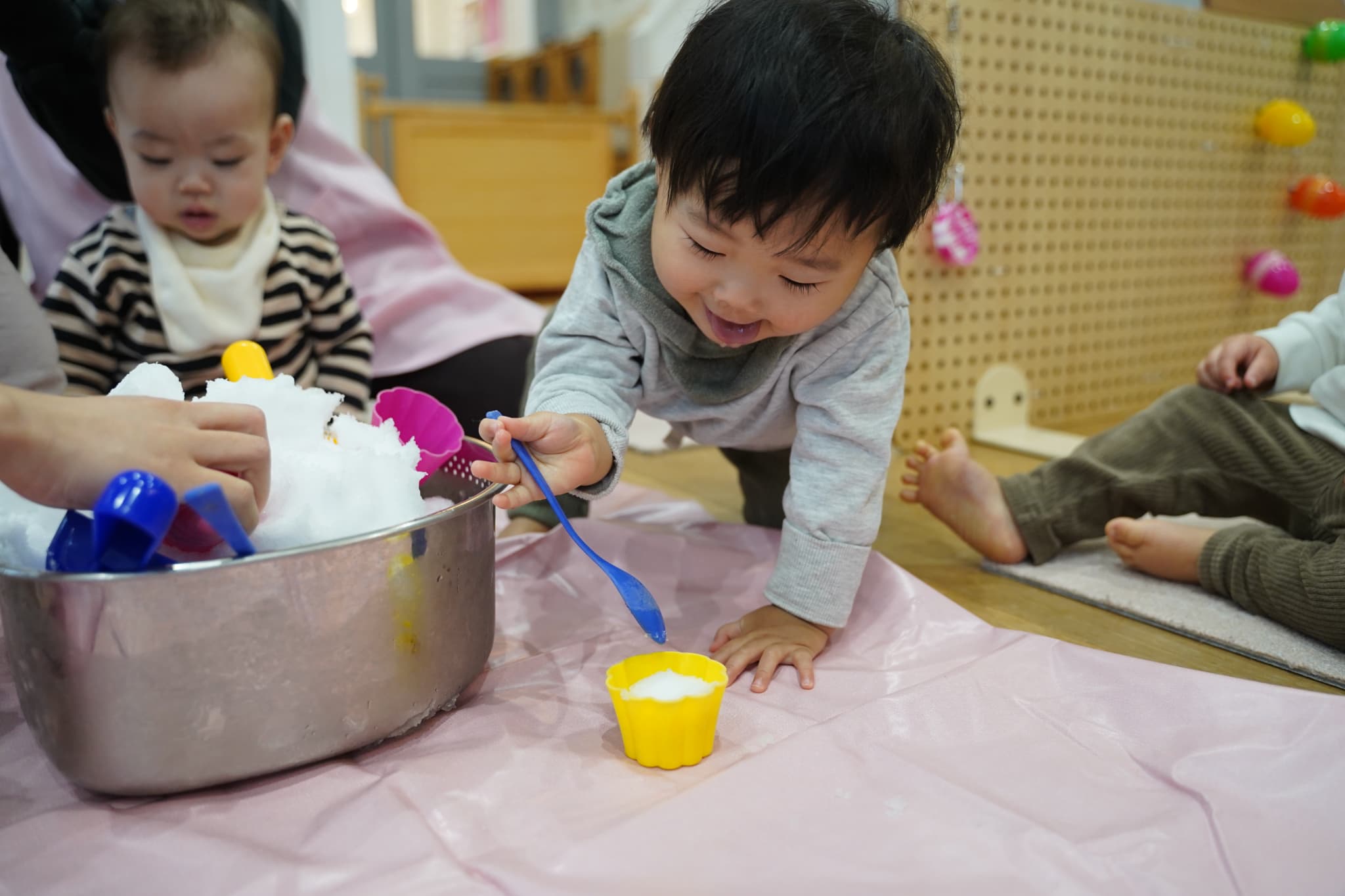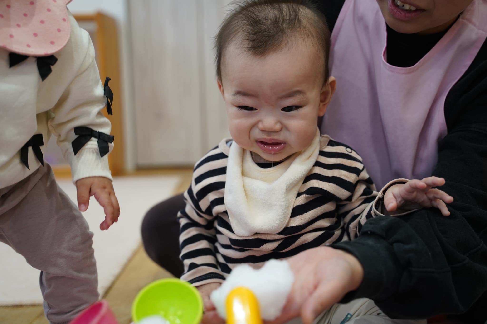 雪の入ったタライがお部屋に入っているくると、はじめはみんな不思議そうでこれはなんだろう?と言った表情をしてきたのですが、だんだんと慣れてくると夢中に遊んでいましたよ🍒