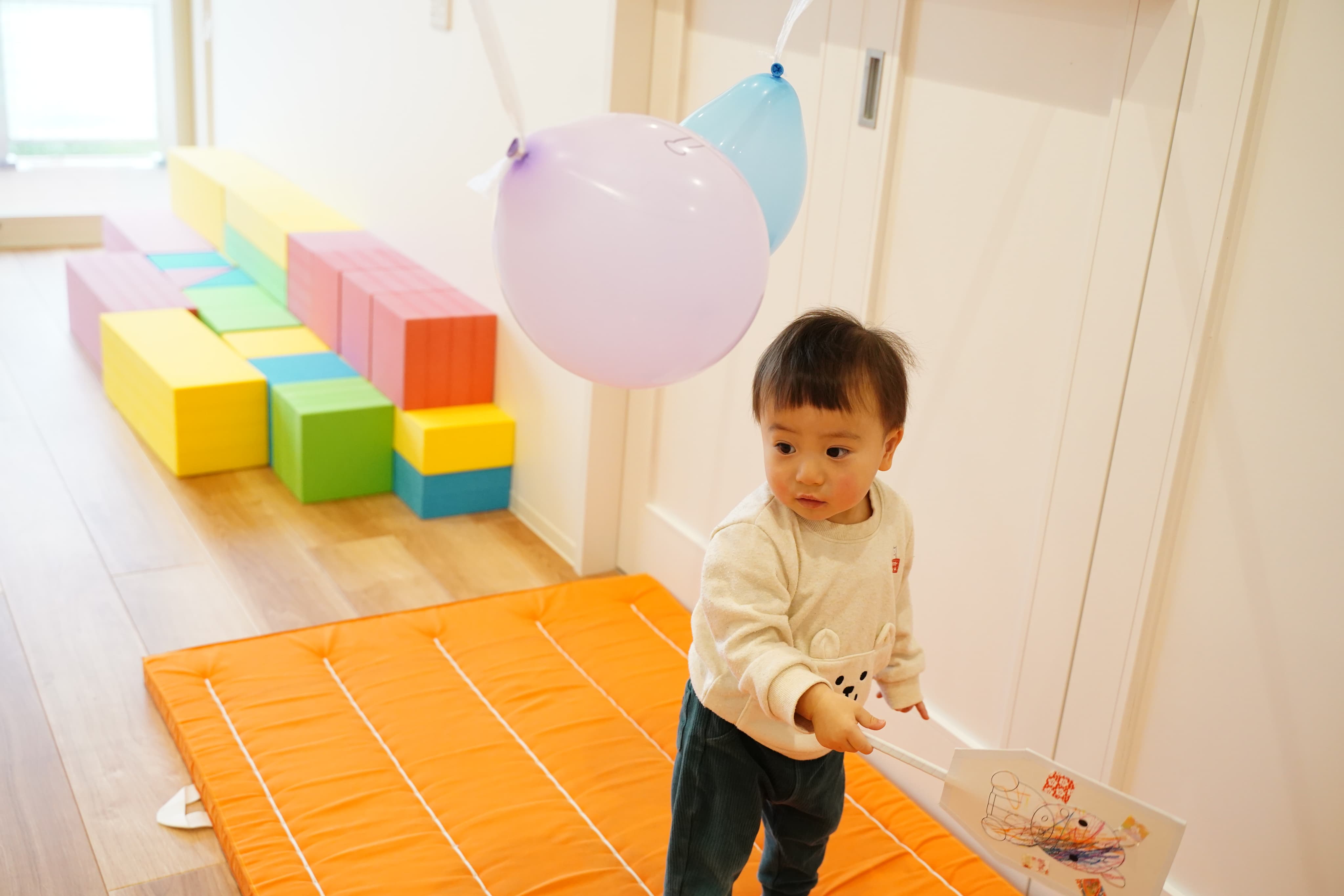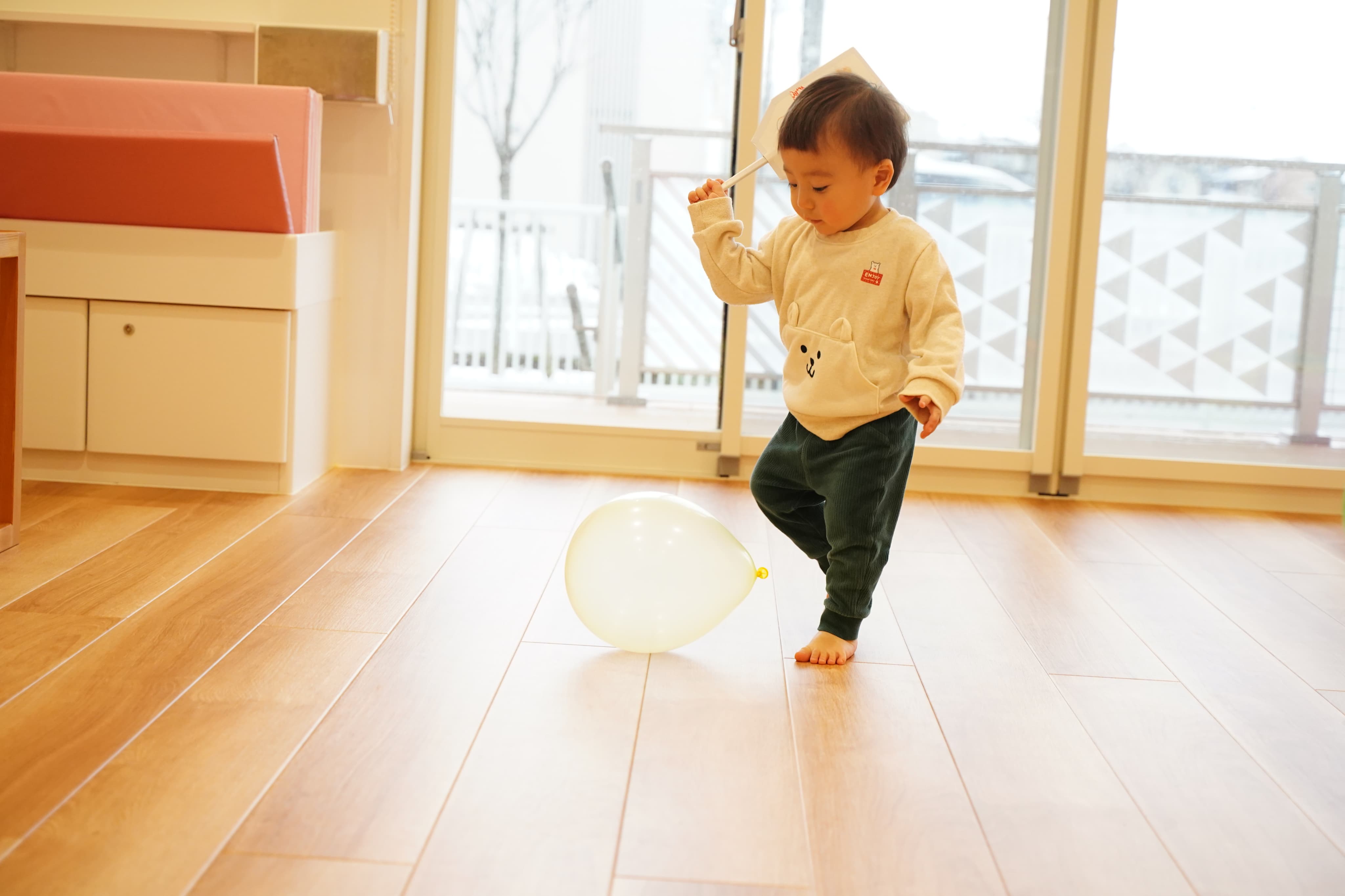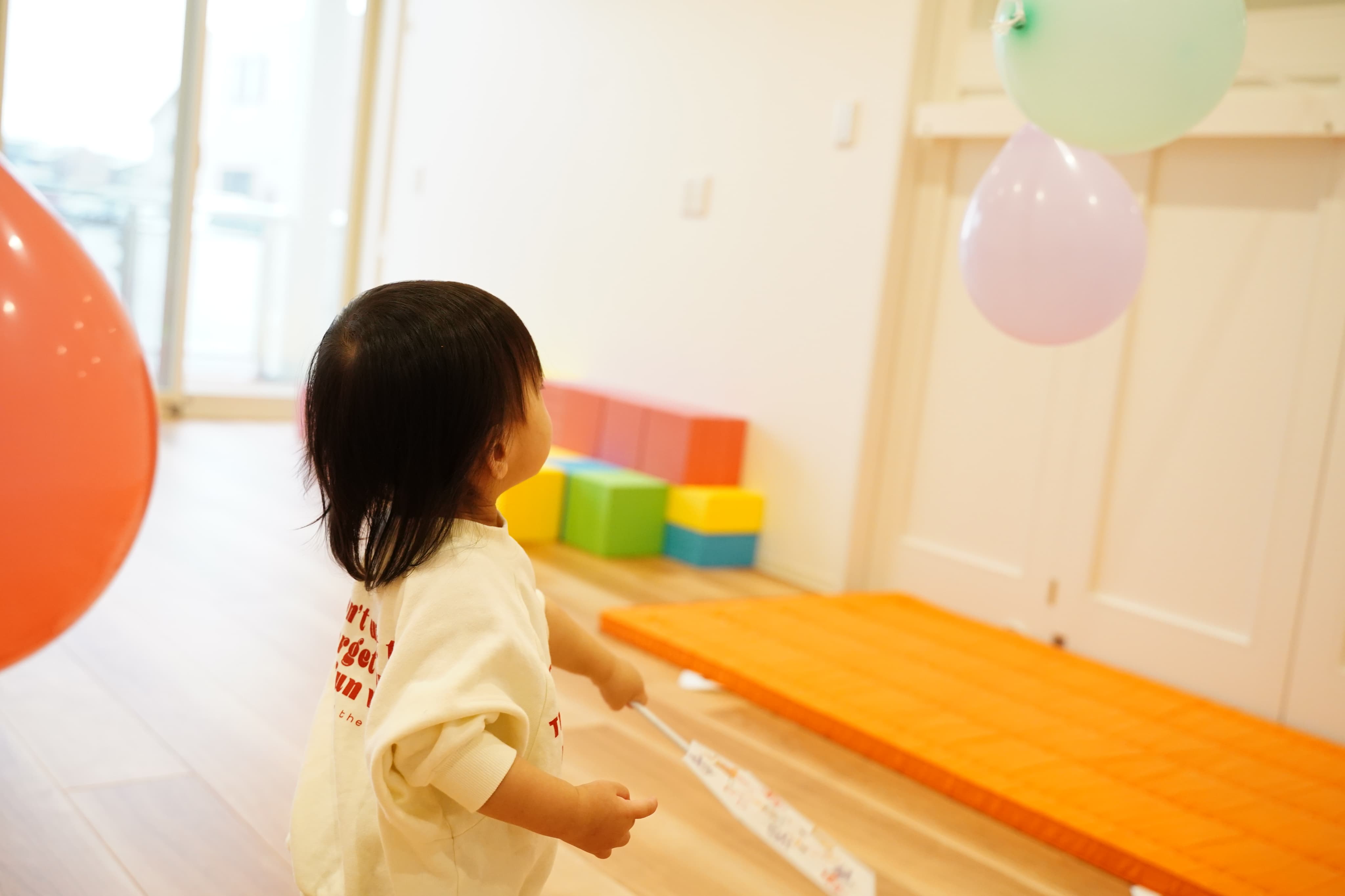 床にある風船もえいっと叩いてみたぼく🎈ポーンと飛び跳ねていくのが面白かったようで、何度も追いかけては叩いていました😊