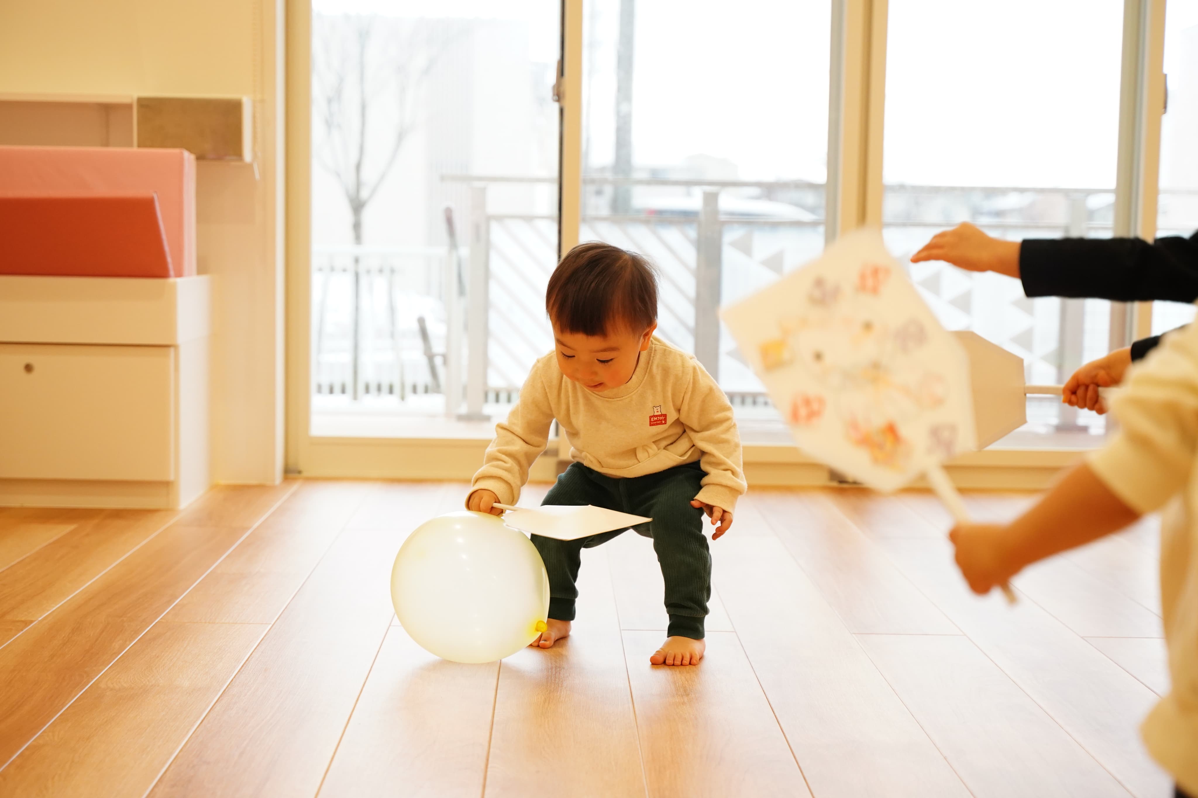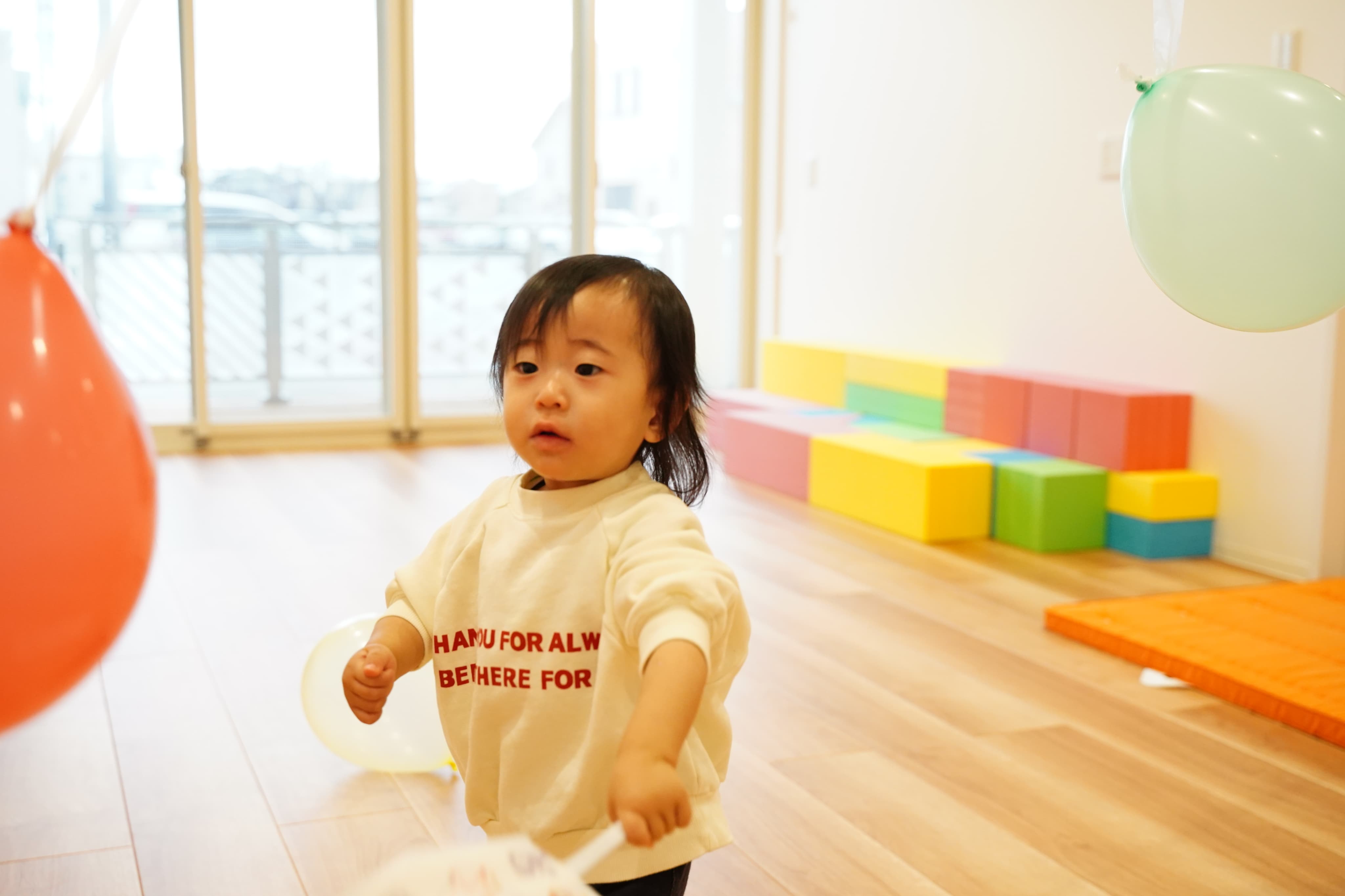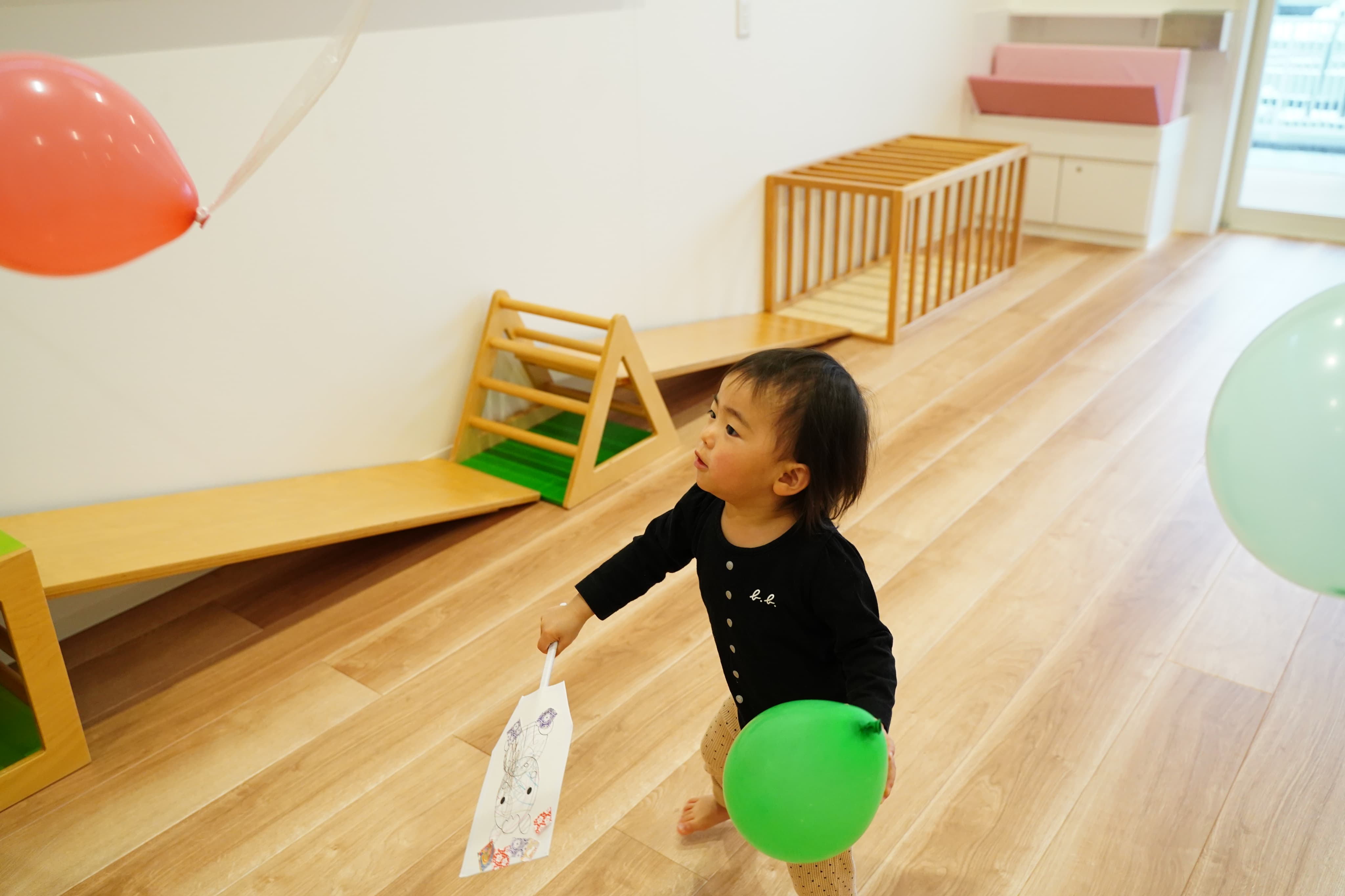 床にある風船もえいっと叩いてみたぼく🎈ポーンと飛び跳ねていくのが面白かったようで、何度も追いかけては叩いていました😊