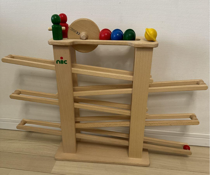 スロープに円盤や玉、人形などをのせると、それぞれのスピードで下へ下へとおりていきます。