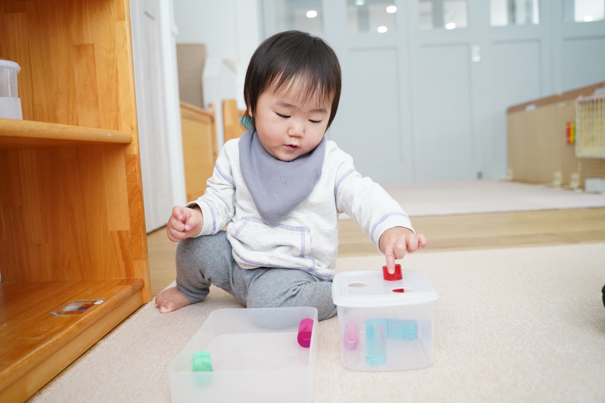 ぼくもプレイキューブ越しの先生やお友達に、ばあ!