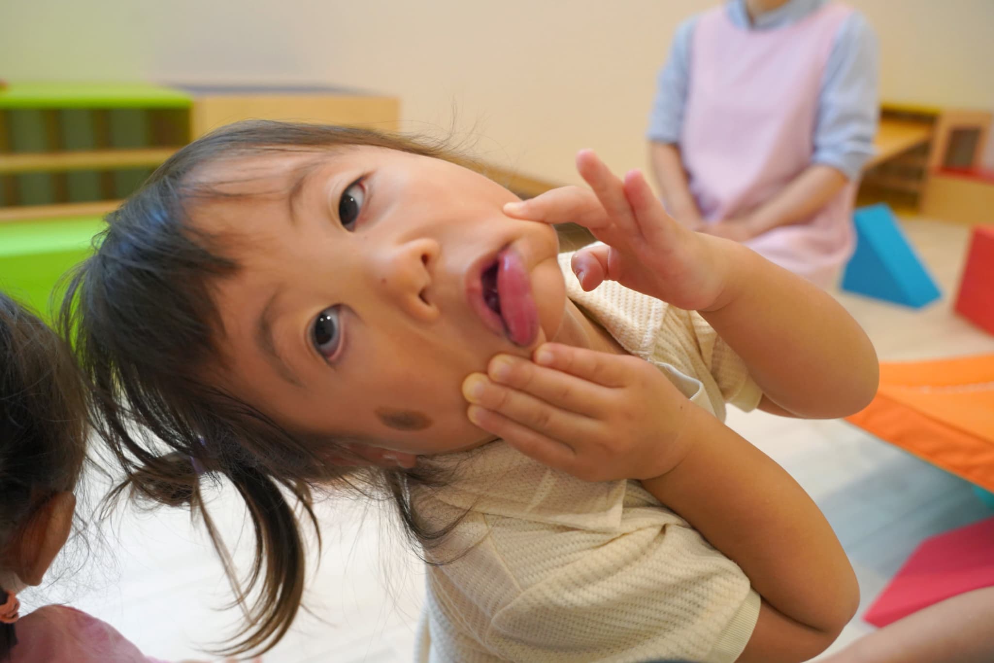 なんとか泣き止んでくれないかな??と優しいお友達が変な顔をして笑わせにきてくれました🥹✨
